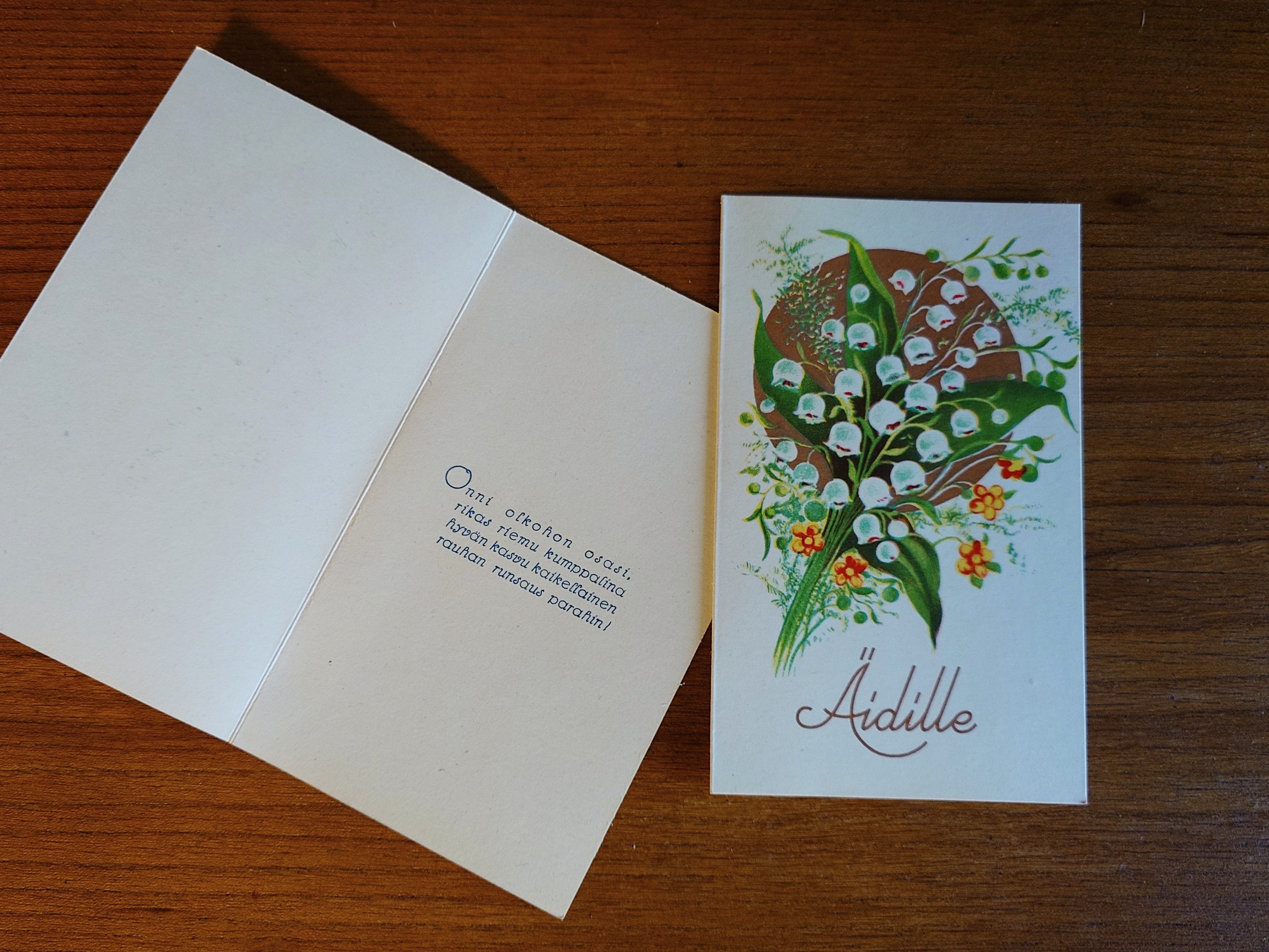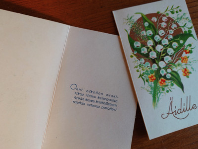 Taitettava vanha kortti äidille. Etusivulla kieloja ja teksti "äidille".