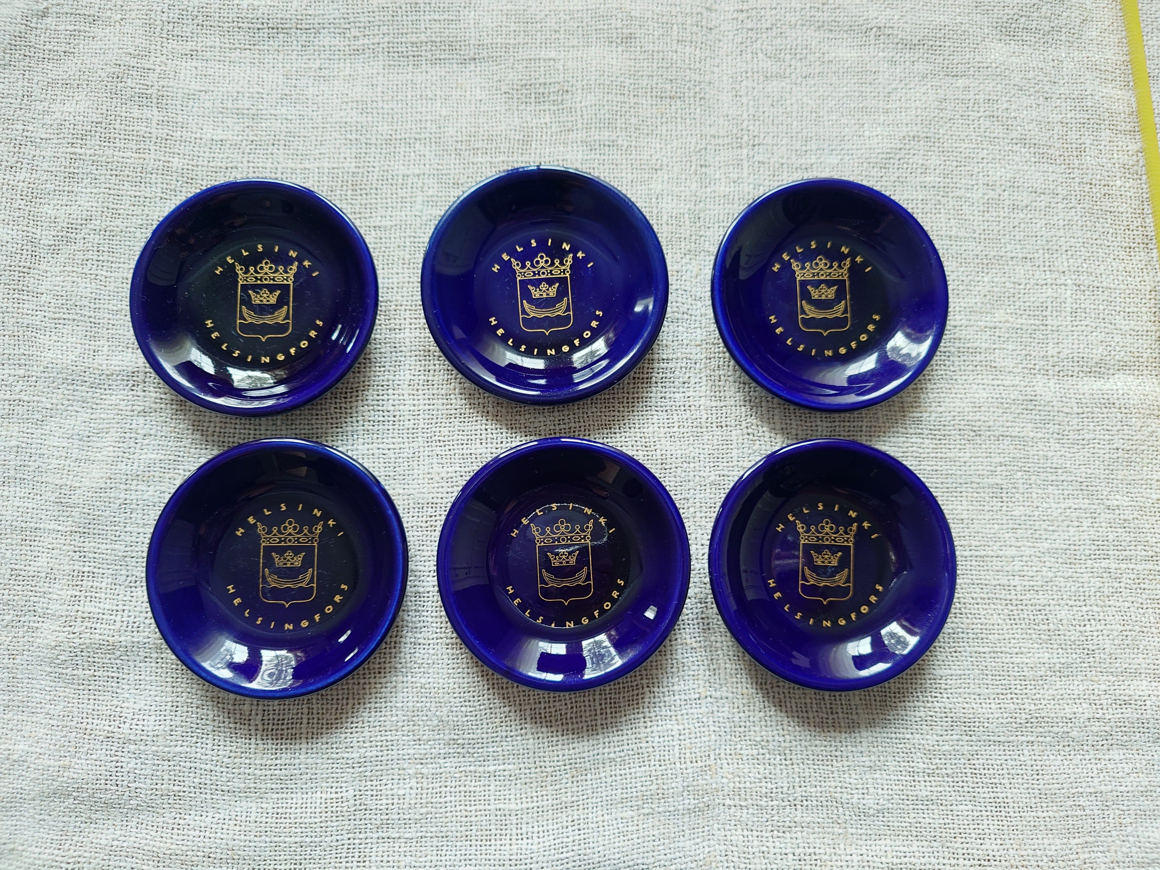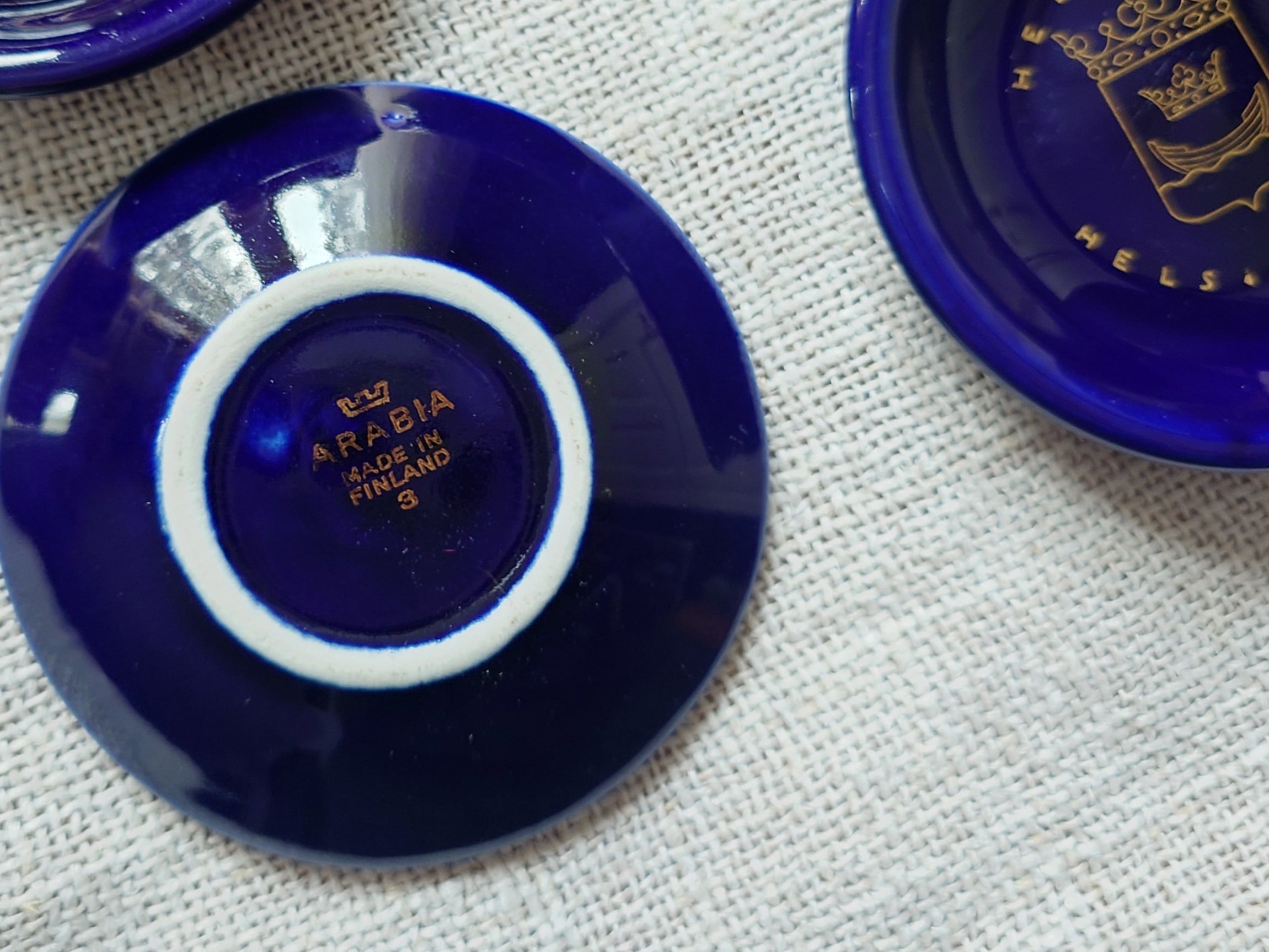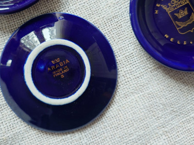Pikkuruinen koboltinsininen koristelautautanen, jossa on kullanvärinen Helsingin vaakuna ja lukee Helsinki Helsingfors.