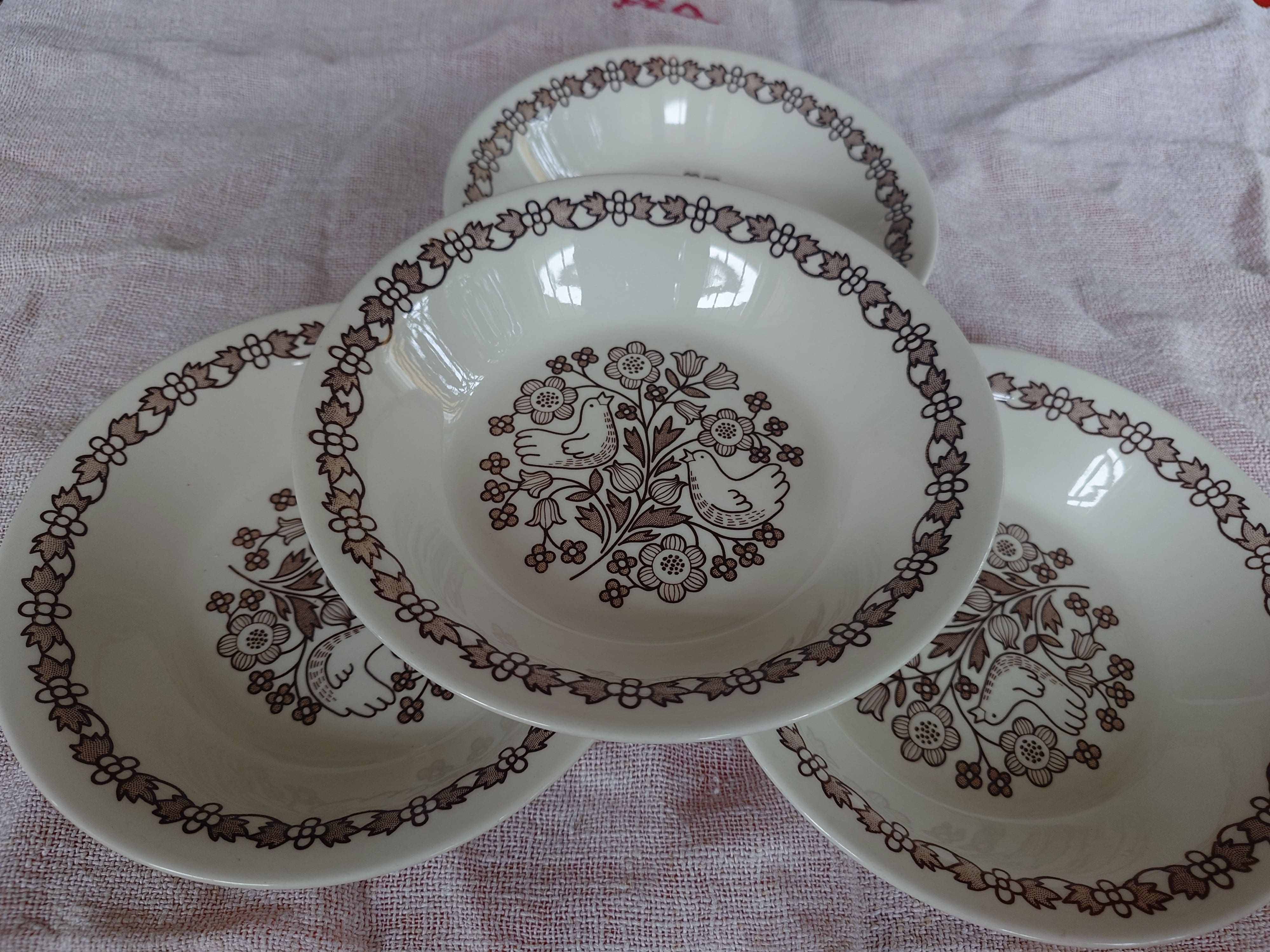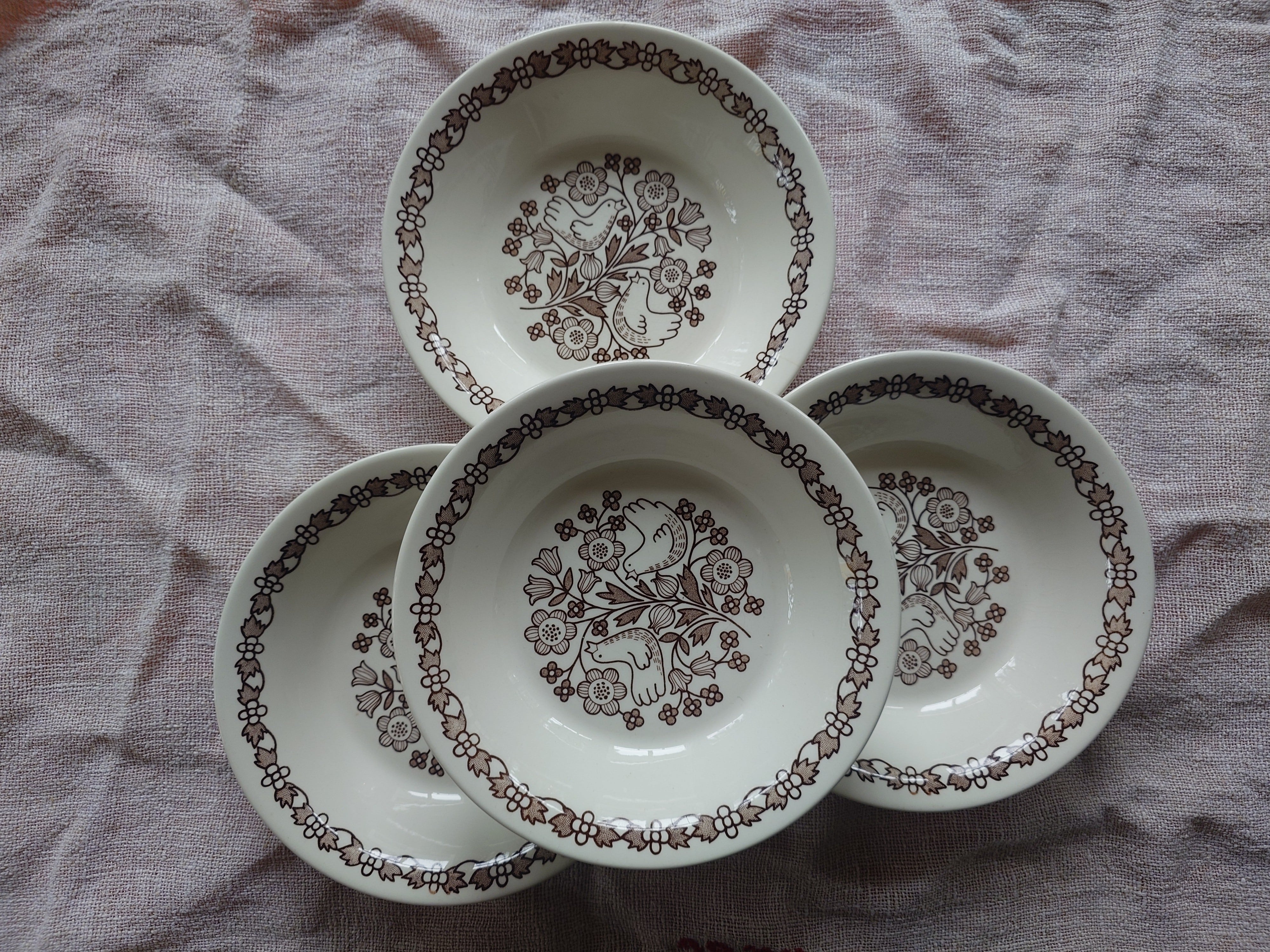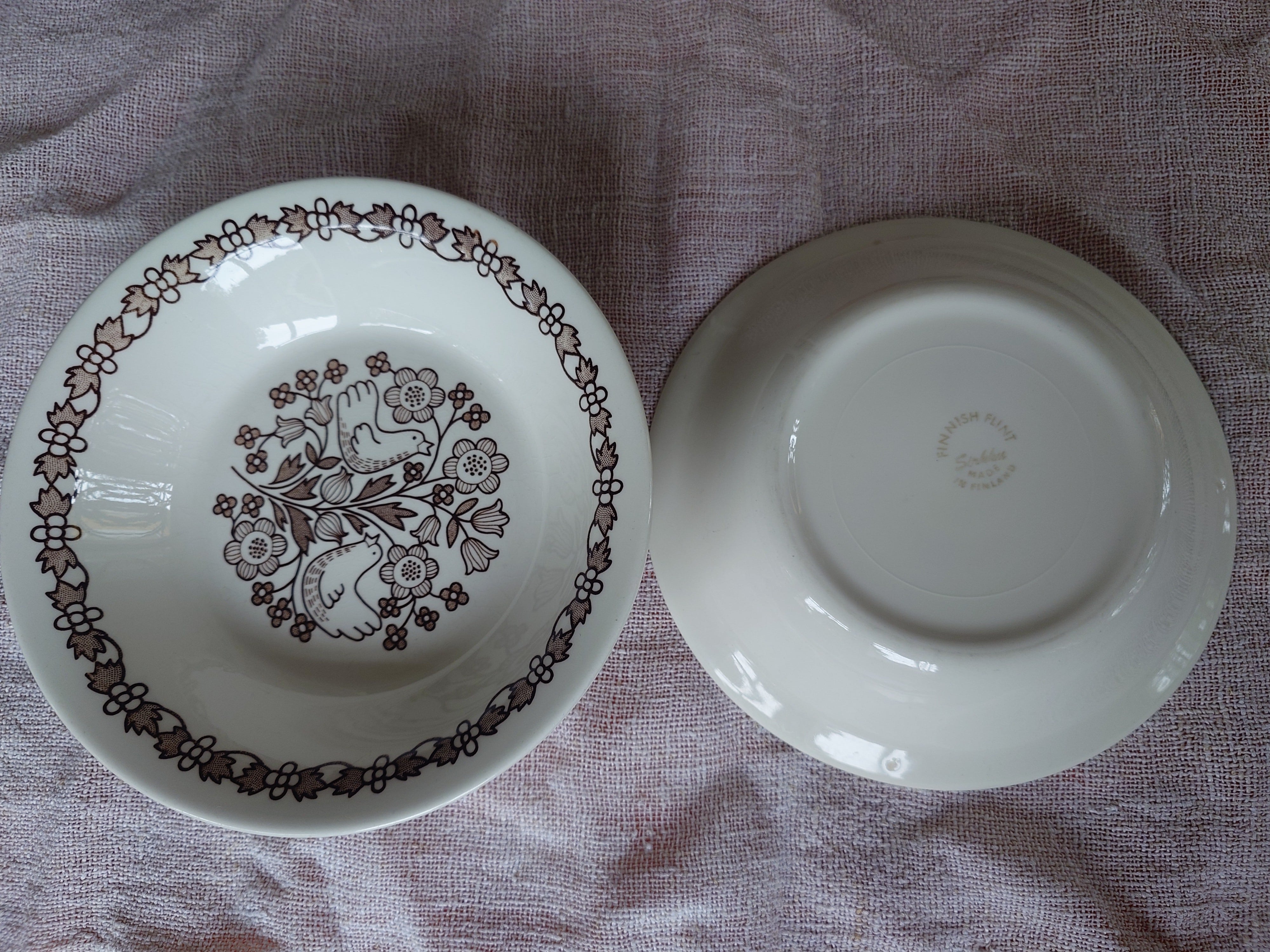 1970-luvun retro syvä lautanen. Lintu ja kukkakuvioita