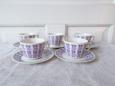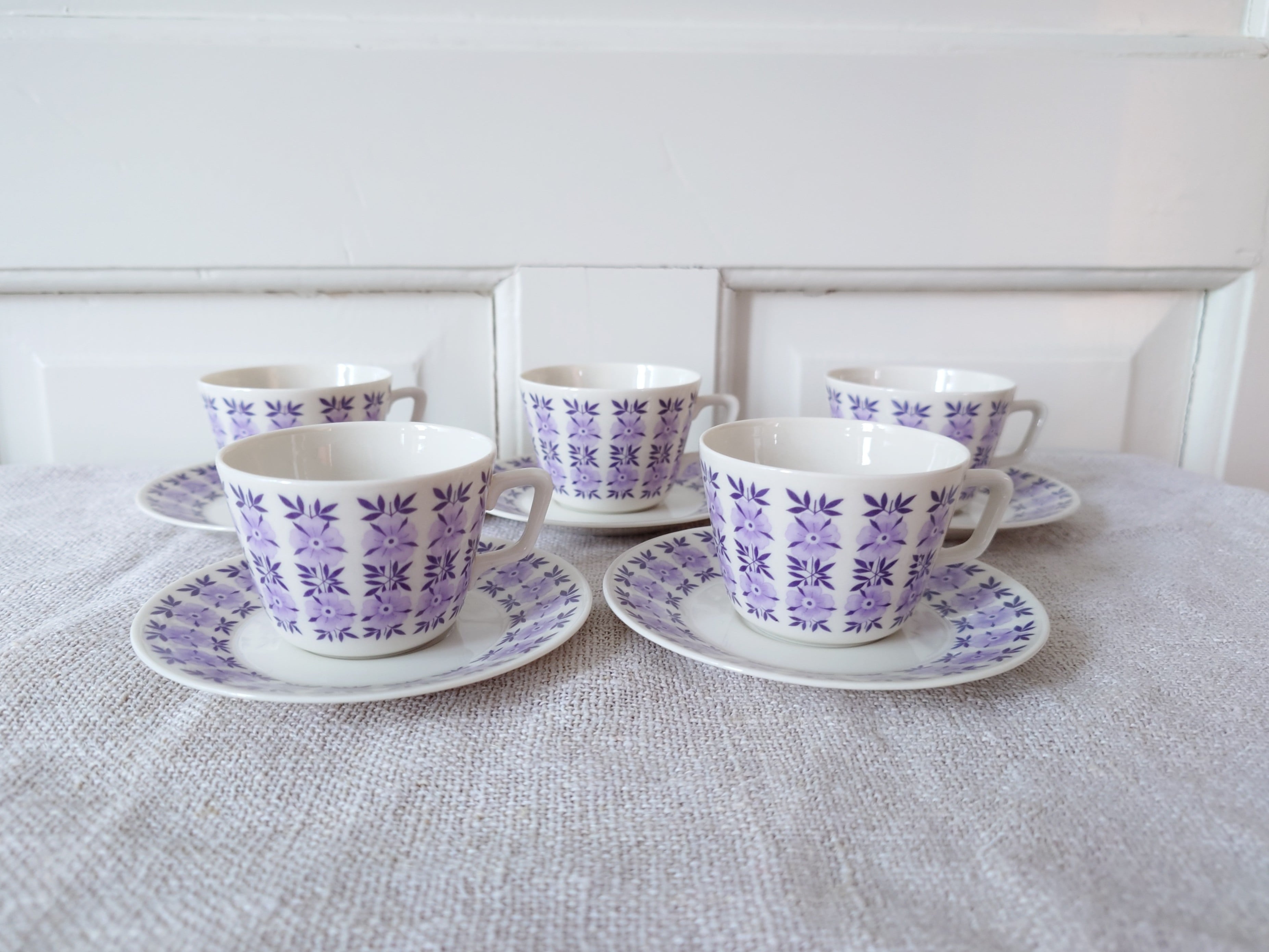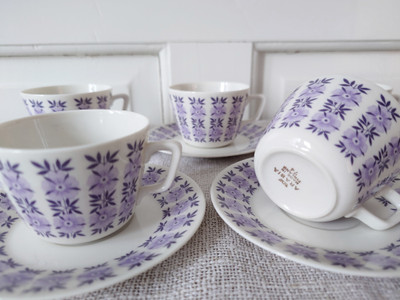 1960-luvun pienet kahvikupit, joissa on herkkä vaalean lila kukkakuvio.