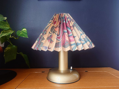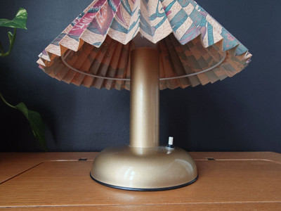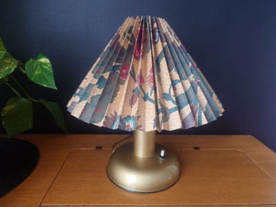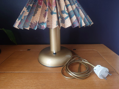 Lamppu on hyväkuntoinen, ehjä ja toimiva. Painettava kytkin jalan päällä. Vanhanmallinen pistoke.