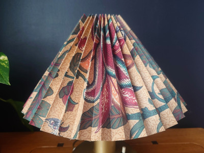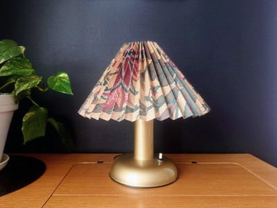 Kukkakuvioinen varjostin, jossa on metallinen jalka. Jalassa on kaunis metallinhohtoinen kullanvärinen maalipinta.