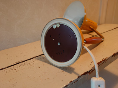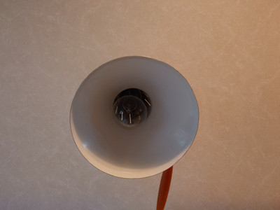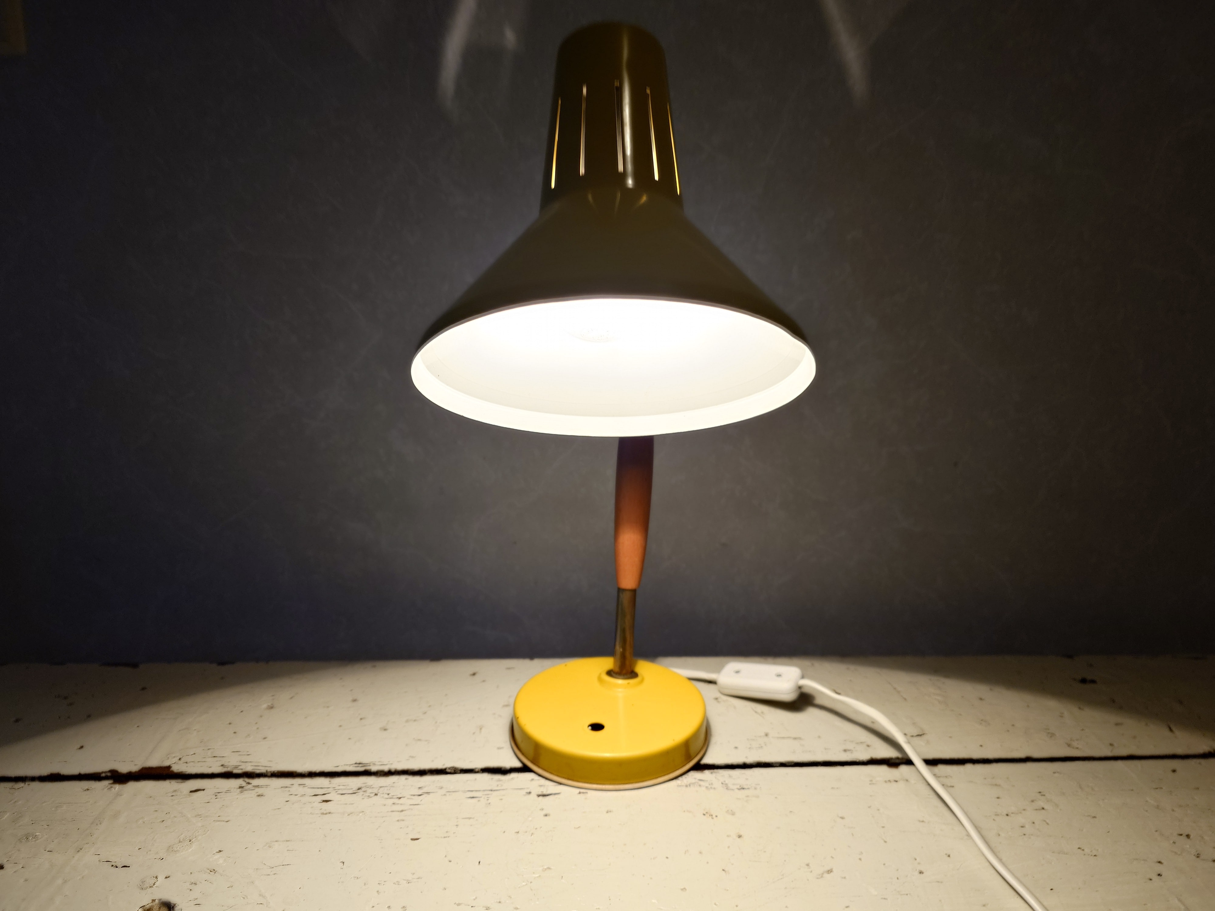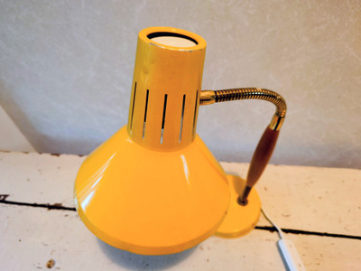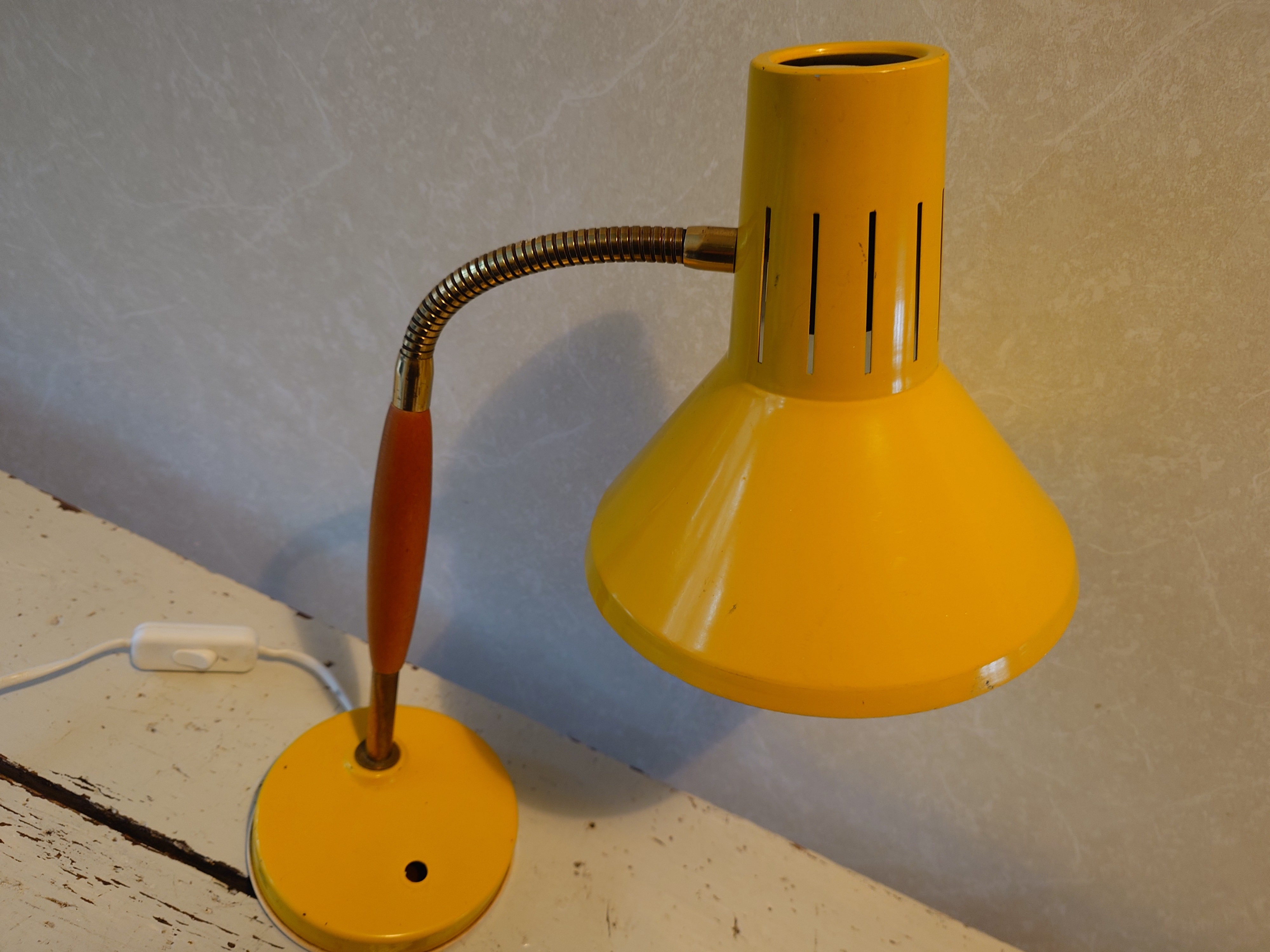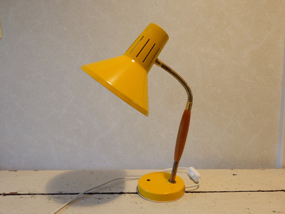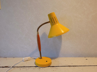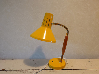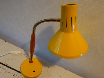 Tyylikäs 1960-luvun pöytälamppu. Hehkuva keltainen valopilkku. Puolet varresta on tiikkiä ja toinen puoli taipuisaa metallia. Kuvun asentoa voi säätää oman mielen mukaan.