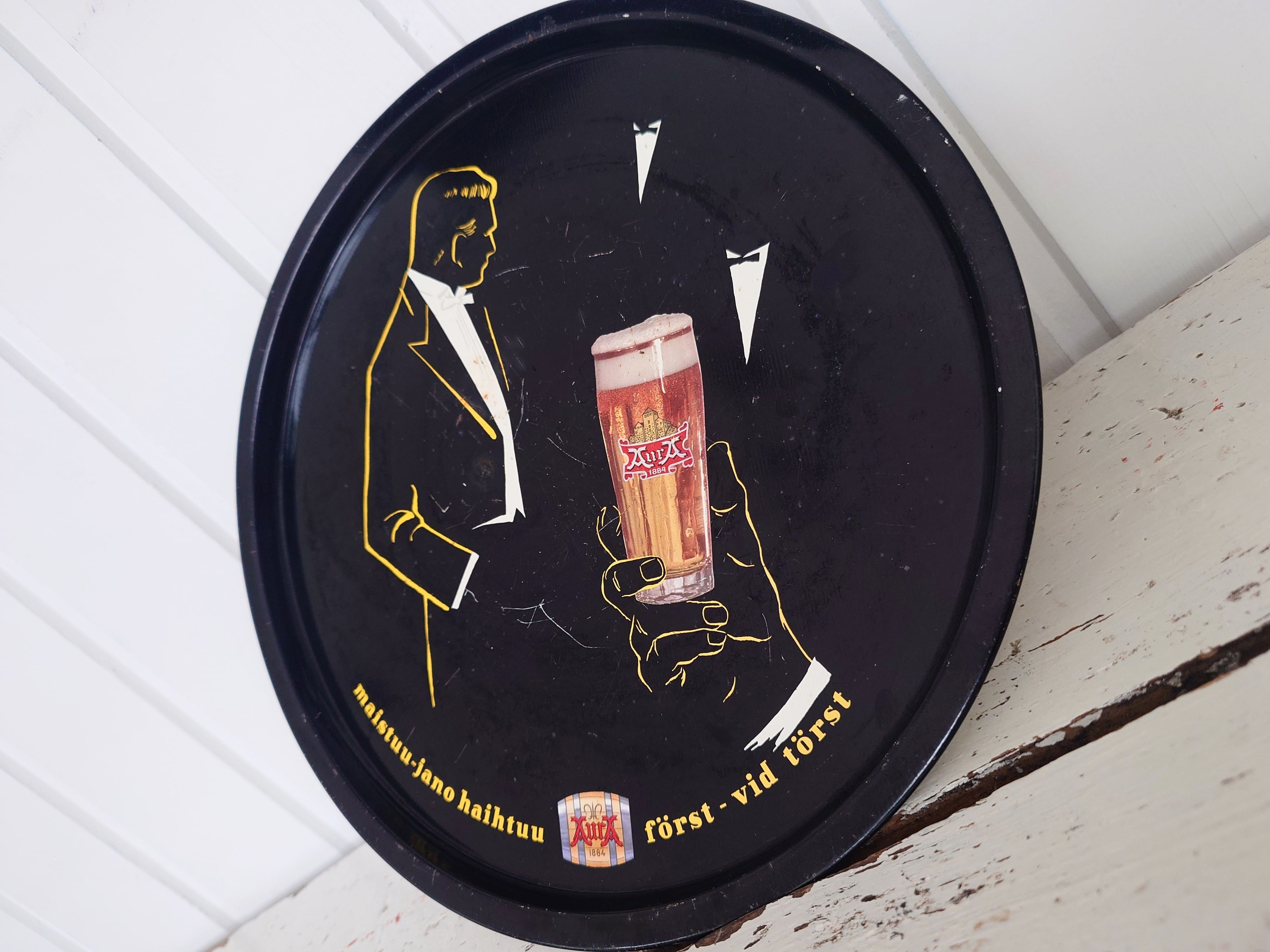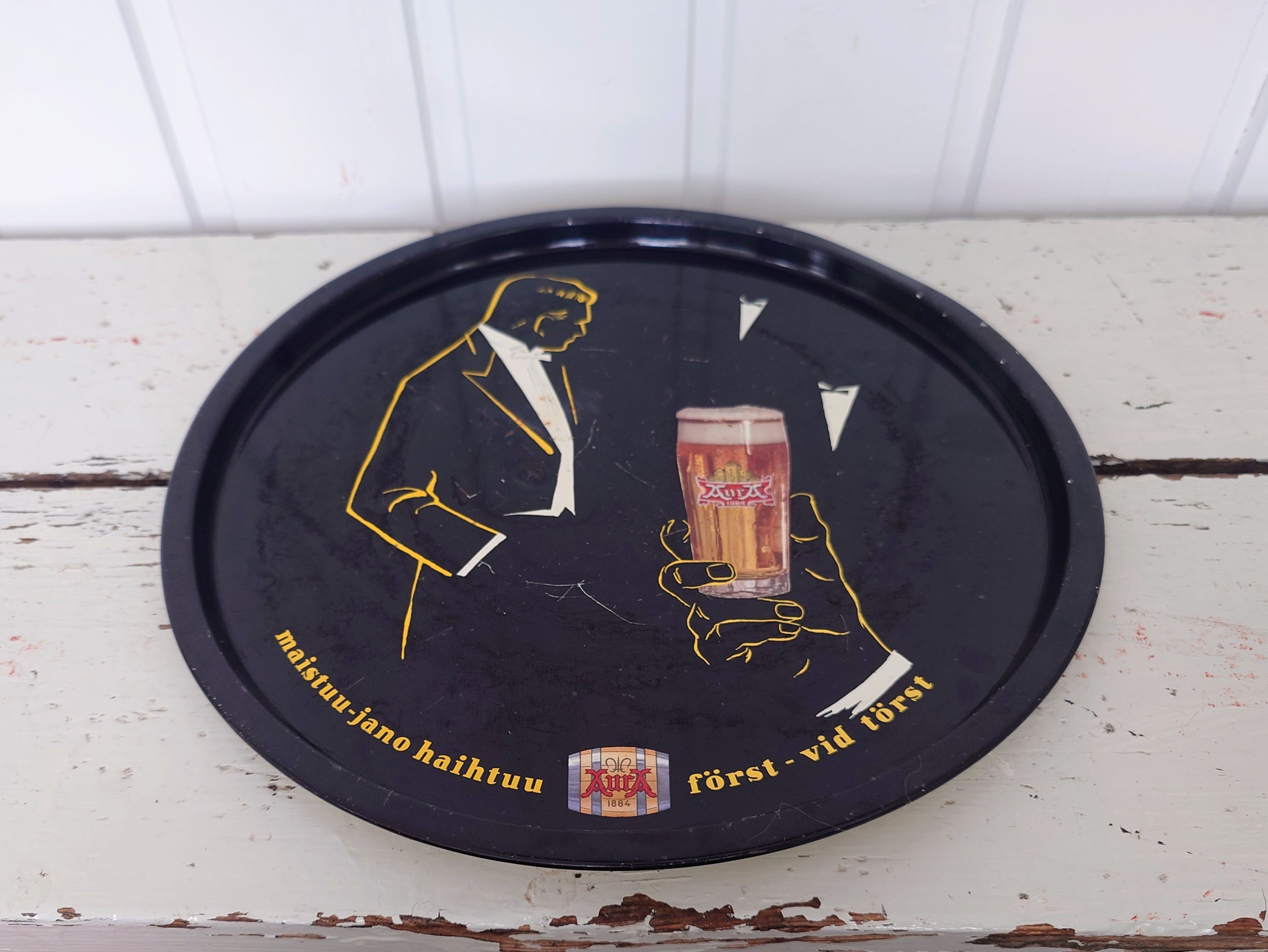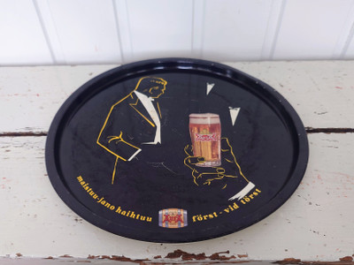 Peltinen vanha tarjotin rekvisiitaksi vaikka kotibaariin.