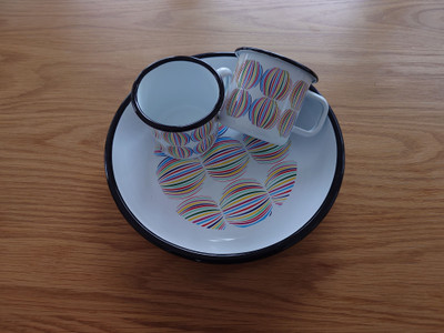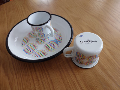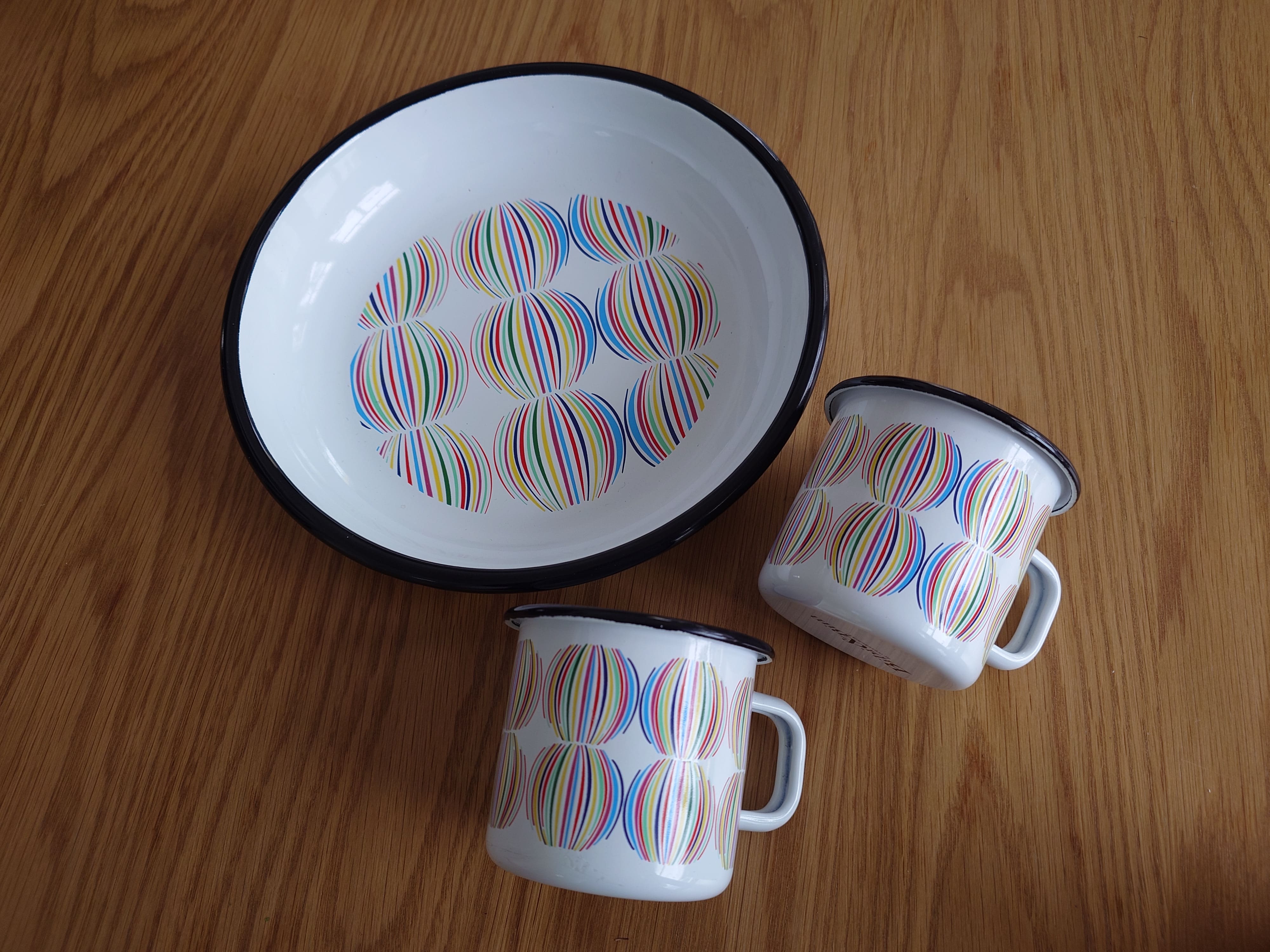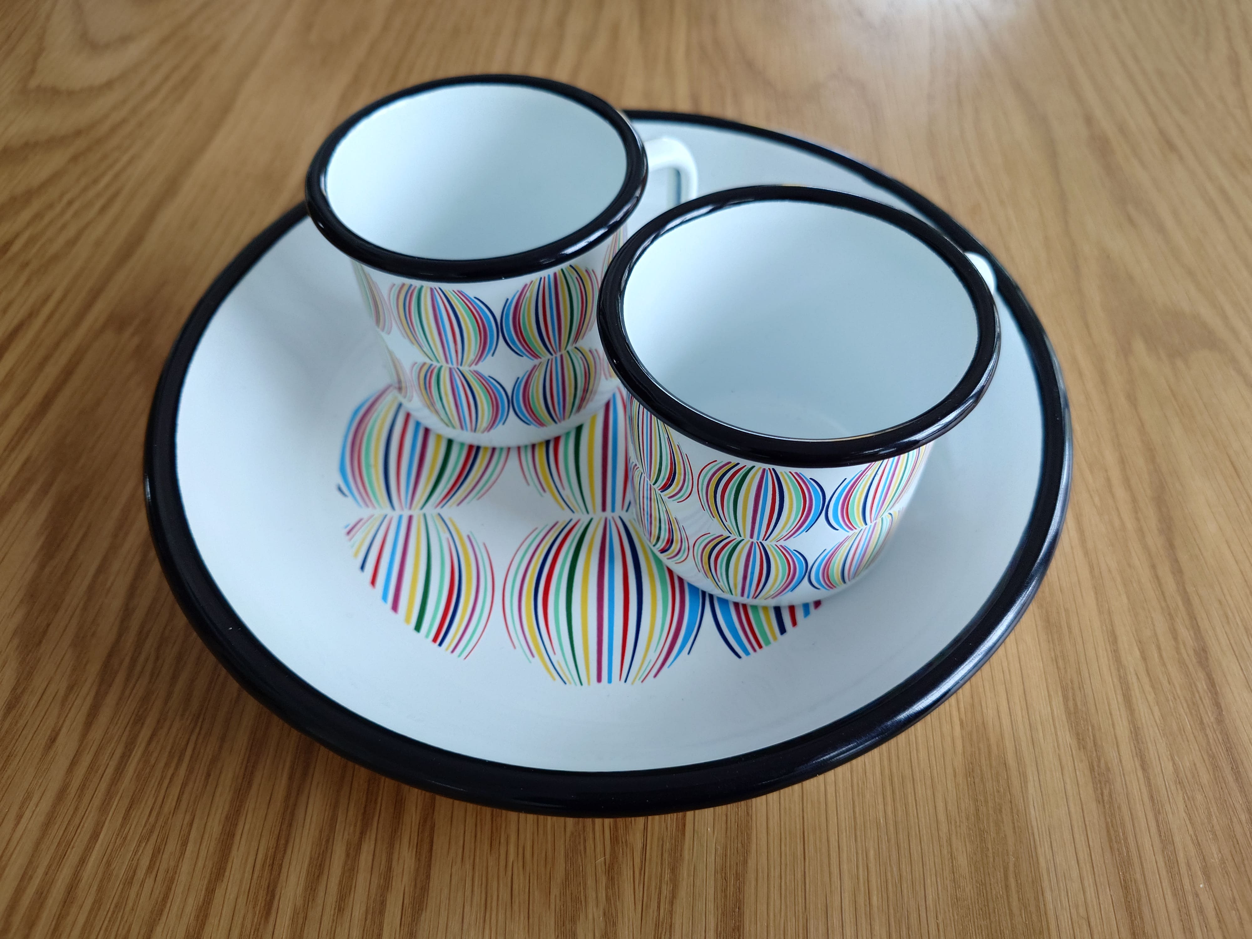 Kiva emalisetti, jossa on kaksi mukia ja tarjoilulautanen.