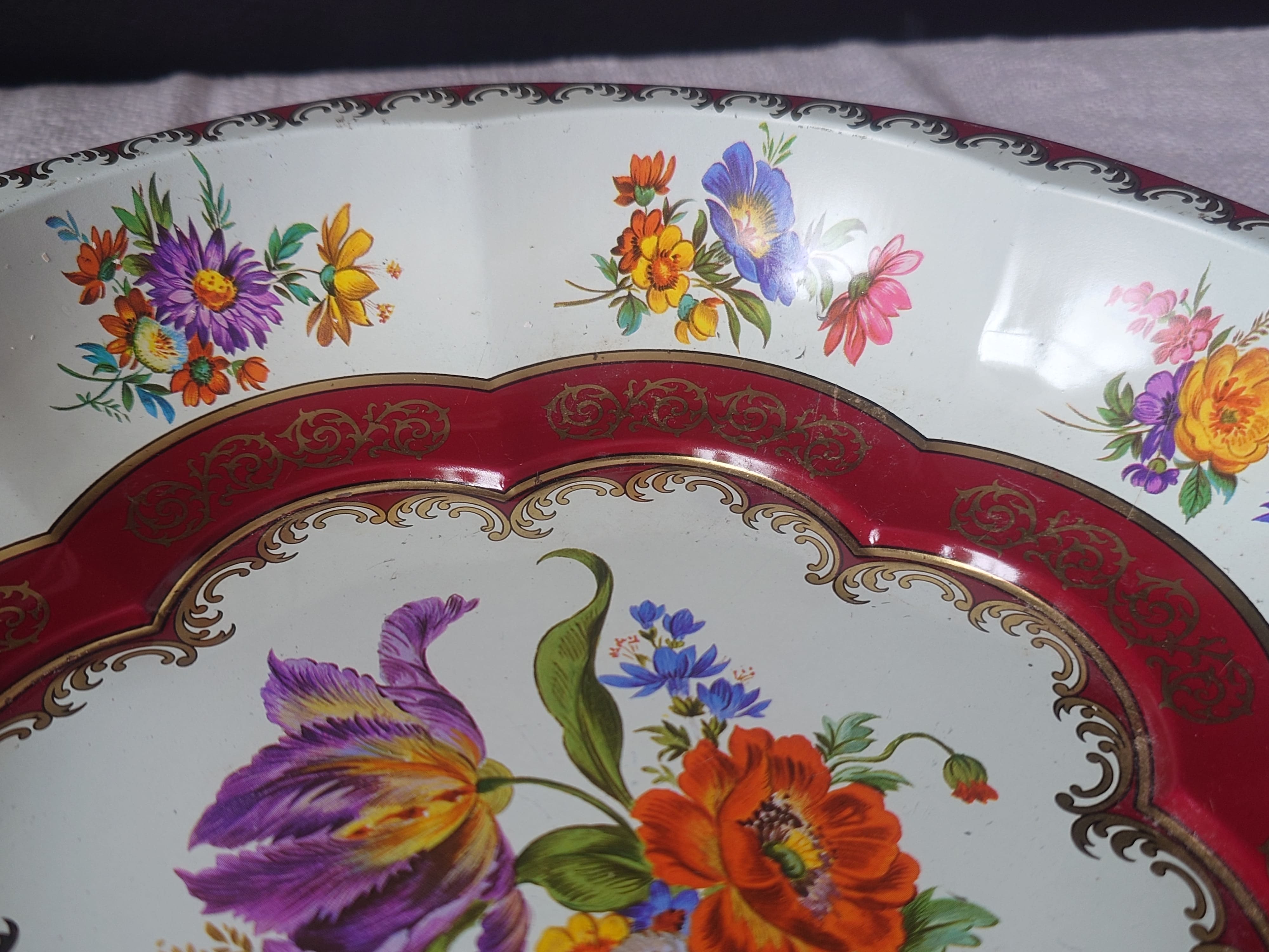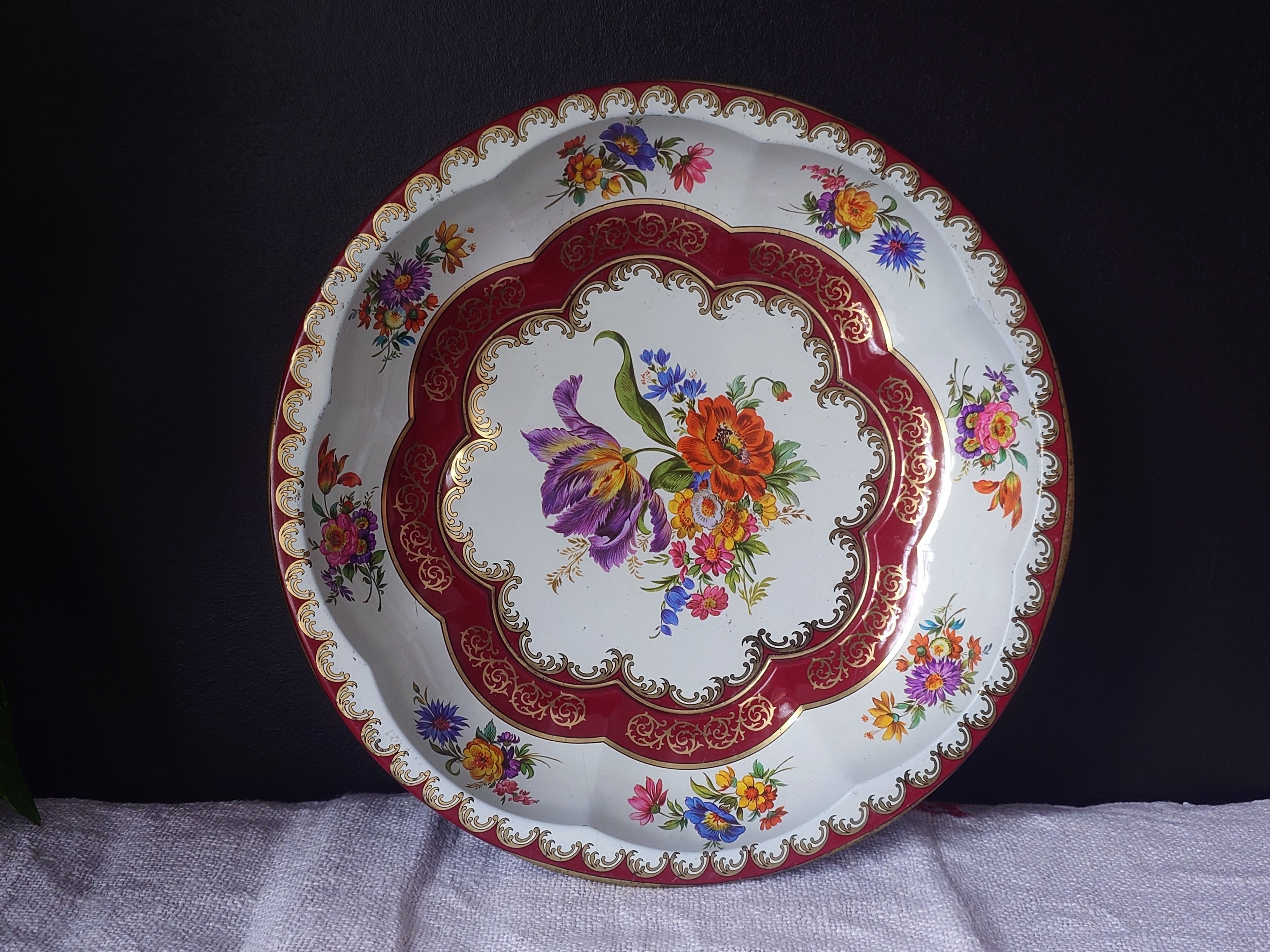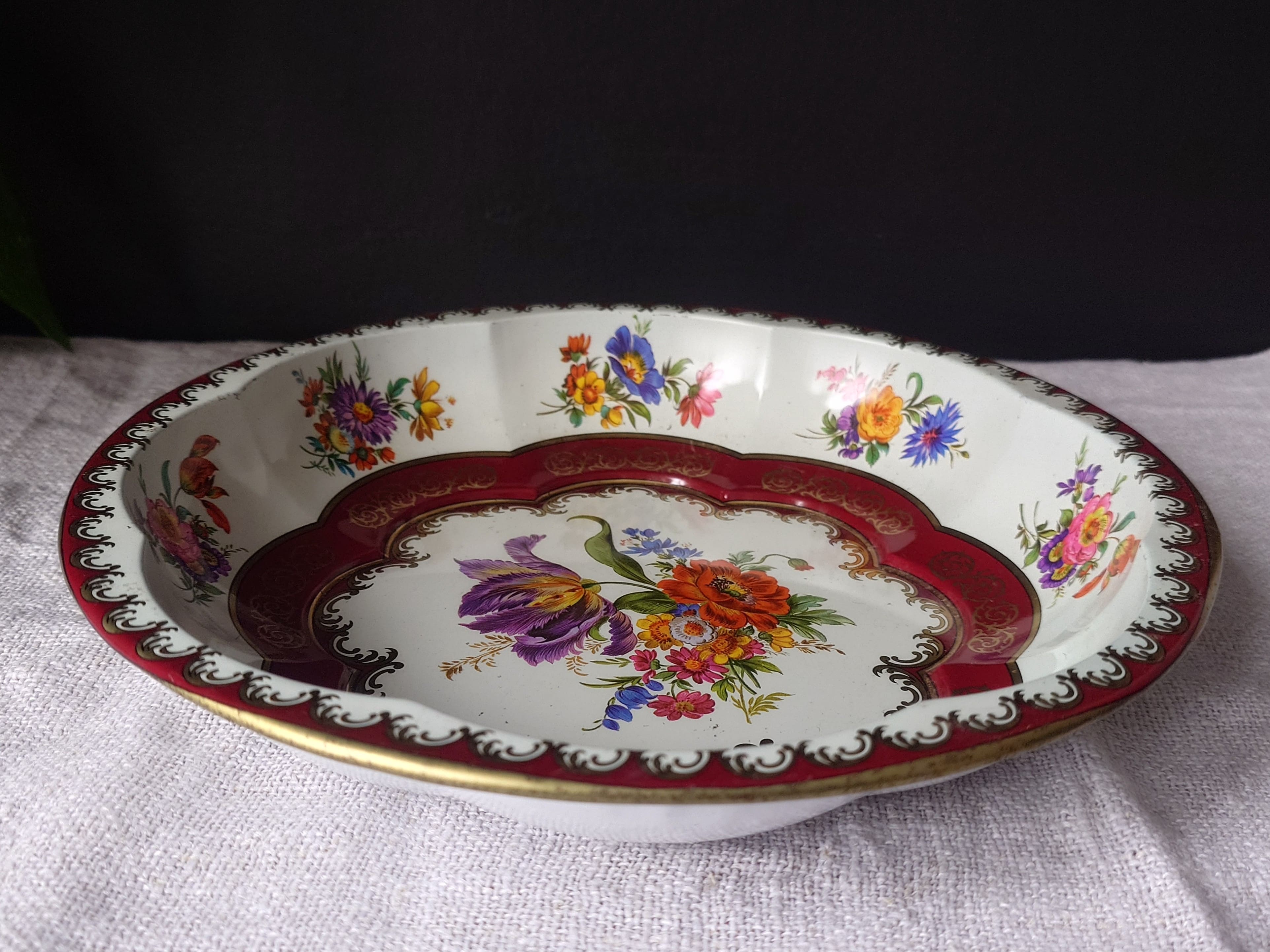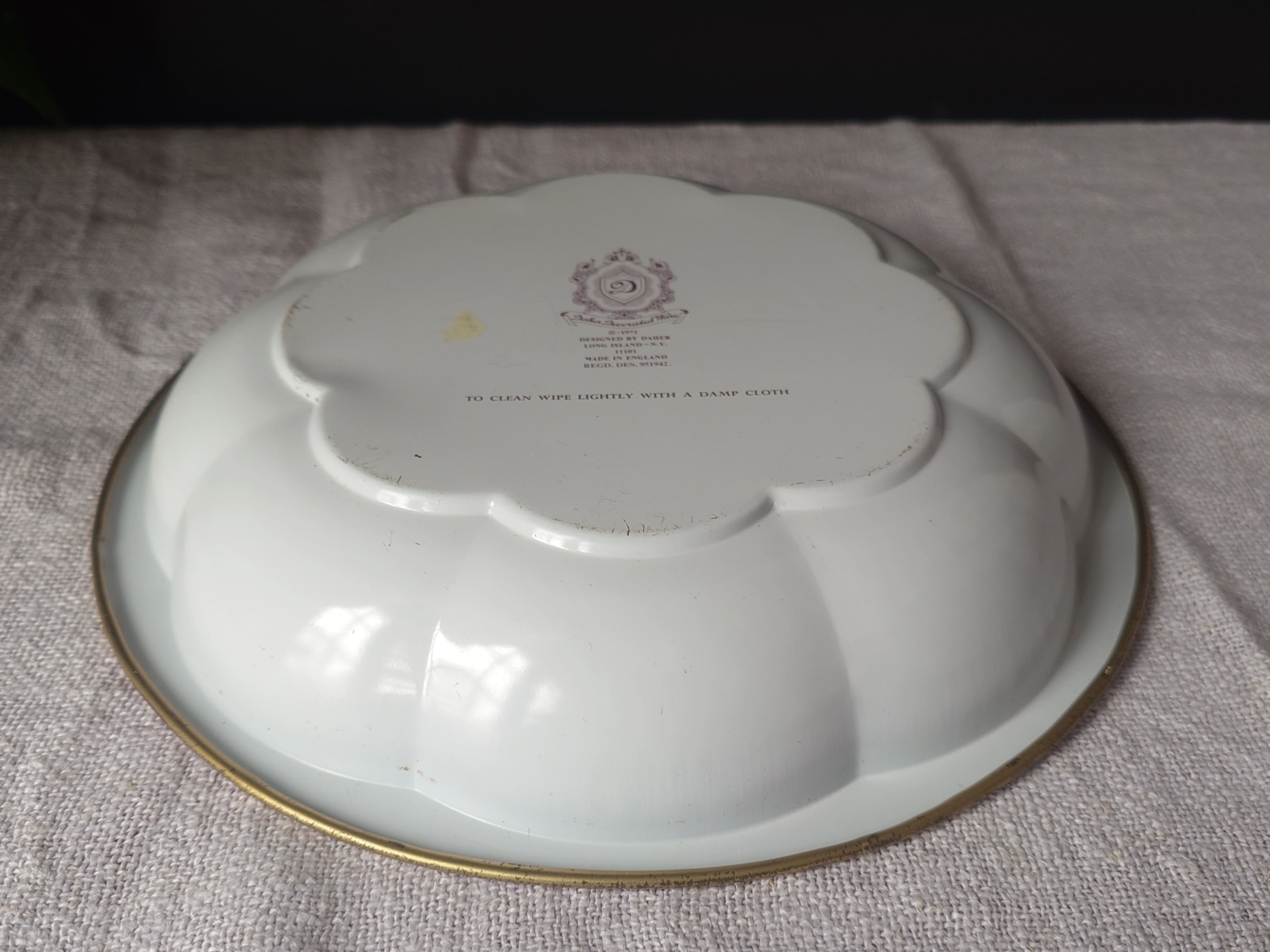Hieno peltinen laakea kulho vuodelta 1971. Kukkapainatus ja kullanväristä koristelua. Valmistaja Daher England.