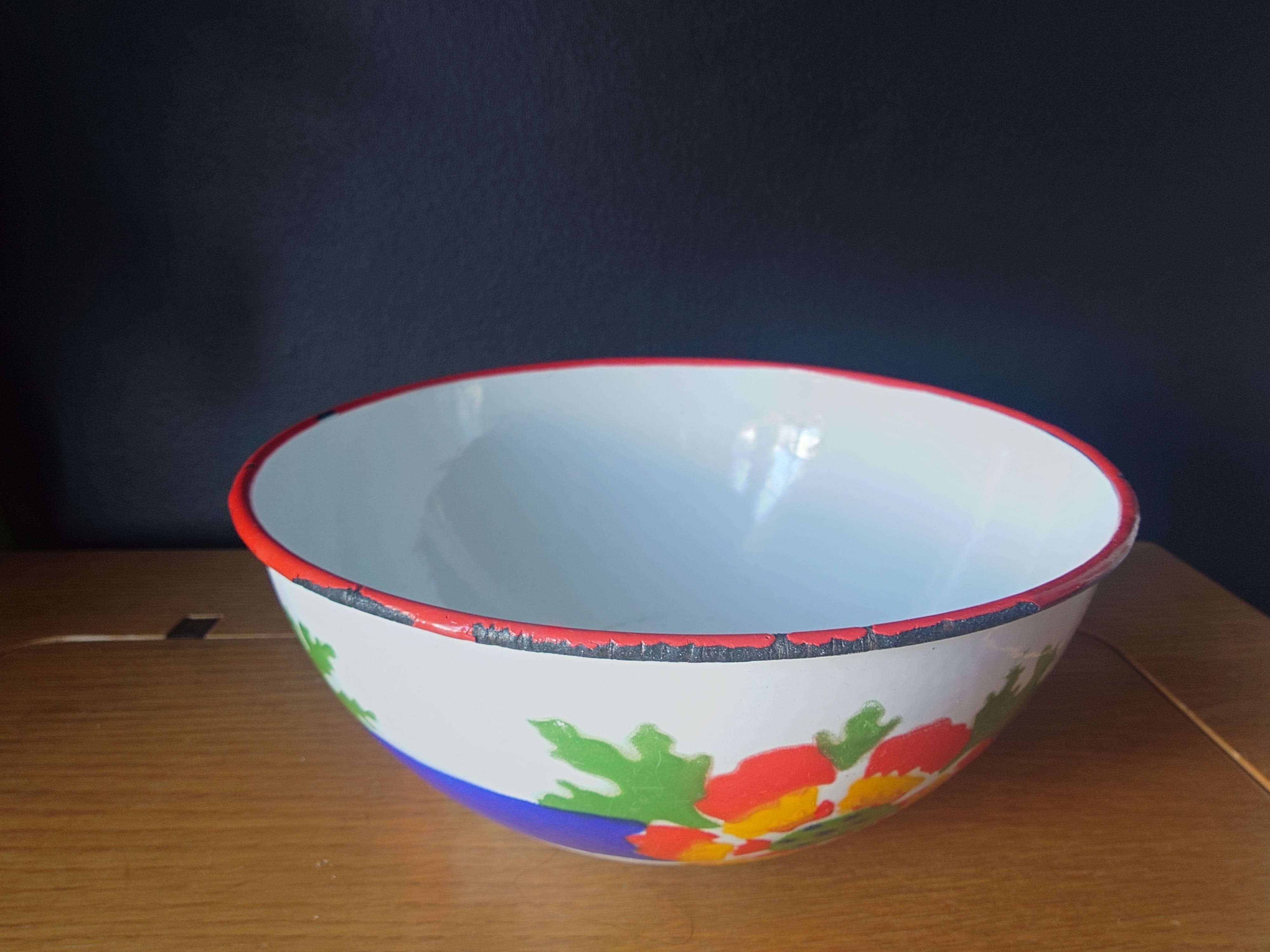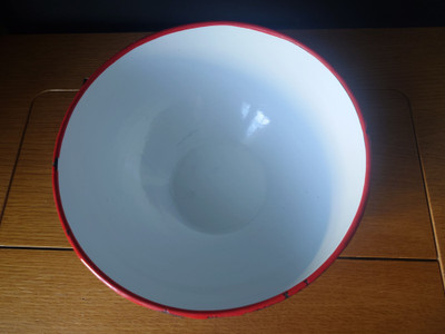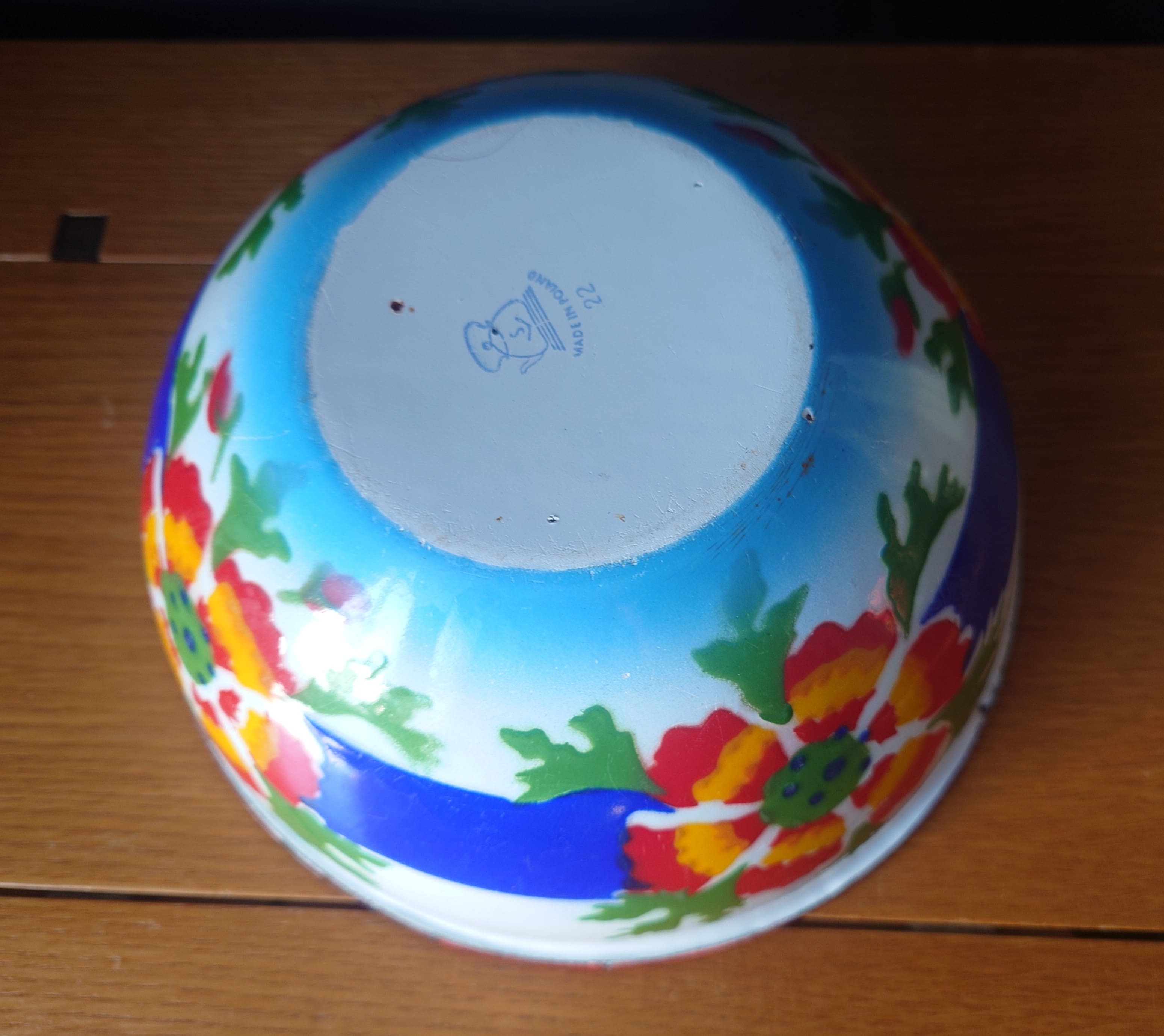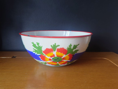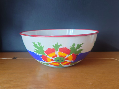 Vanha emaloitu metallikulho. Made on Poland.