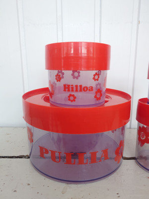 Isossa purkissa teksti Pullia. Seuraavassa on teksti Hilloa. Näissä muovi on hieman sinertävää.