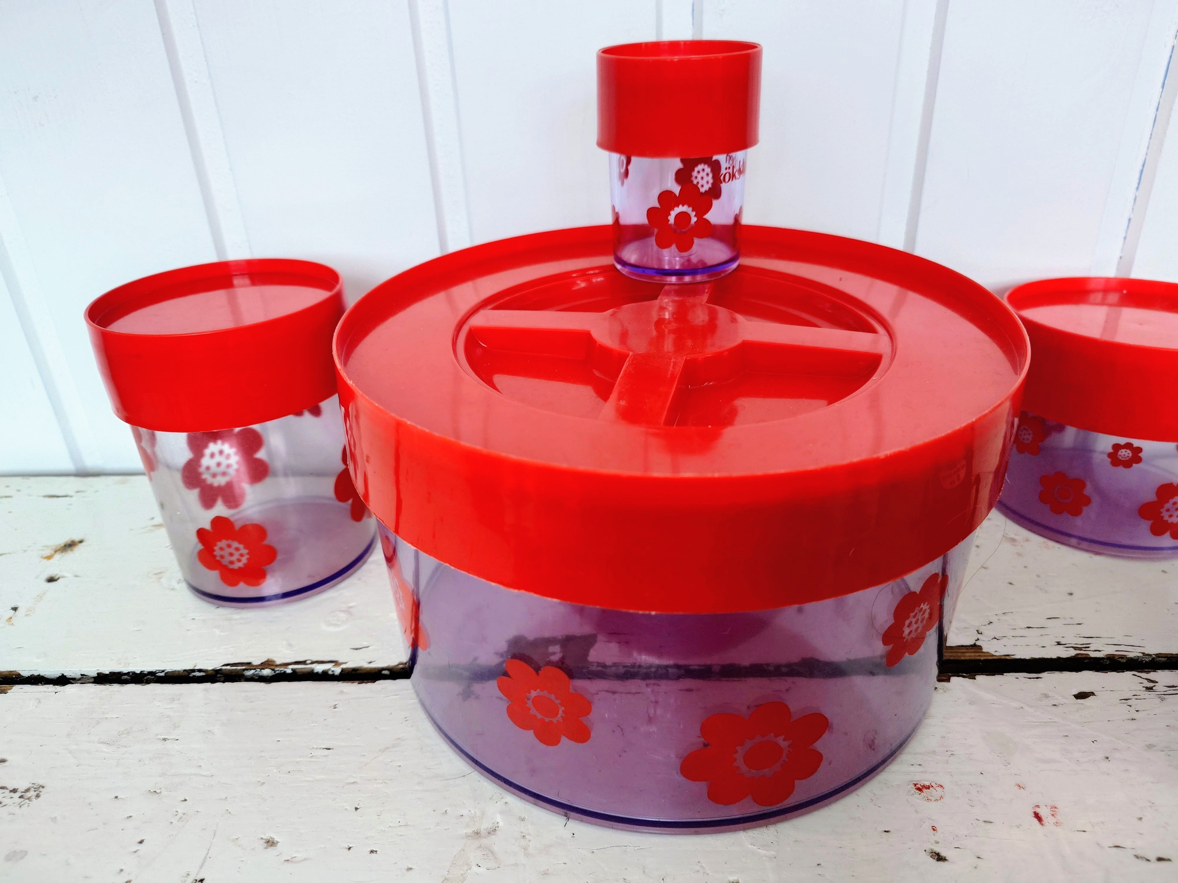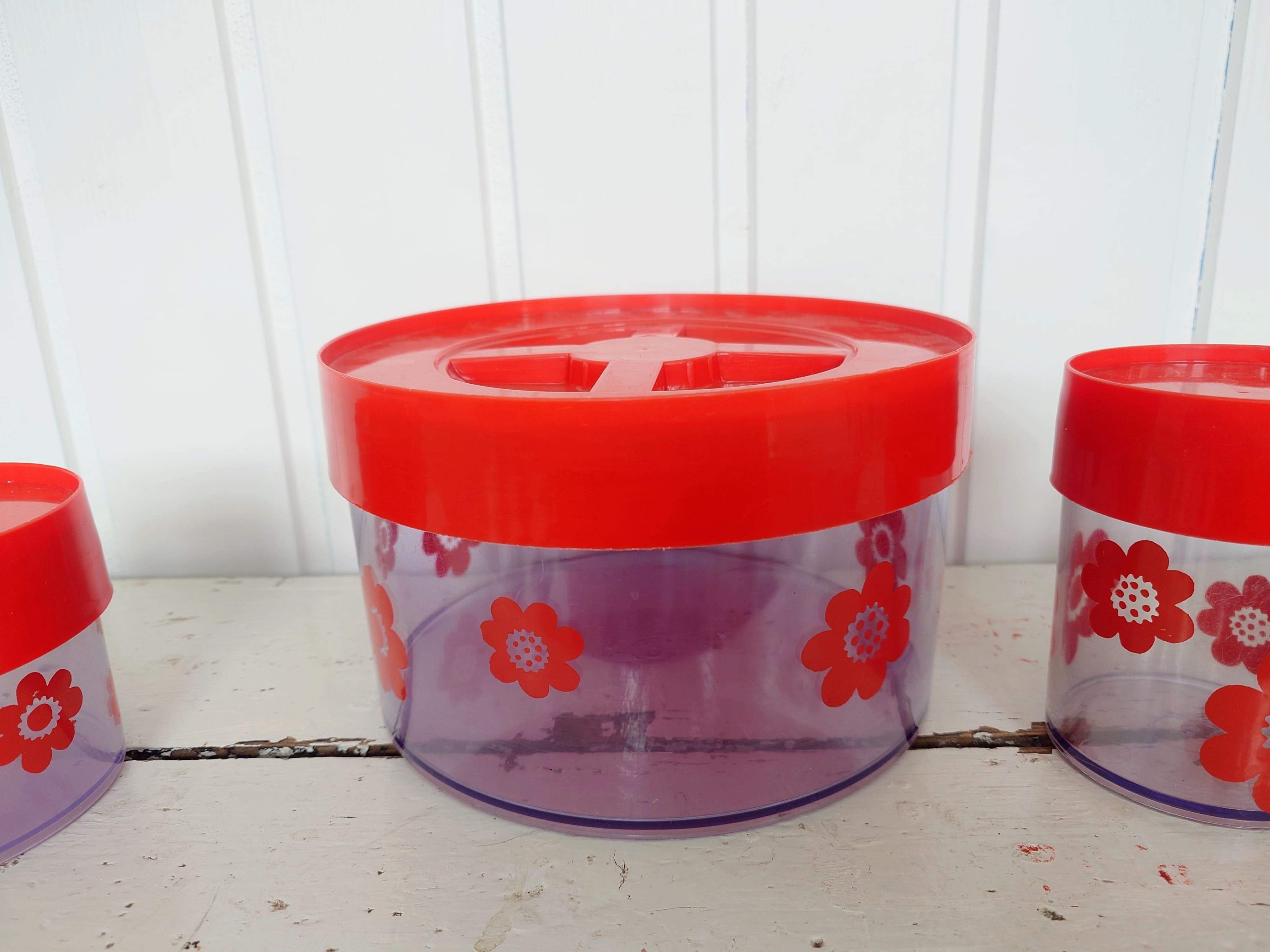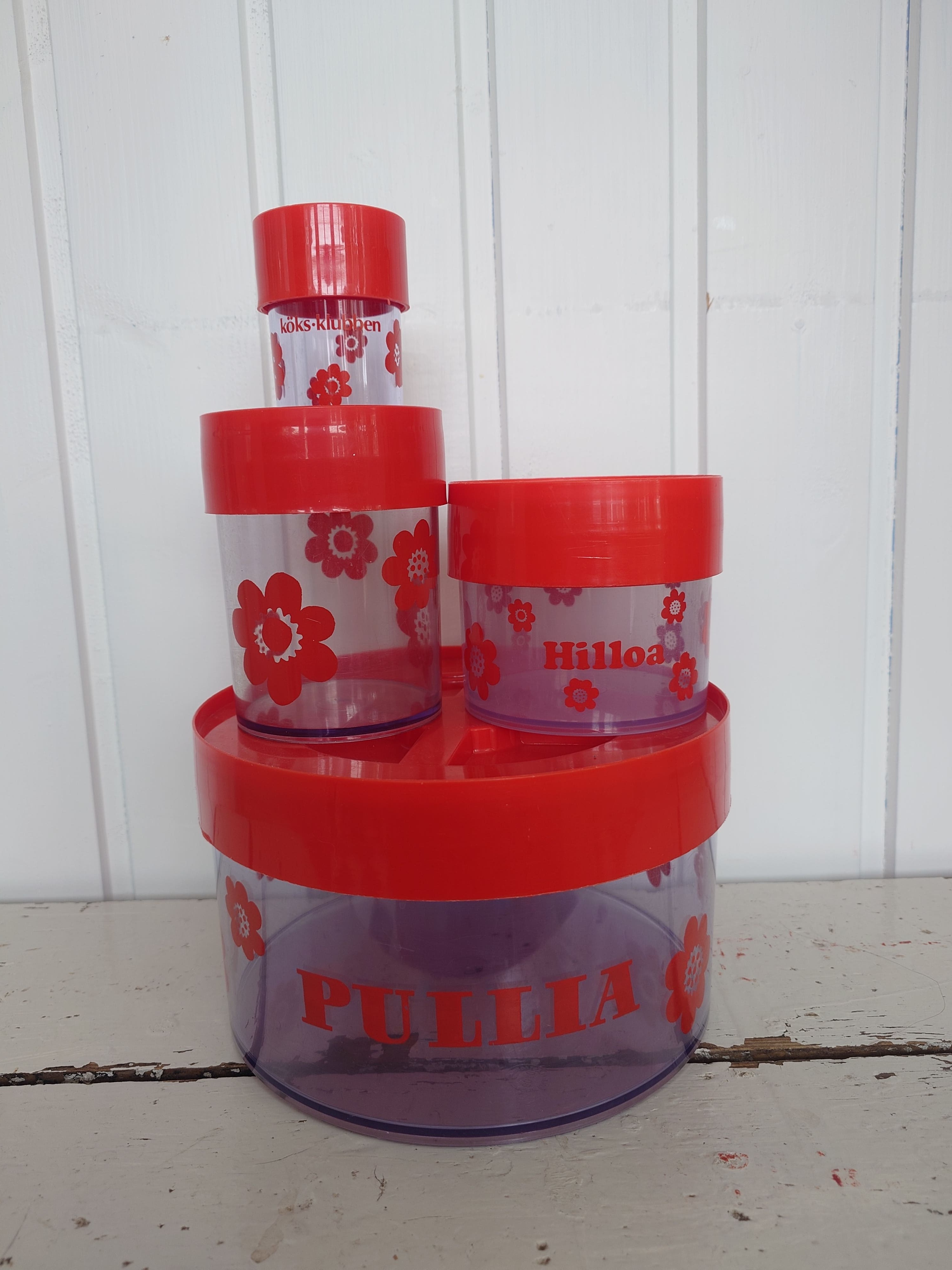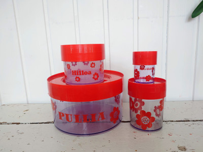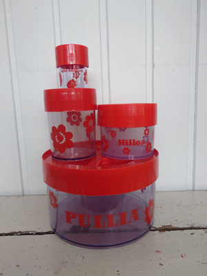 Retrot tanskalaiset kukkakuvioset muovipurkit 1970-luvulta.