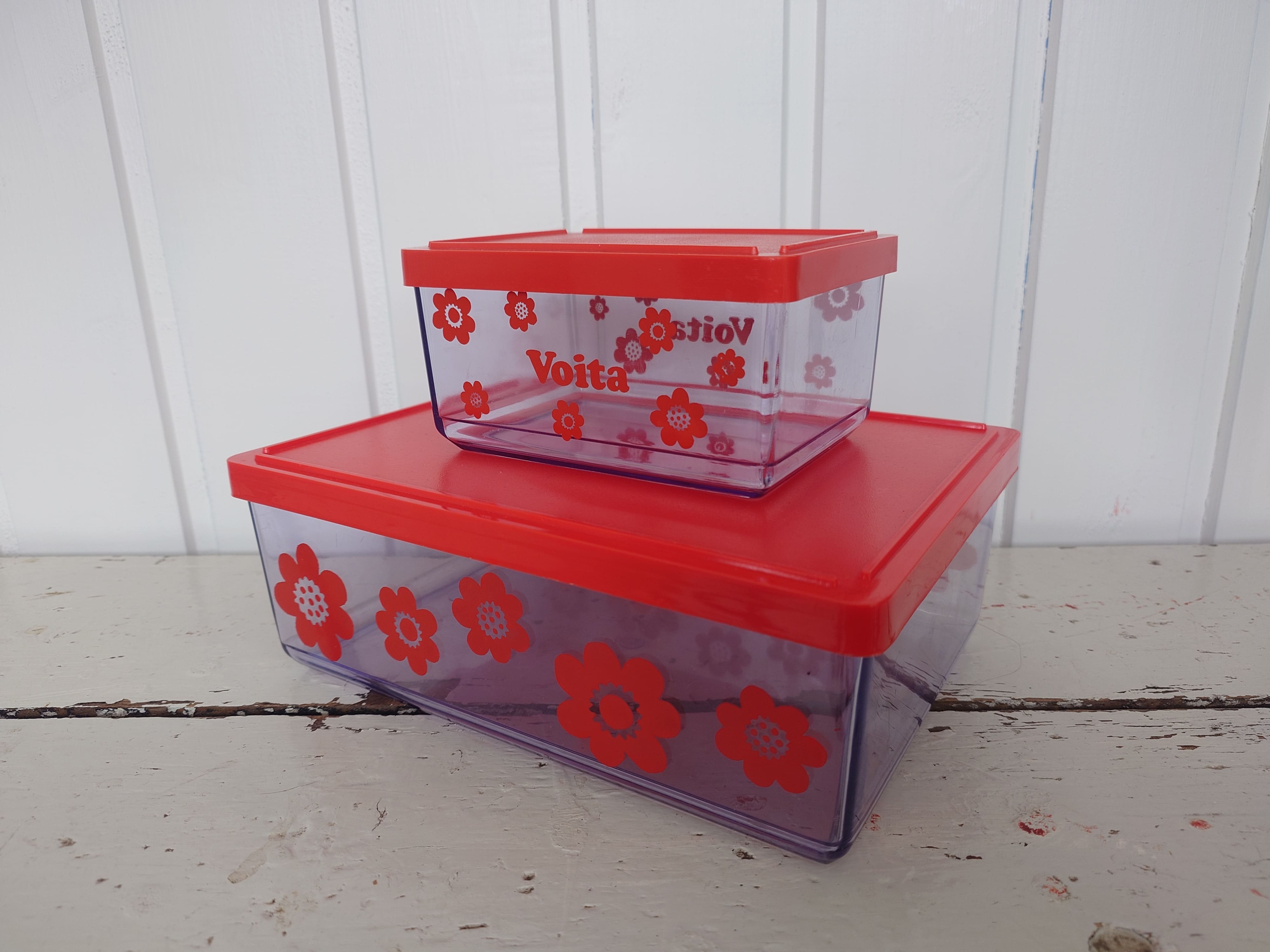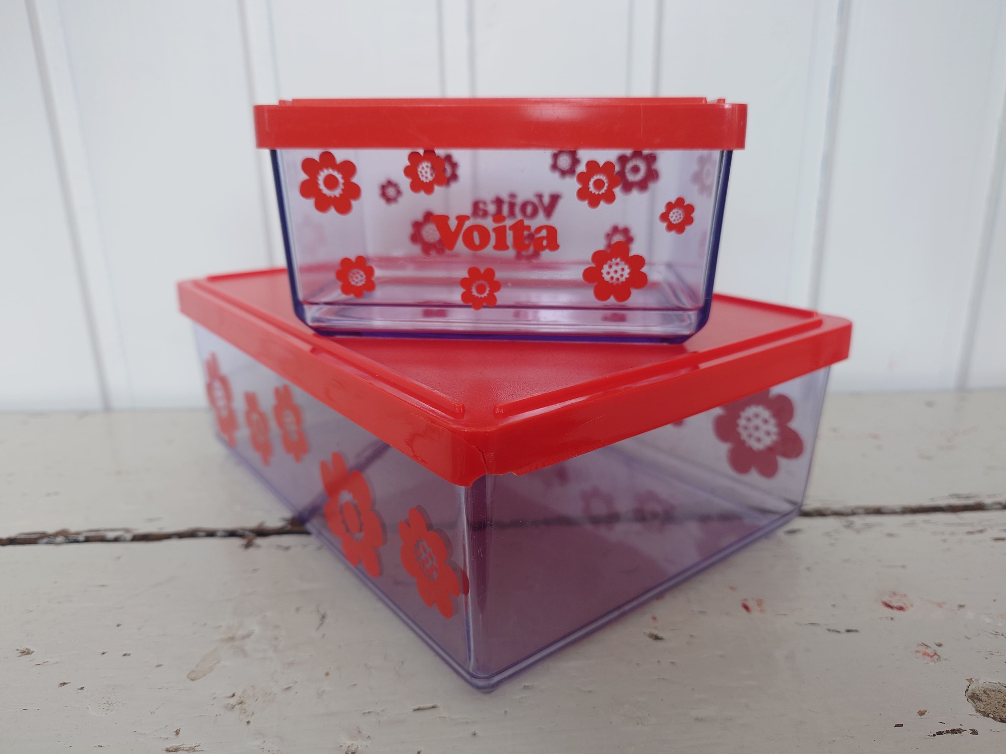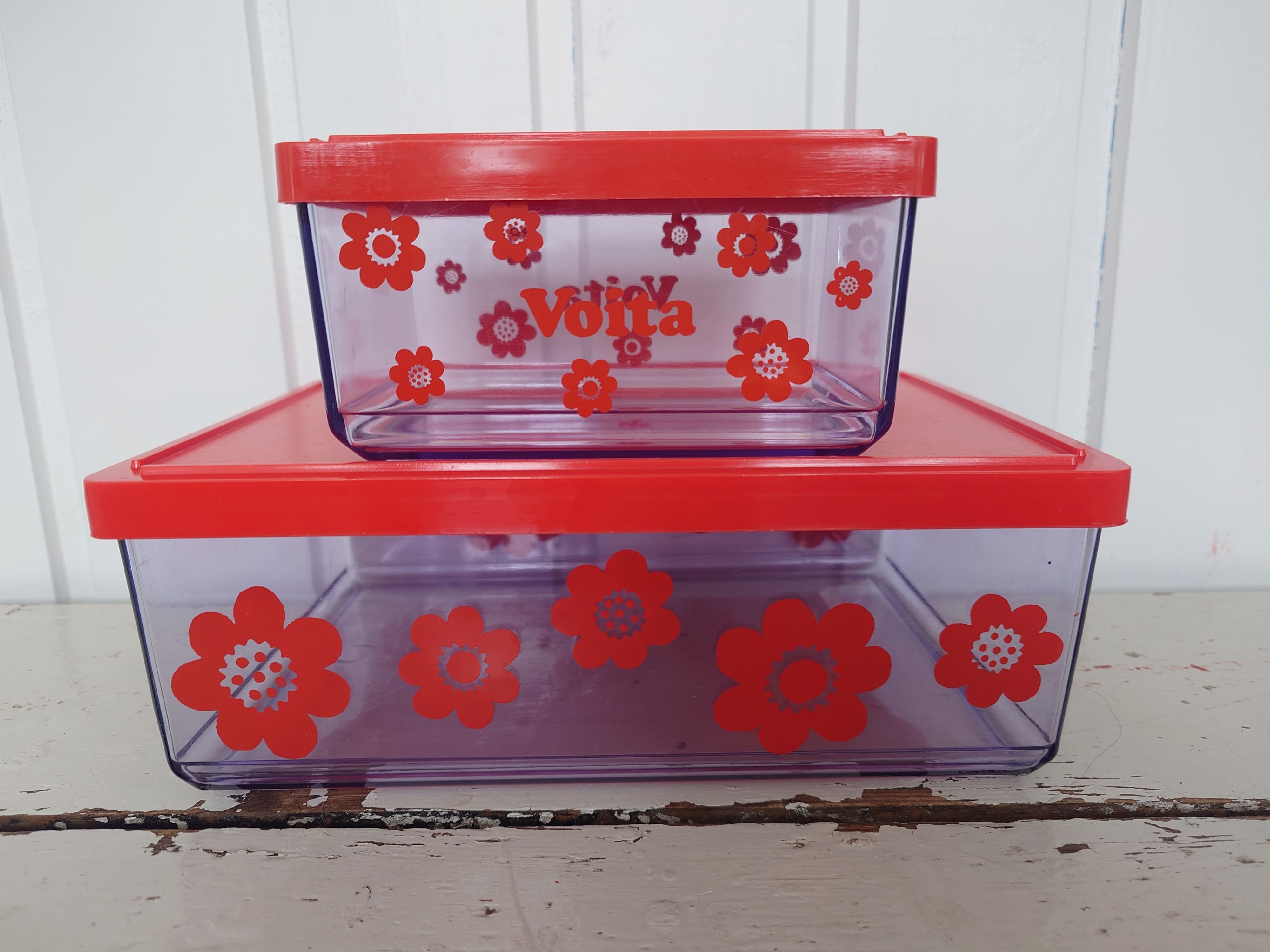 Retrot tanskalaiset muovipurkit 1970-luvulta. Kannellinen suorakaiteen muotoinen rasia, jossa on kukkakuvioita. Pienemmässä on teksti "Voita".