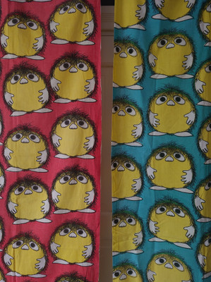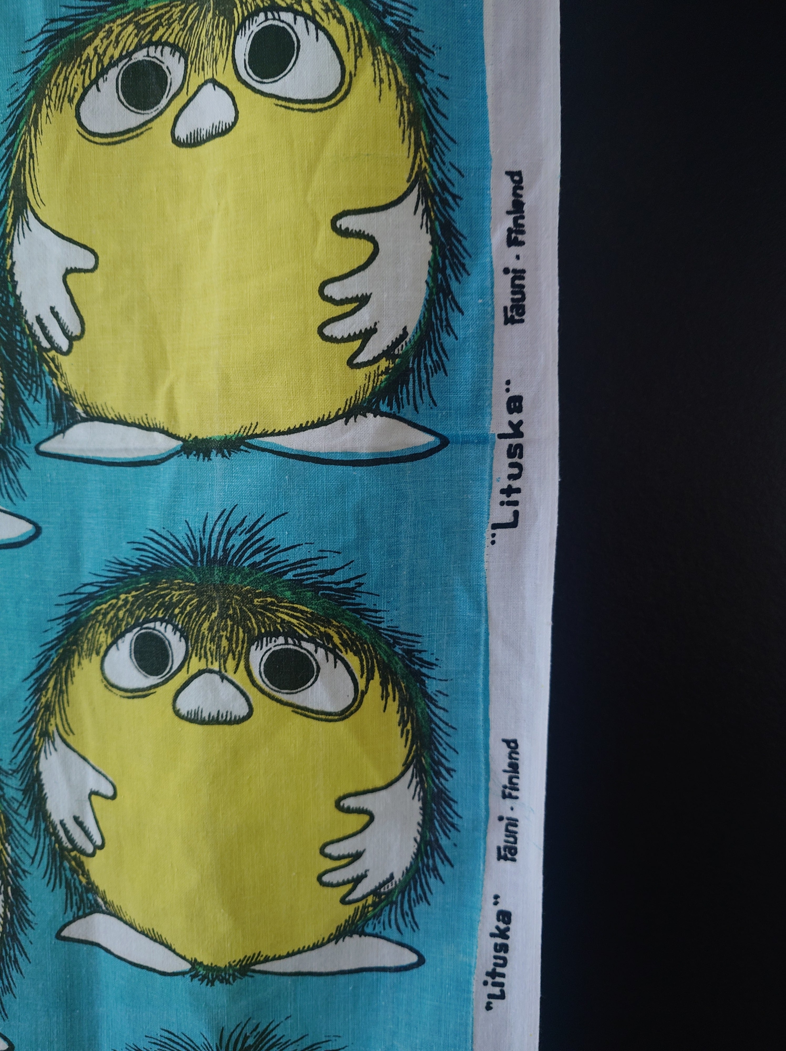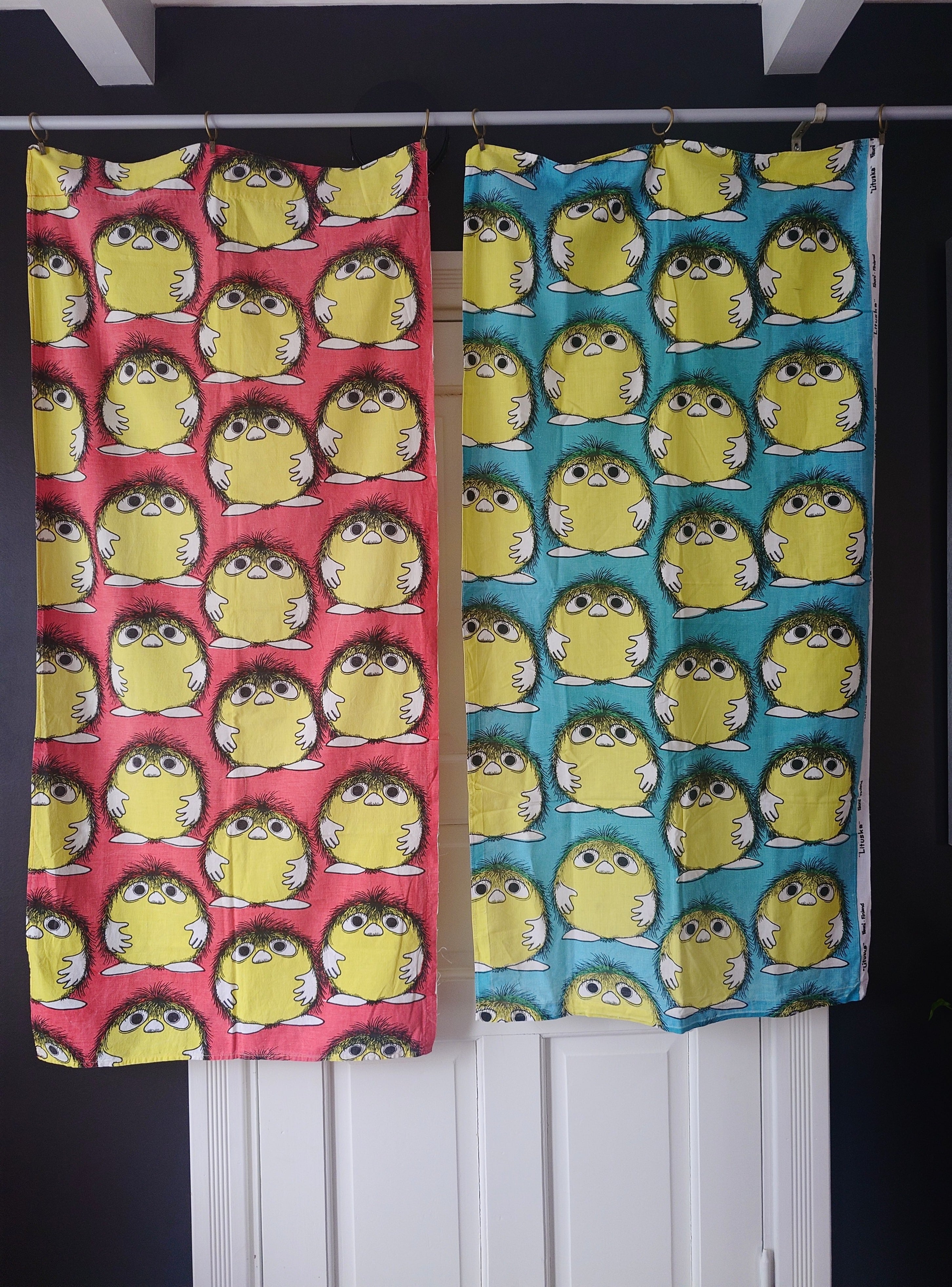 Näitä on hyvin harvoin tarjolla. Kankaat on ommeltu ja ovat voineet olla lastenhuoneessa verhoina tai lakanoina, ken tietää.