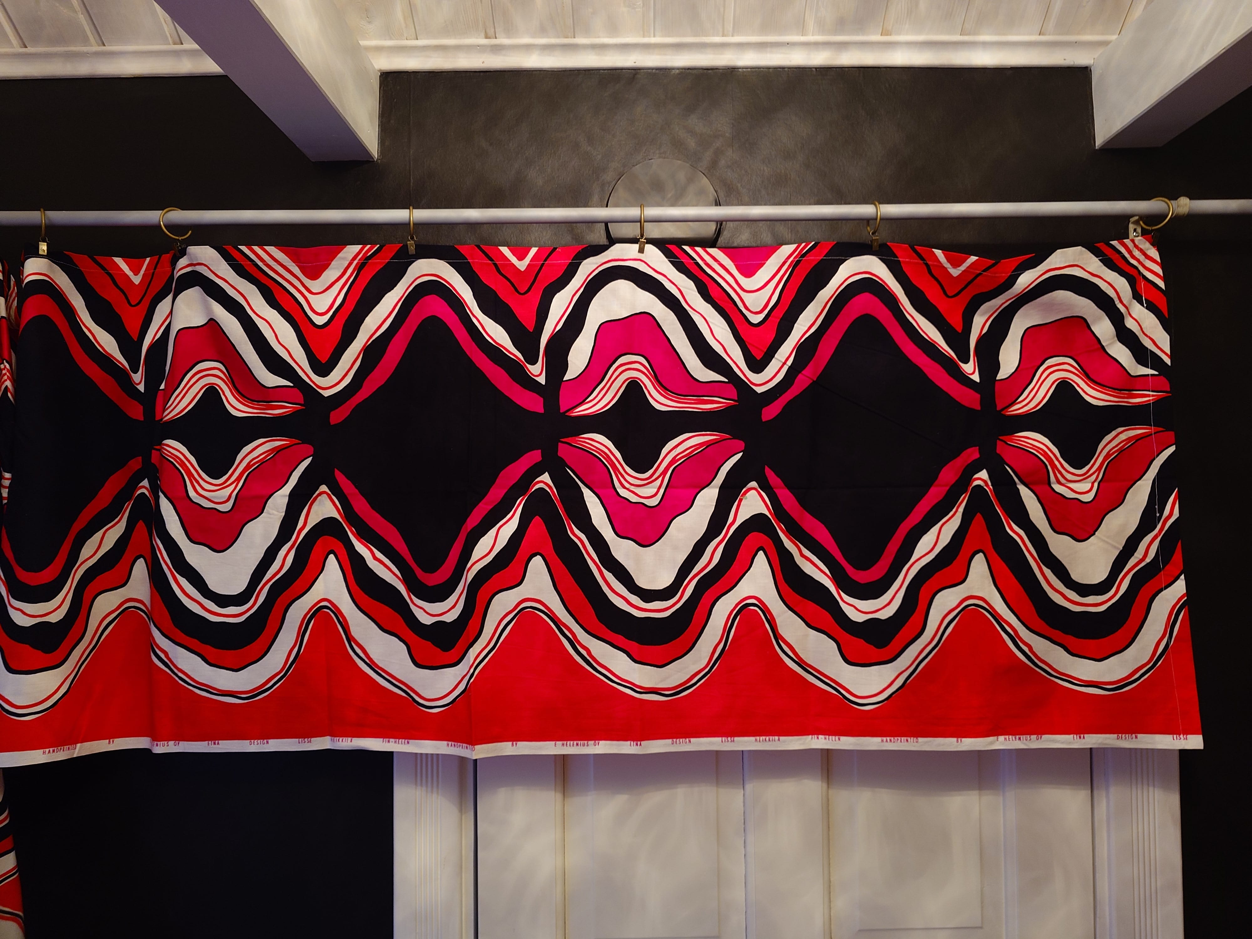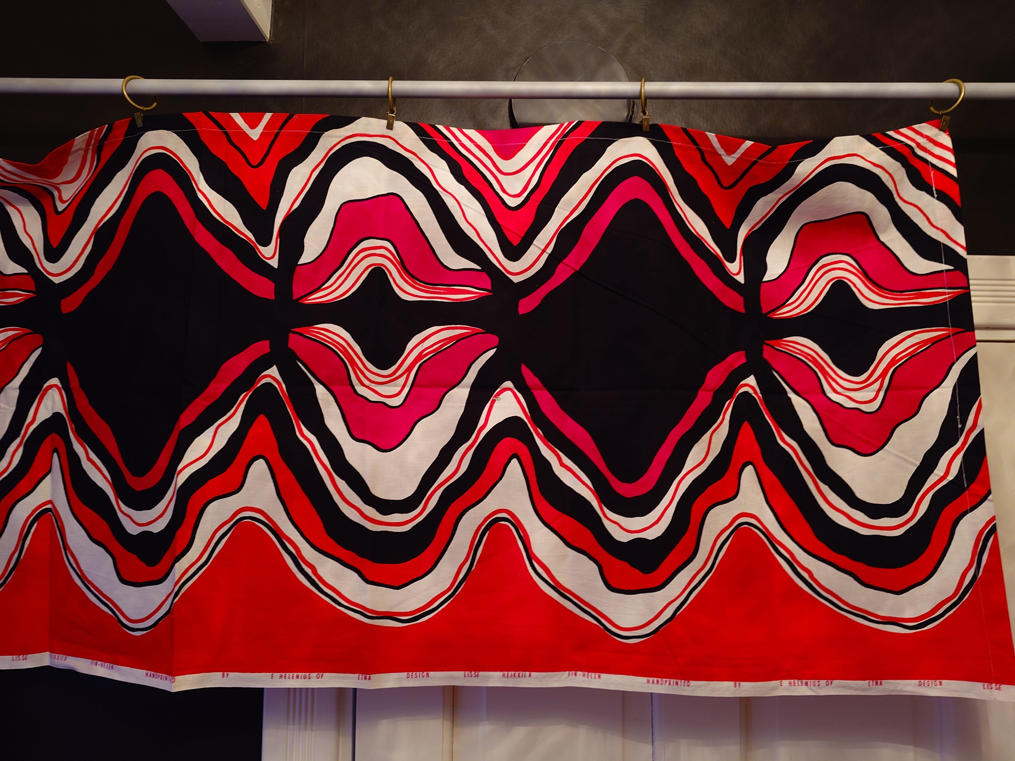 Puna-musta kappaverho, missä on kauniit hehkuvat värit. Puuvilla. Hyväkuntoinen.