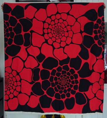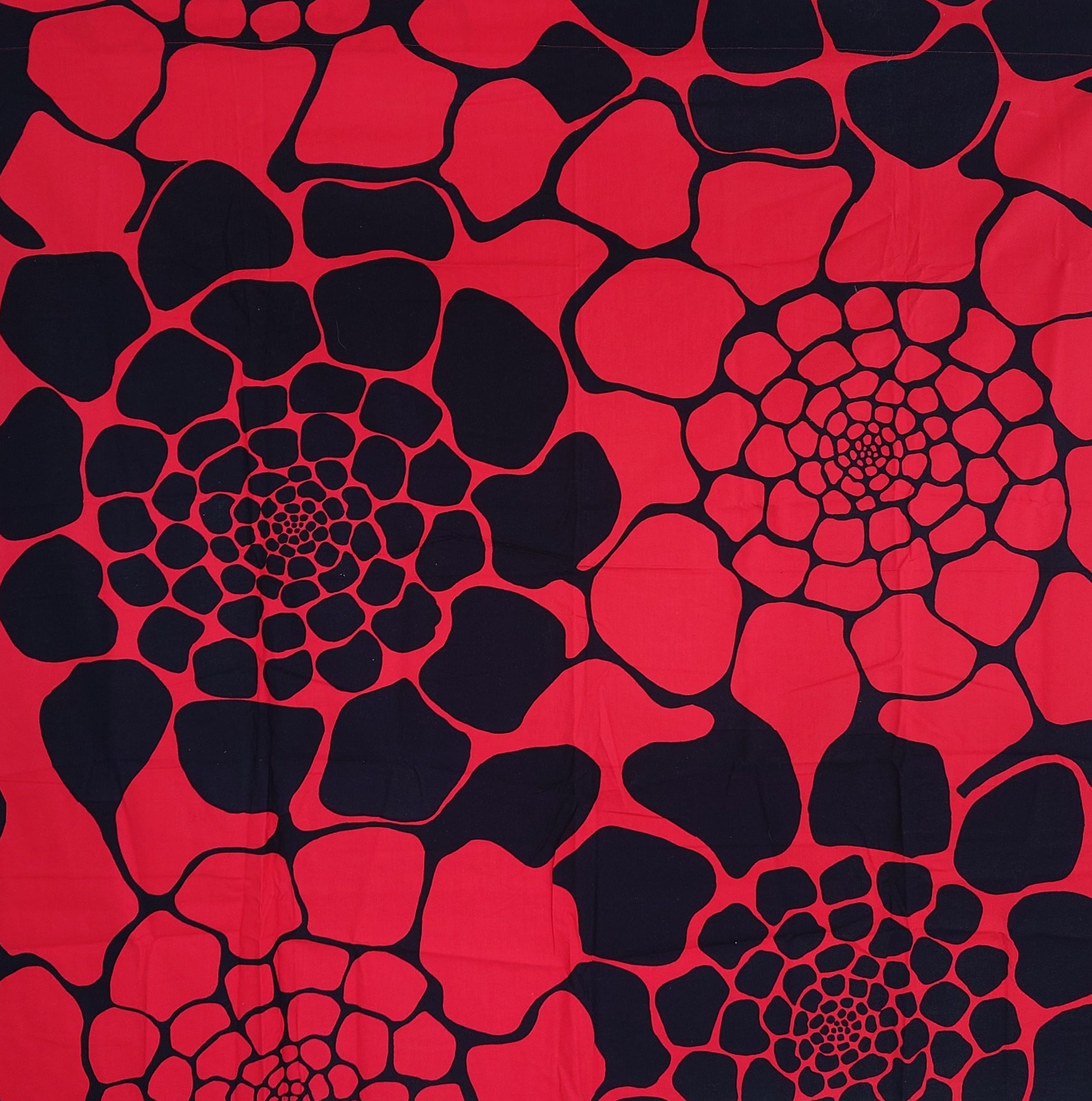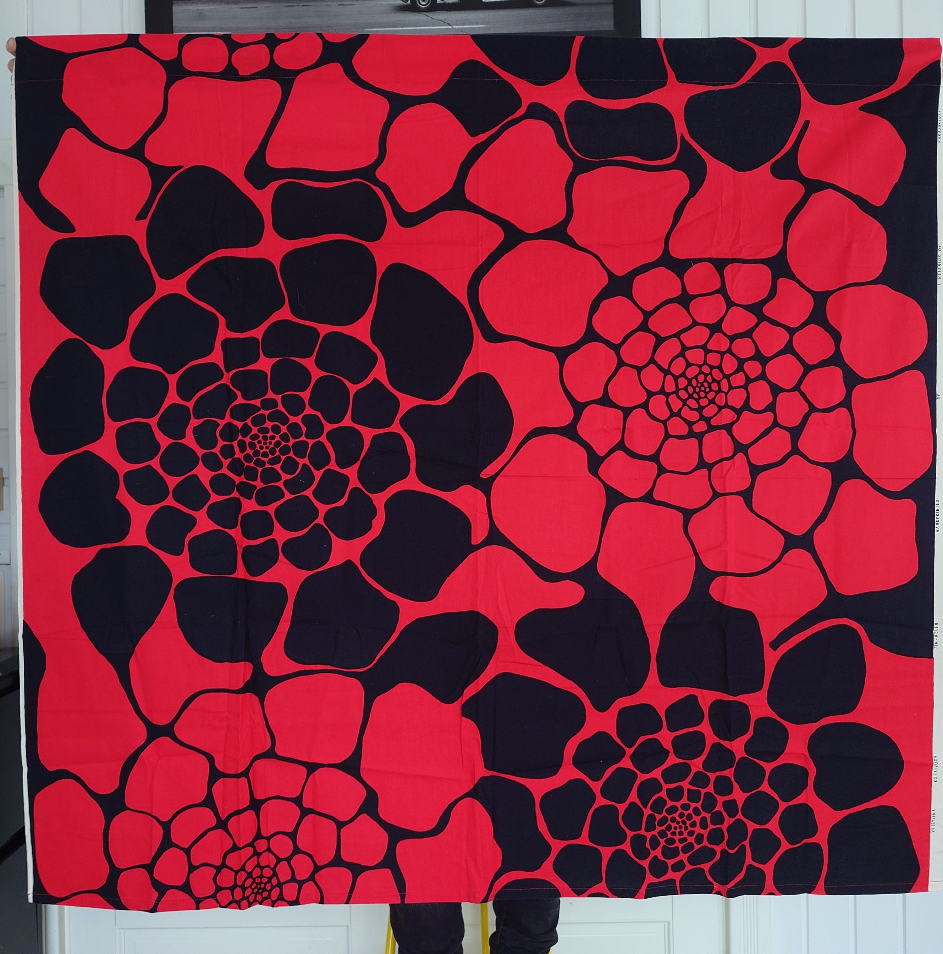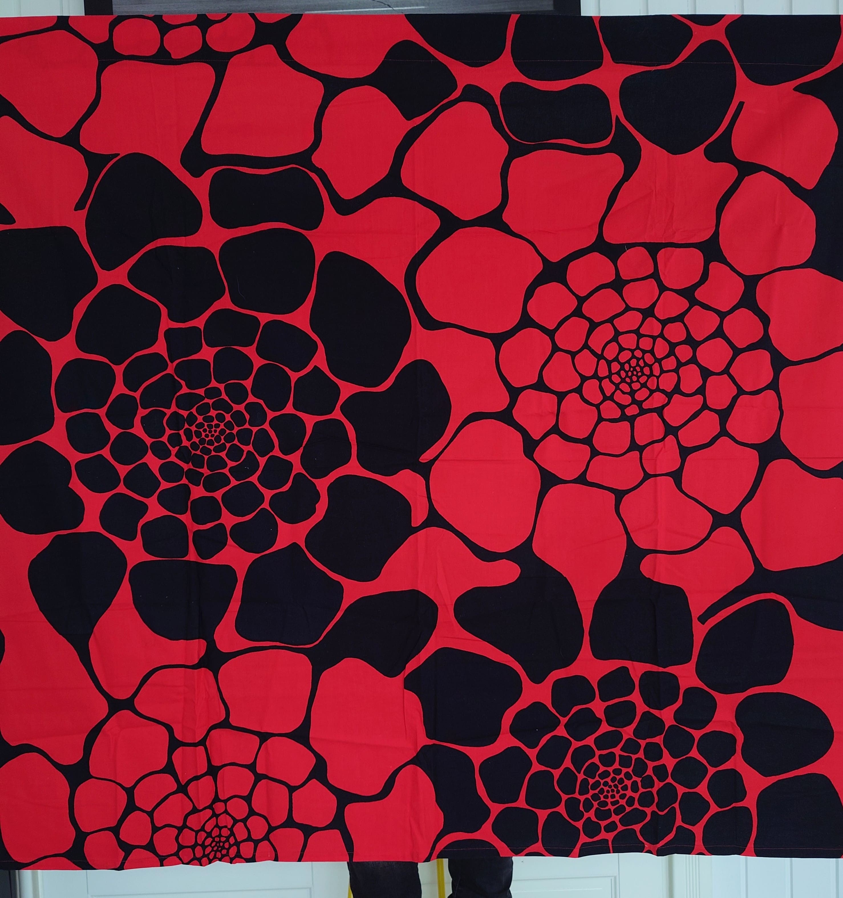 Hyvin kaunis musta - punainen puuvillakangas, josta on tehty matalat verhot.
