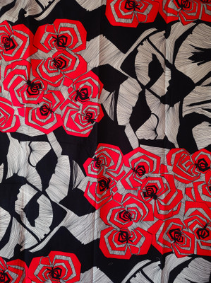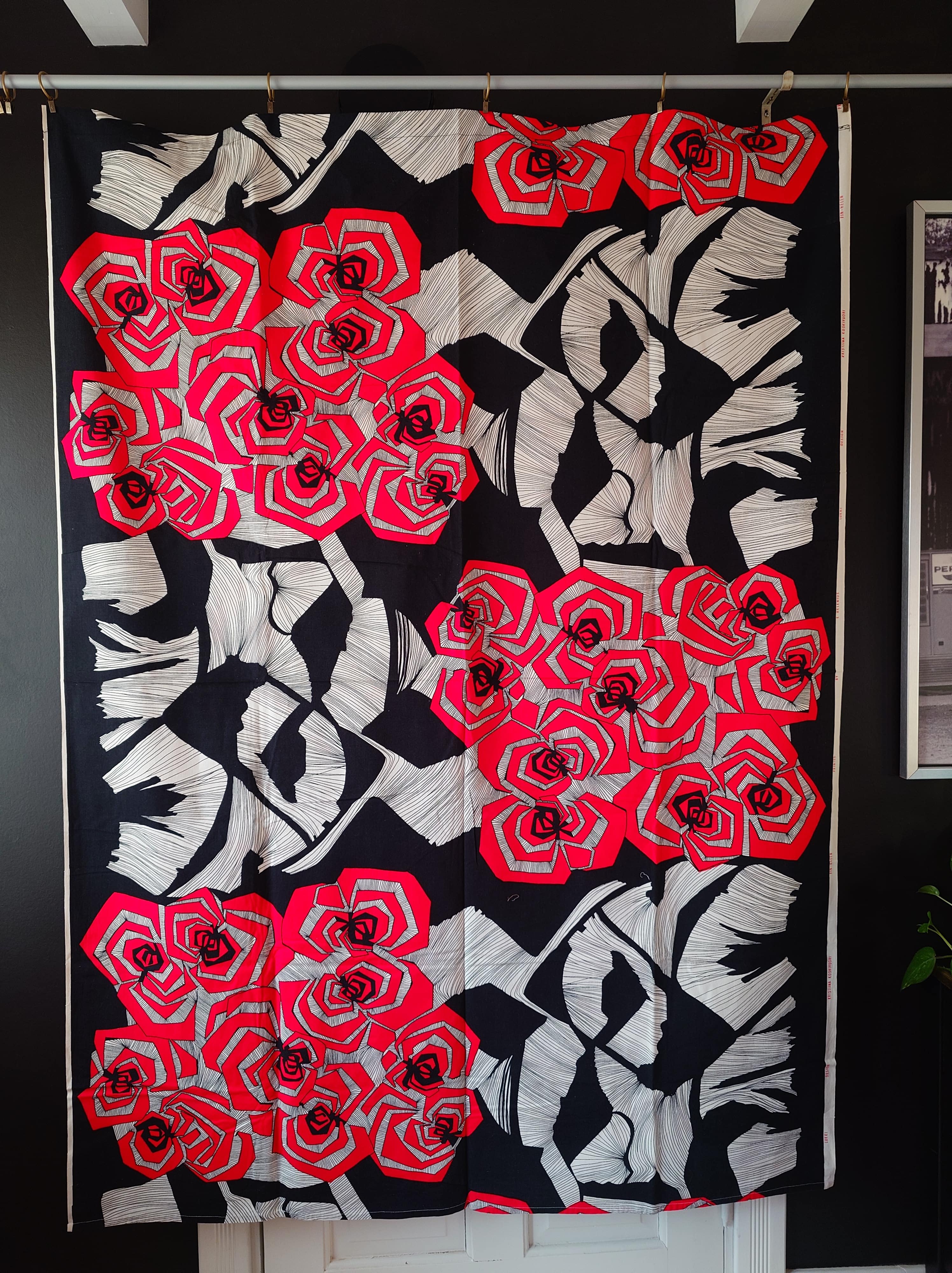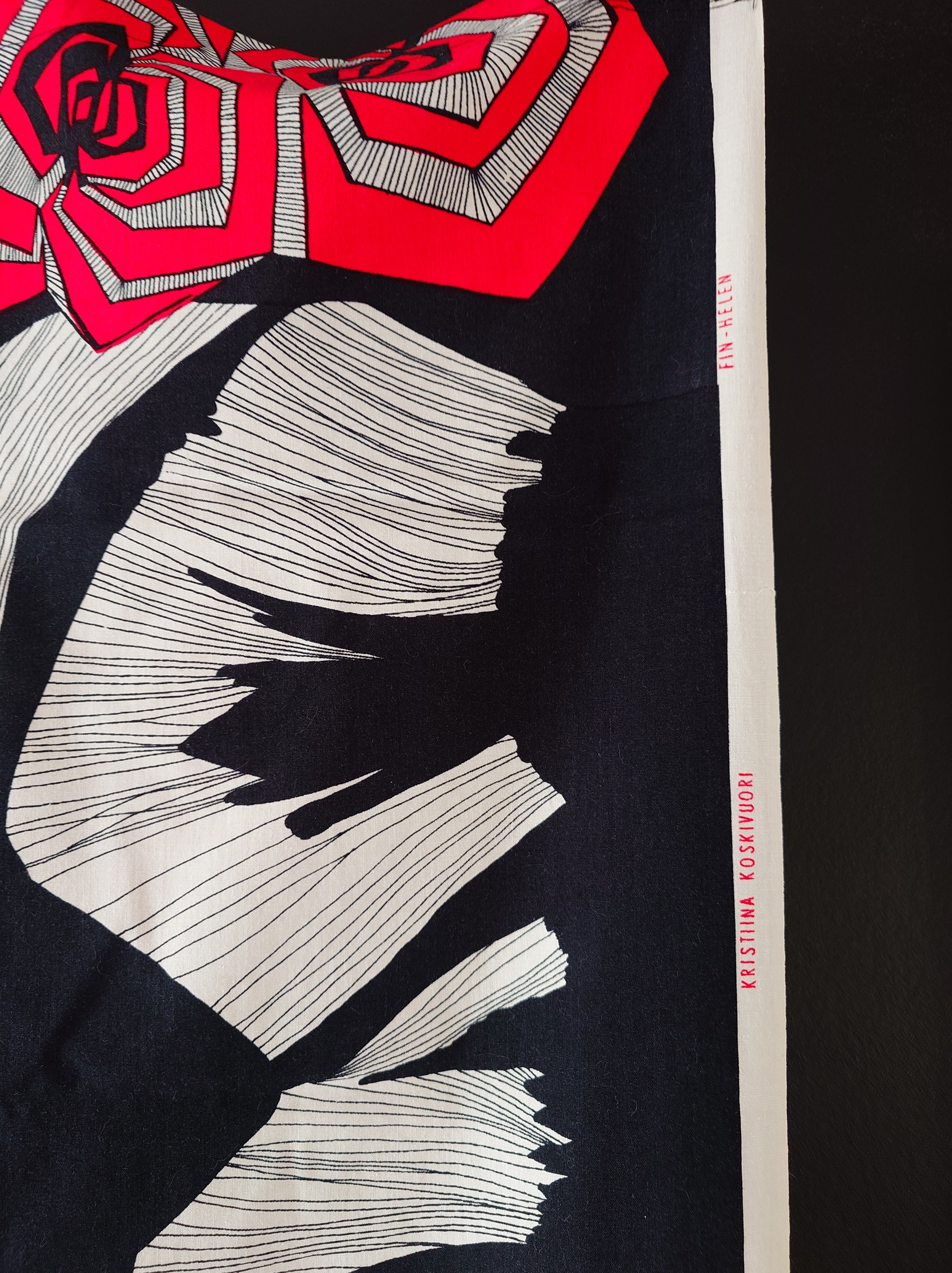 Harvinaisempi Fin-Helen löytö jostain 1970-1980-luvulta. Punaista ja valkoista mustalla taustalla. Värit ovat kirkkaat ja kangas hyväkuntoinen. Tämä voi olla verho tai pöytäliina tai voi käyttää kankaana.