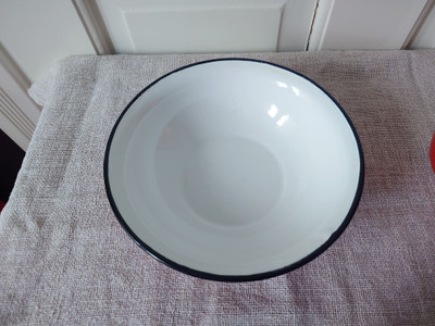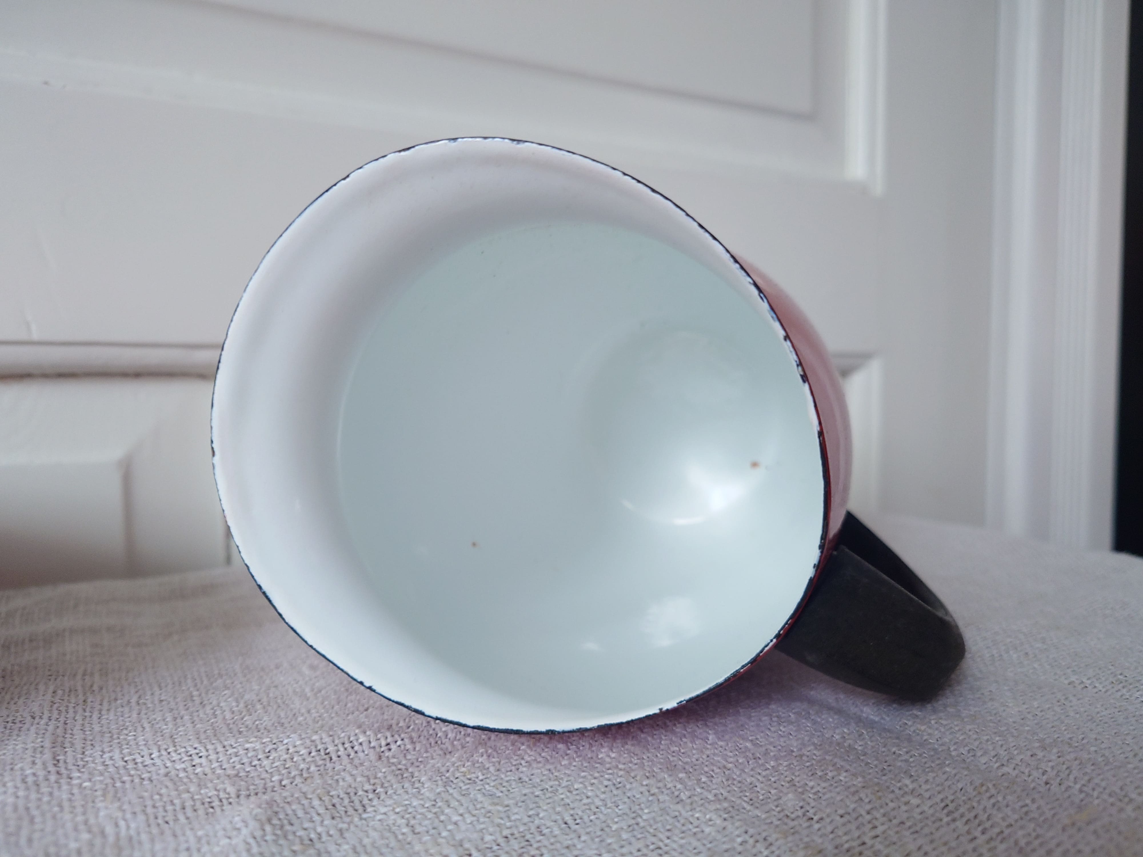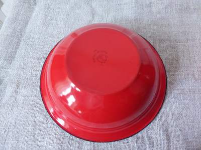 Kannun sisäpohjassa kaksi tummaa jälkeä emalipinnassa ja suuaukon reunassa hienoista kulumaa. Vadissa ei juuri erotu jälkiä.