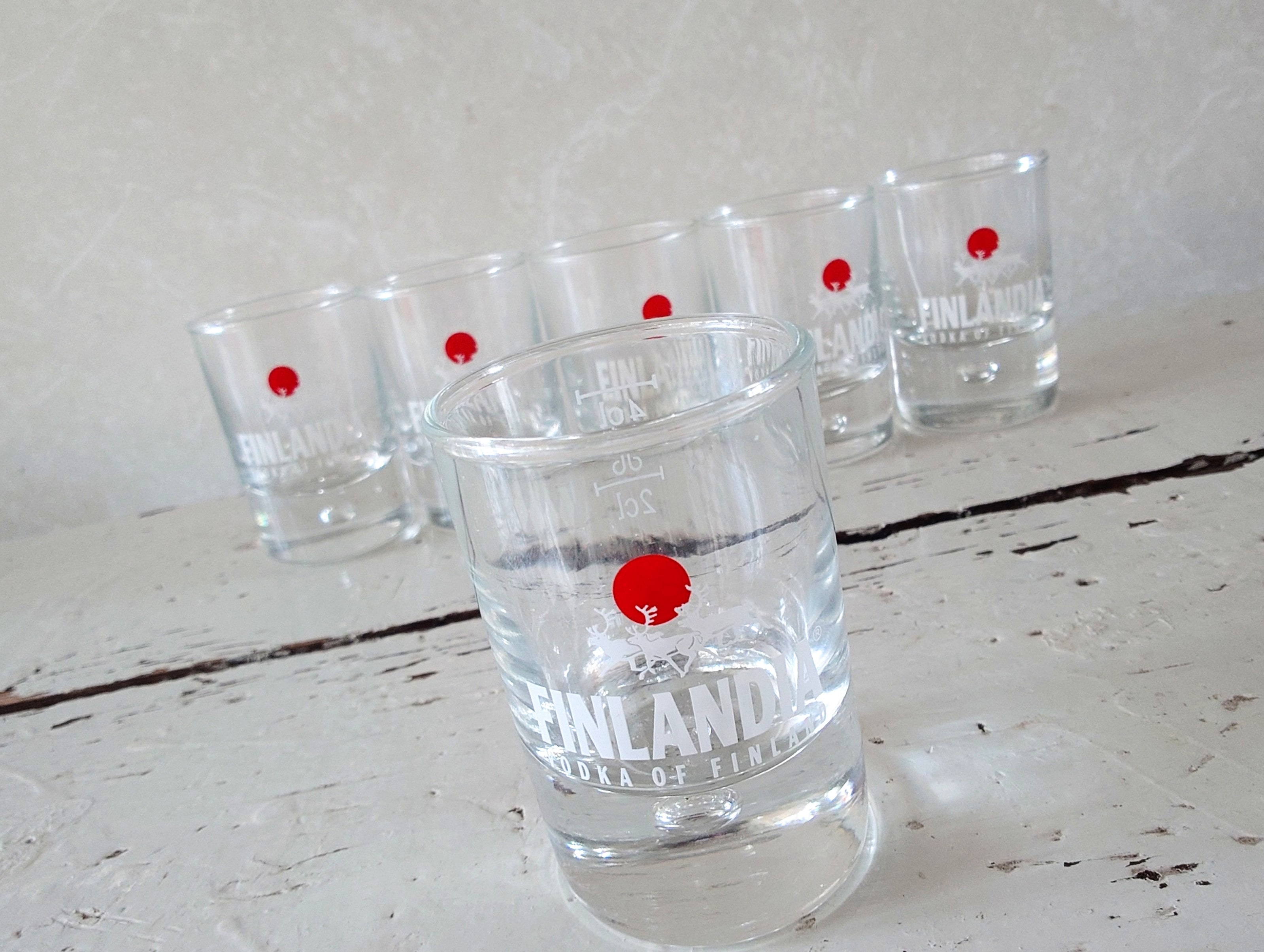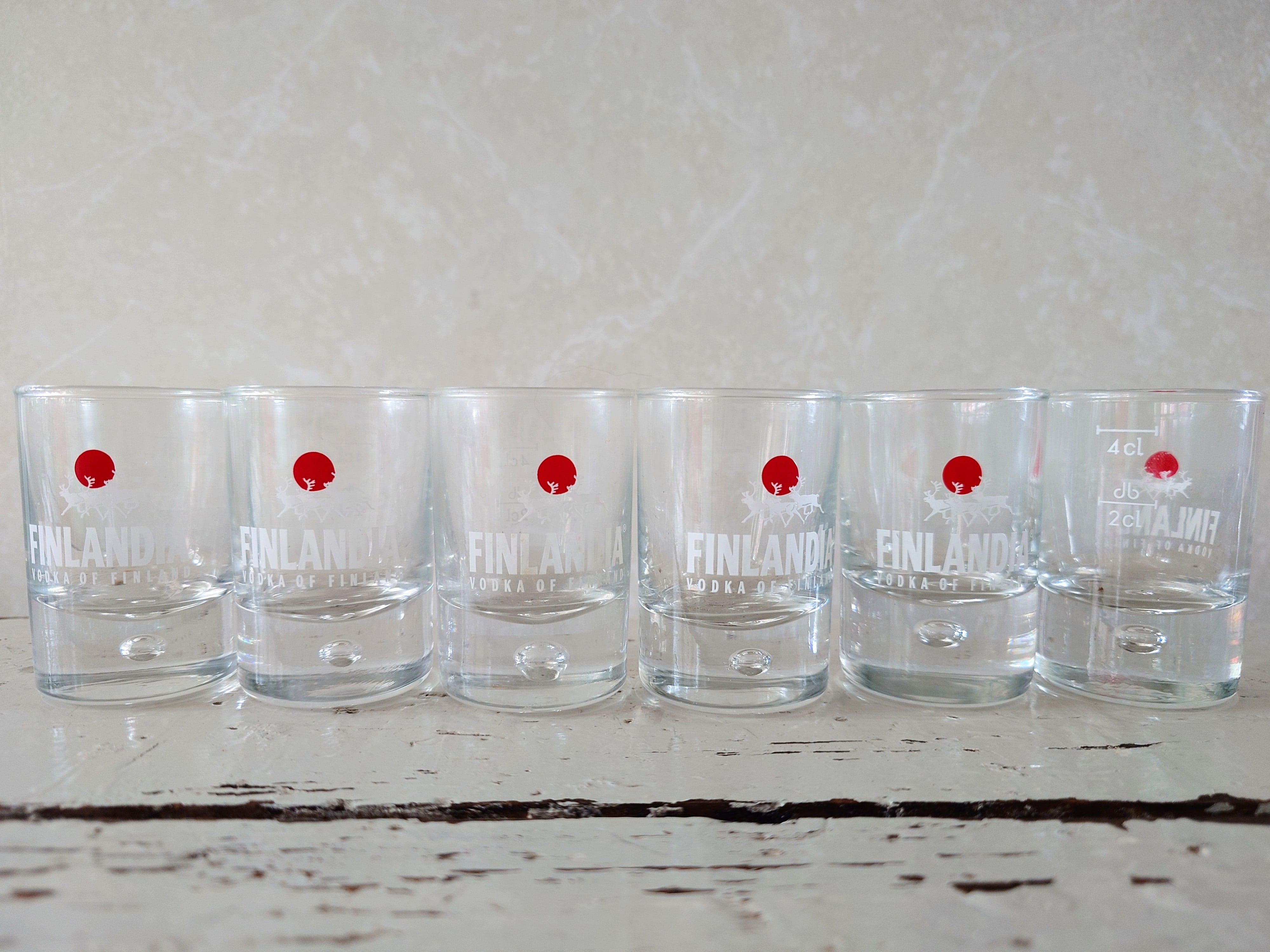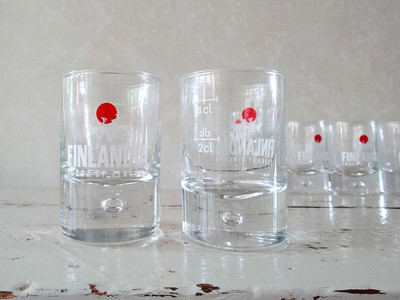 Paksu pohja, jonka sisällä kupla. Finlandia painatus ja mittaviivat 2 cl ja 4 cl takapuolella.