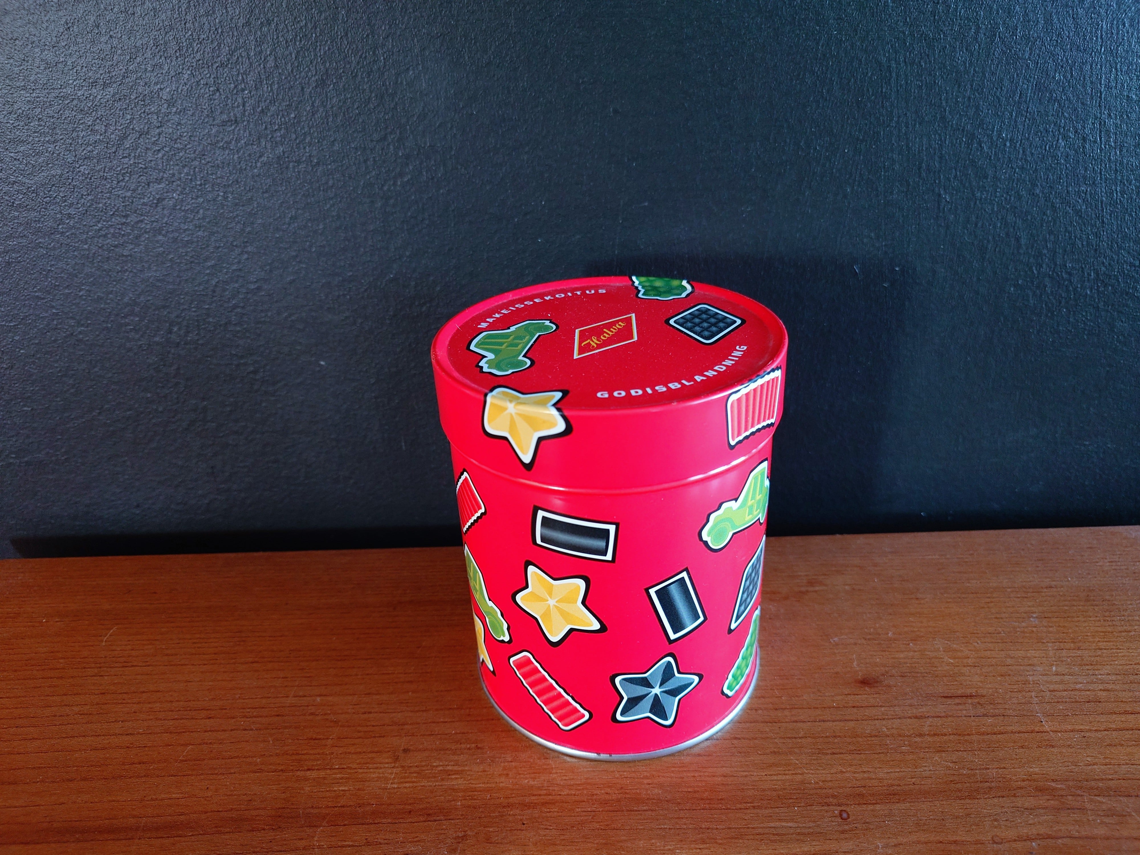 Halva makeissekoitus punainen peltipurkki