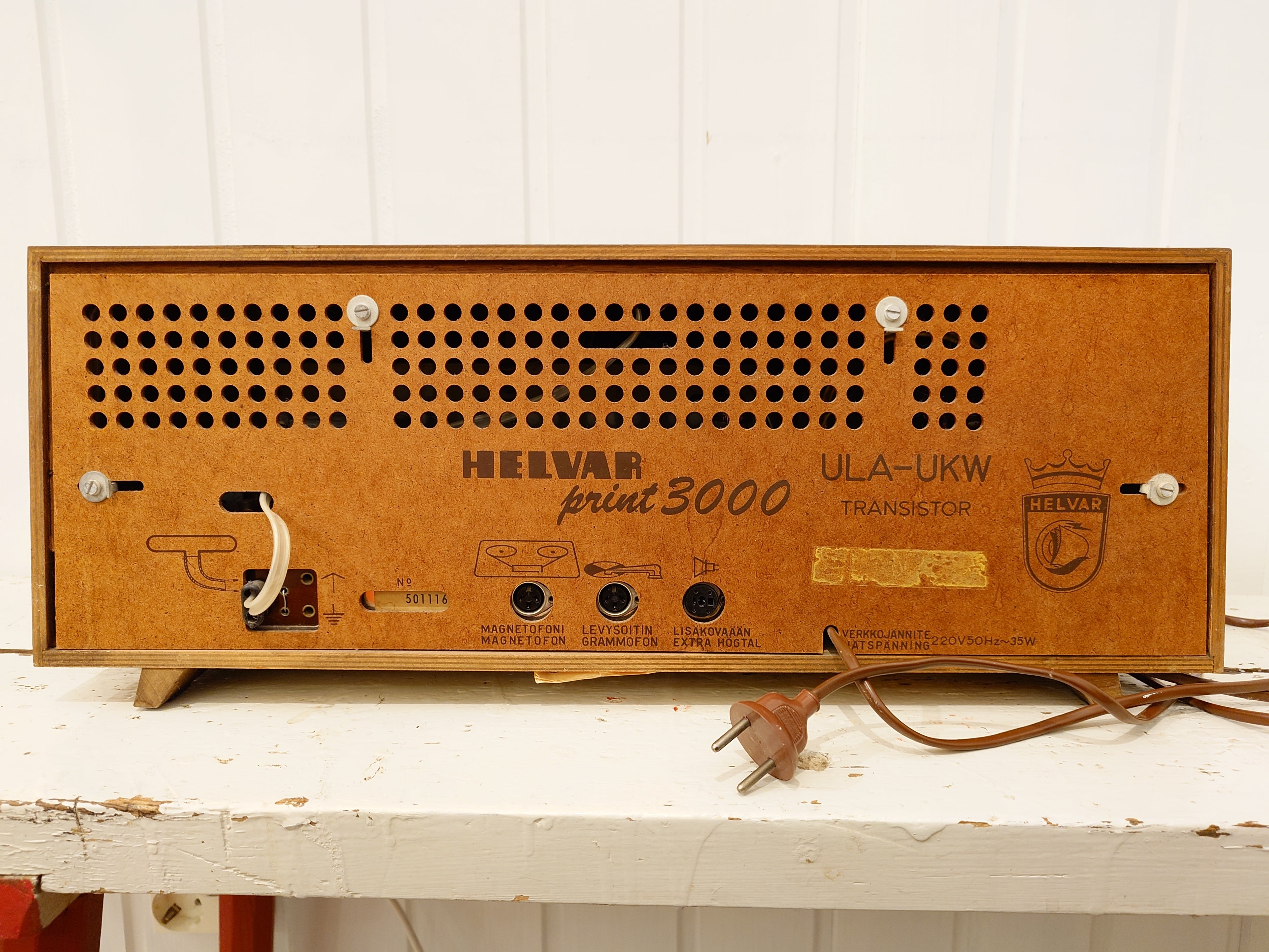 Nappulat toimivat ja soiva peli on. Kuuntelimme iskelmäkanavaa testiksi, eikä tarvinnut antennijohtoa. Vanhanmallinen alkuperäinen johto ja pistoke.