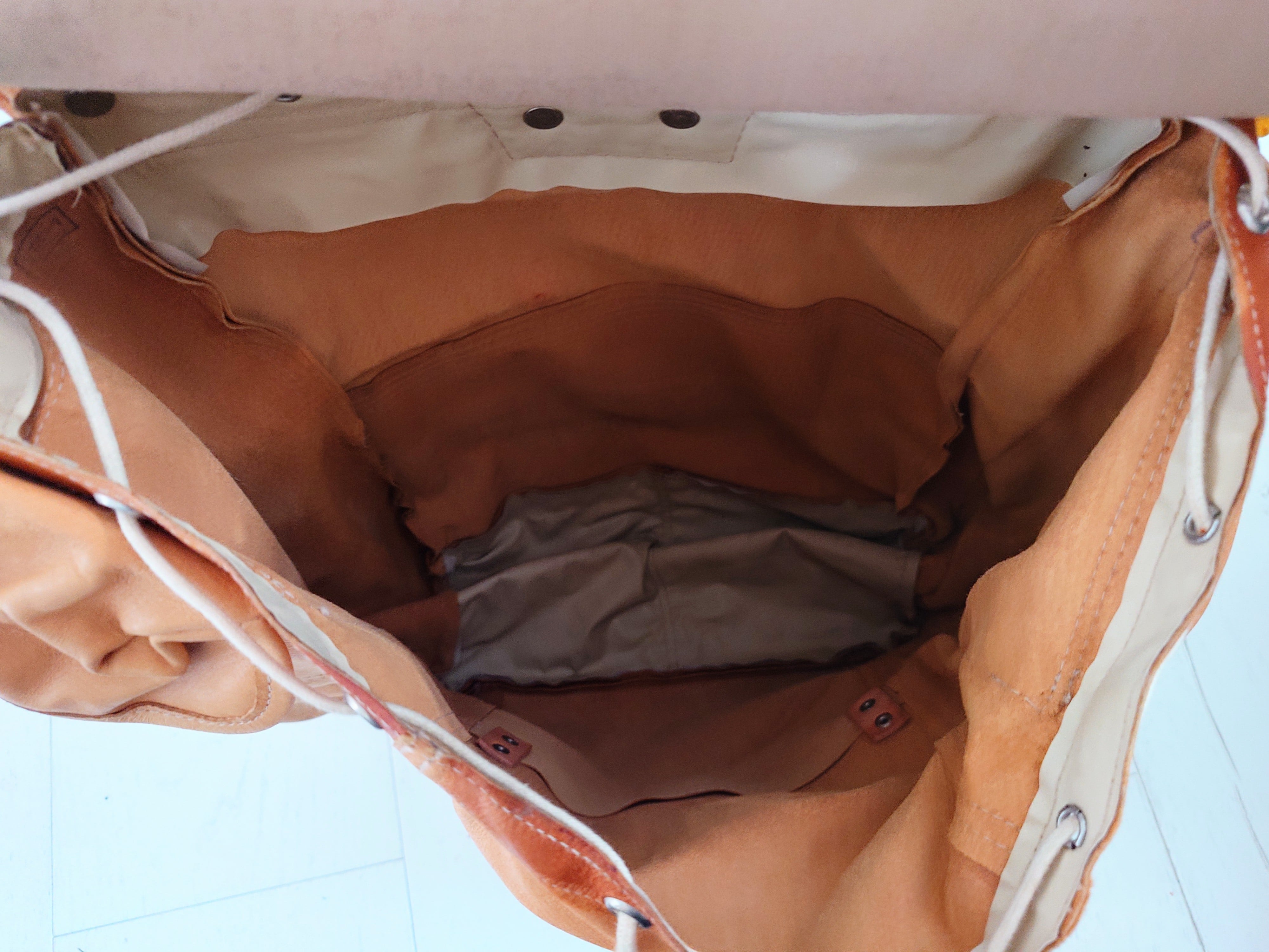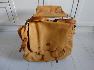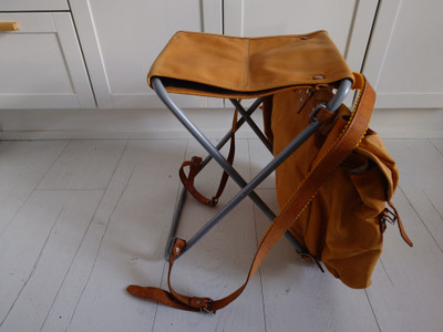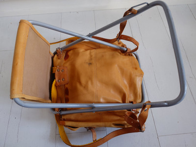 1960-1970-luvun reppu, jossa on taitettava jakkara mukana. Materiaali nahkaa.