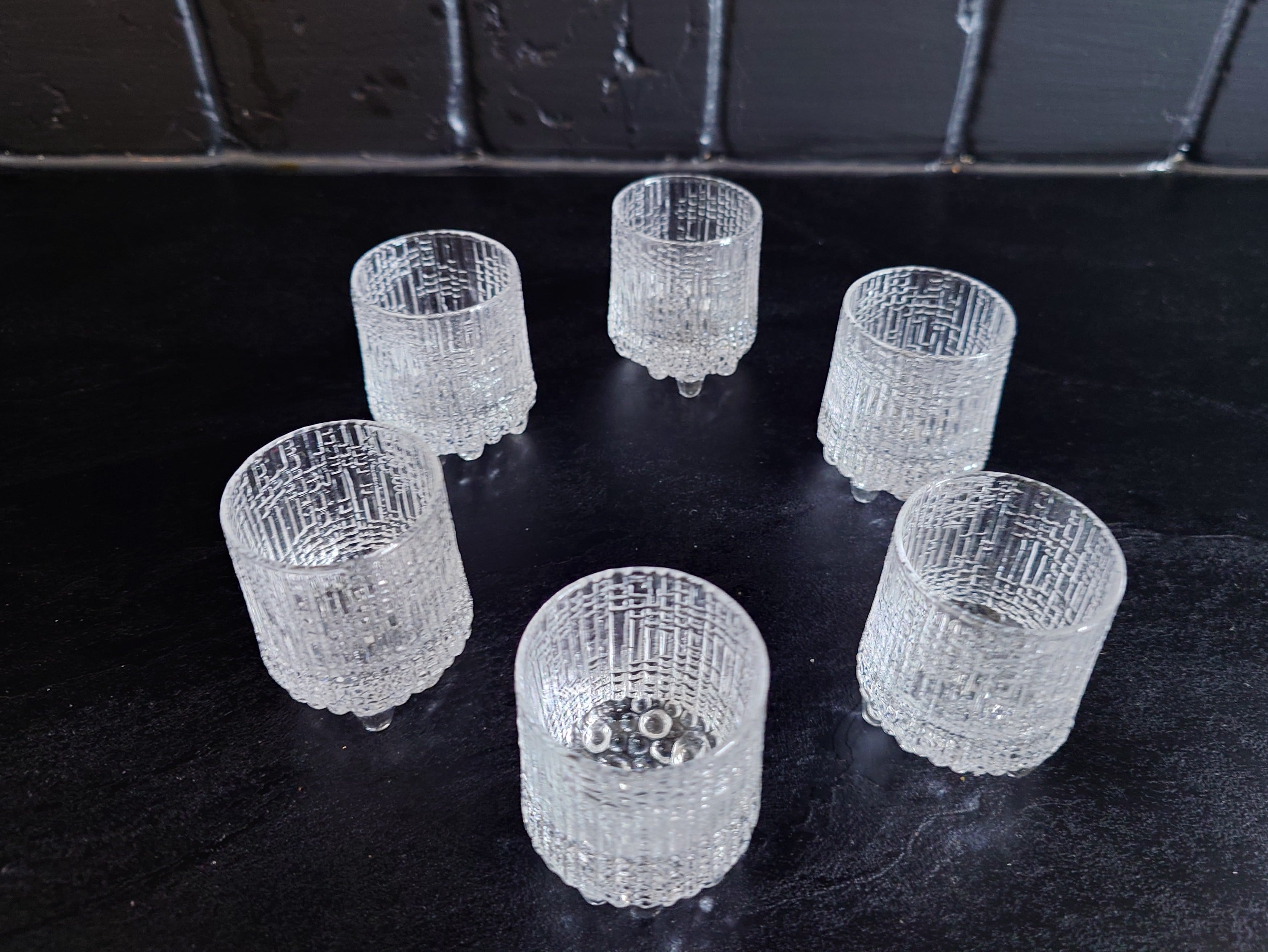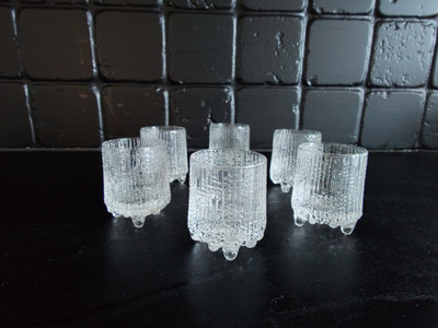 Nämä Ultima Thule snapsilasit ovat vanhempaa tuotantoa 1970-luvulta. Suomalaisen muotoilun klassikkona tunnettua Ultima Thulea valmistetaan yhä edelleen.