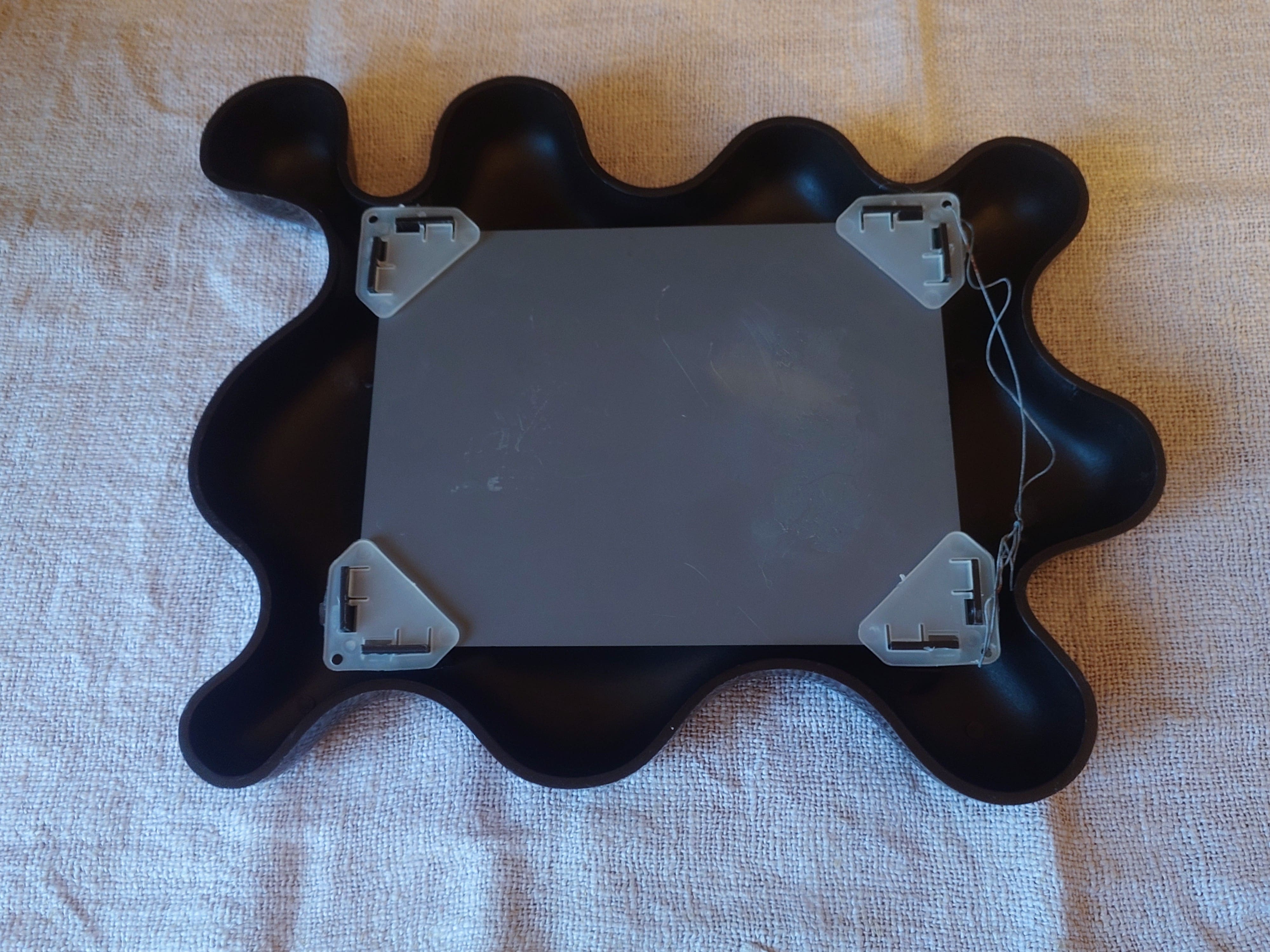 Musta muovikehys muistuttaa ehkä vähän musteläiskää.