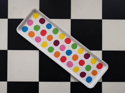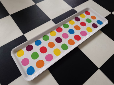 Ikean muovitarjotin, jossa on värikkäitä palloja.