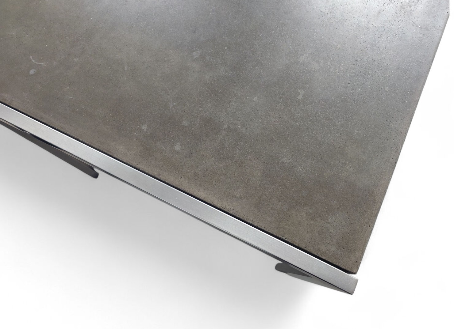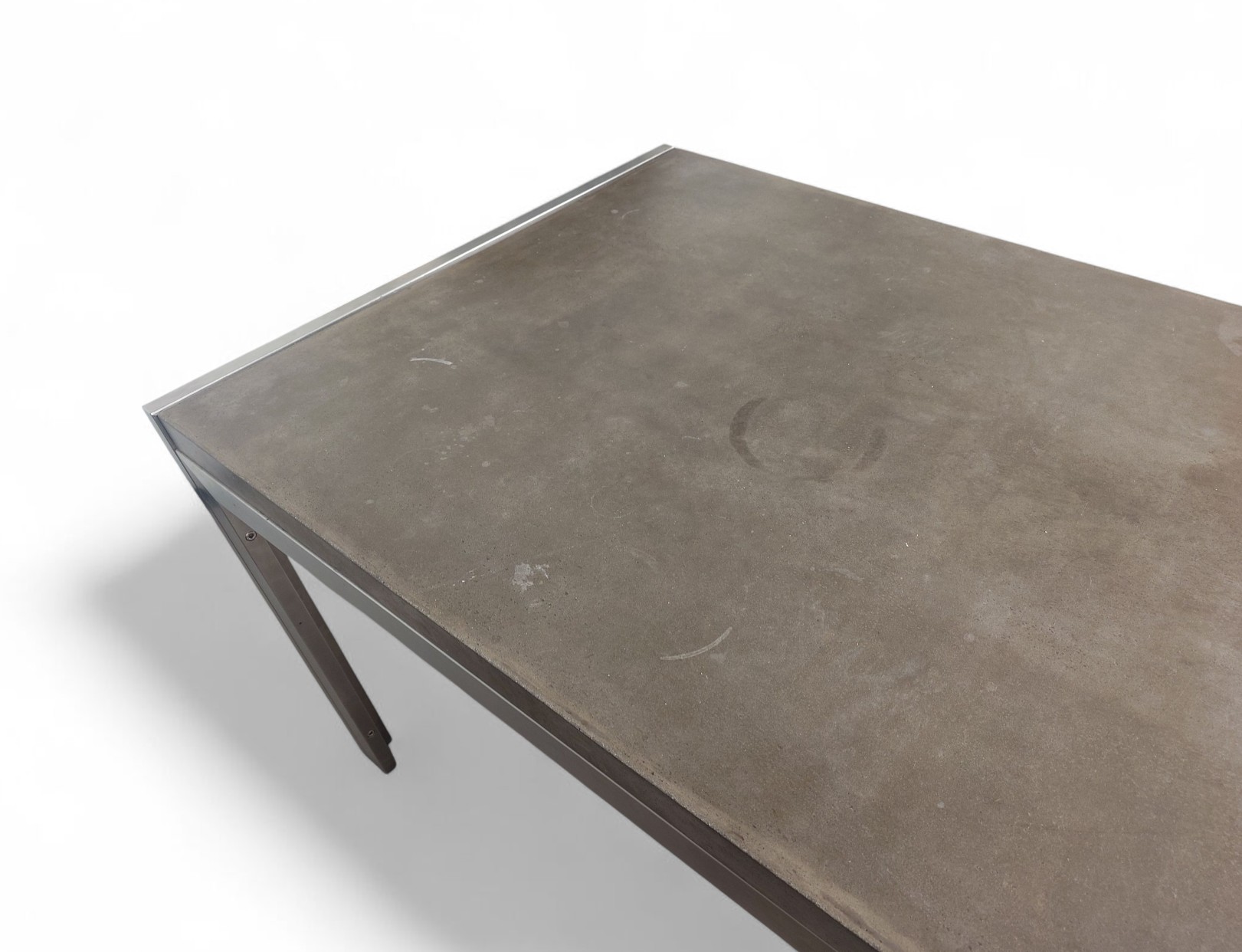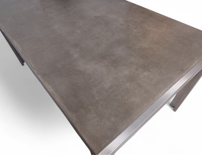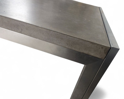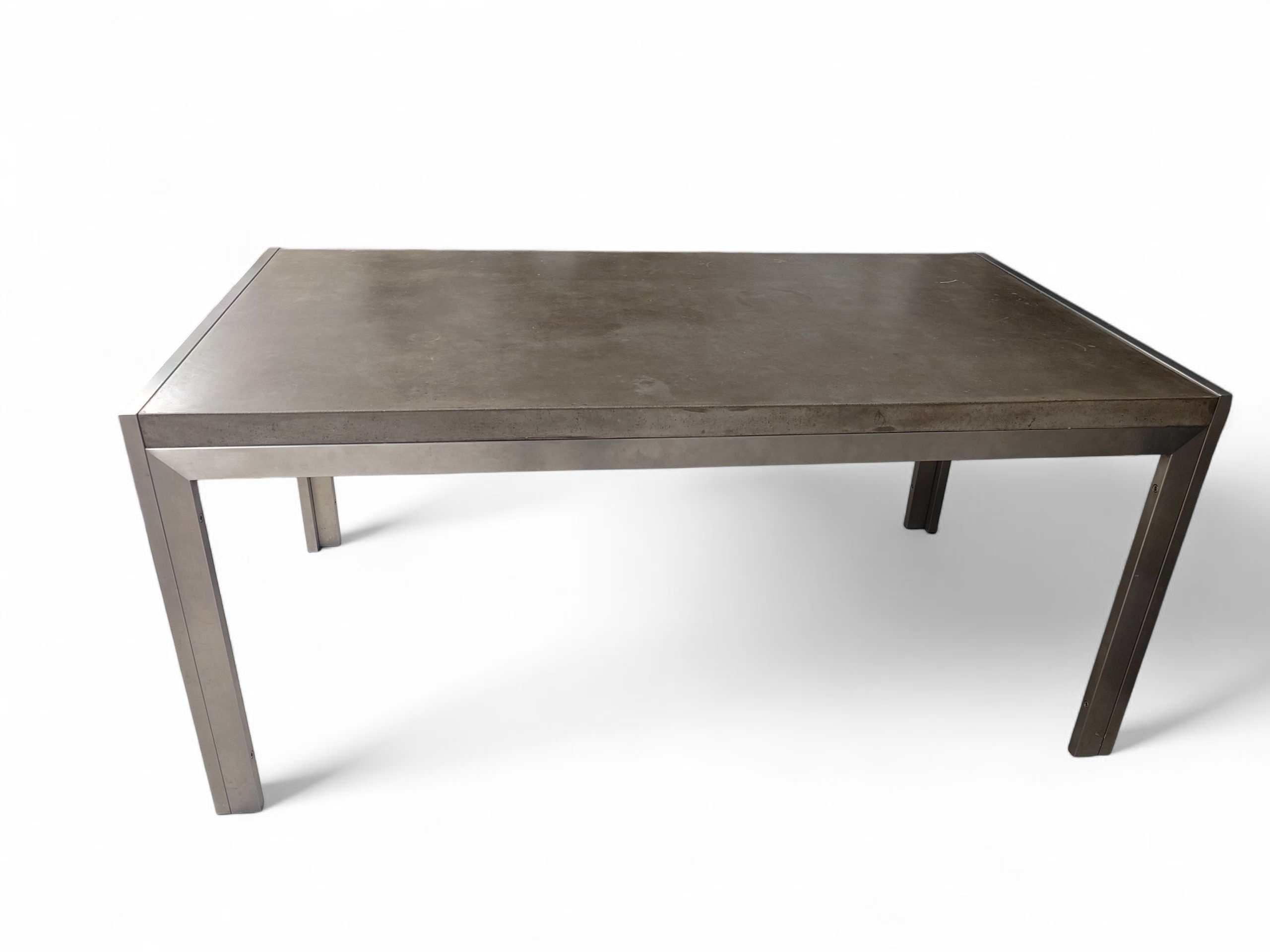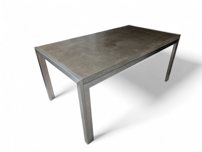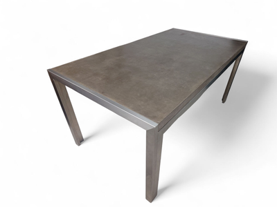Industrial tyylin henkeen sopiva tanskalainen pöytä on harvinaisempi löytö. Sen runko tehty ruostumattomasta teräksestä ja pöytälevy on sileäksi käsiteltyä betonia.
