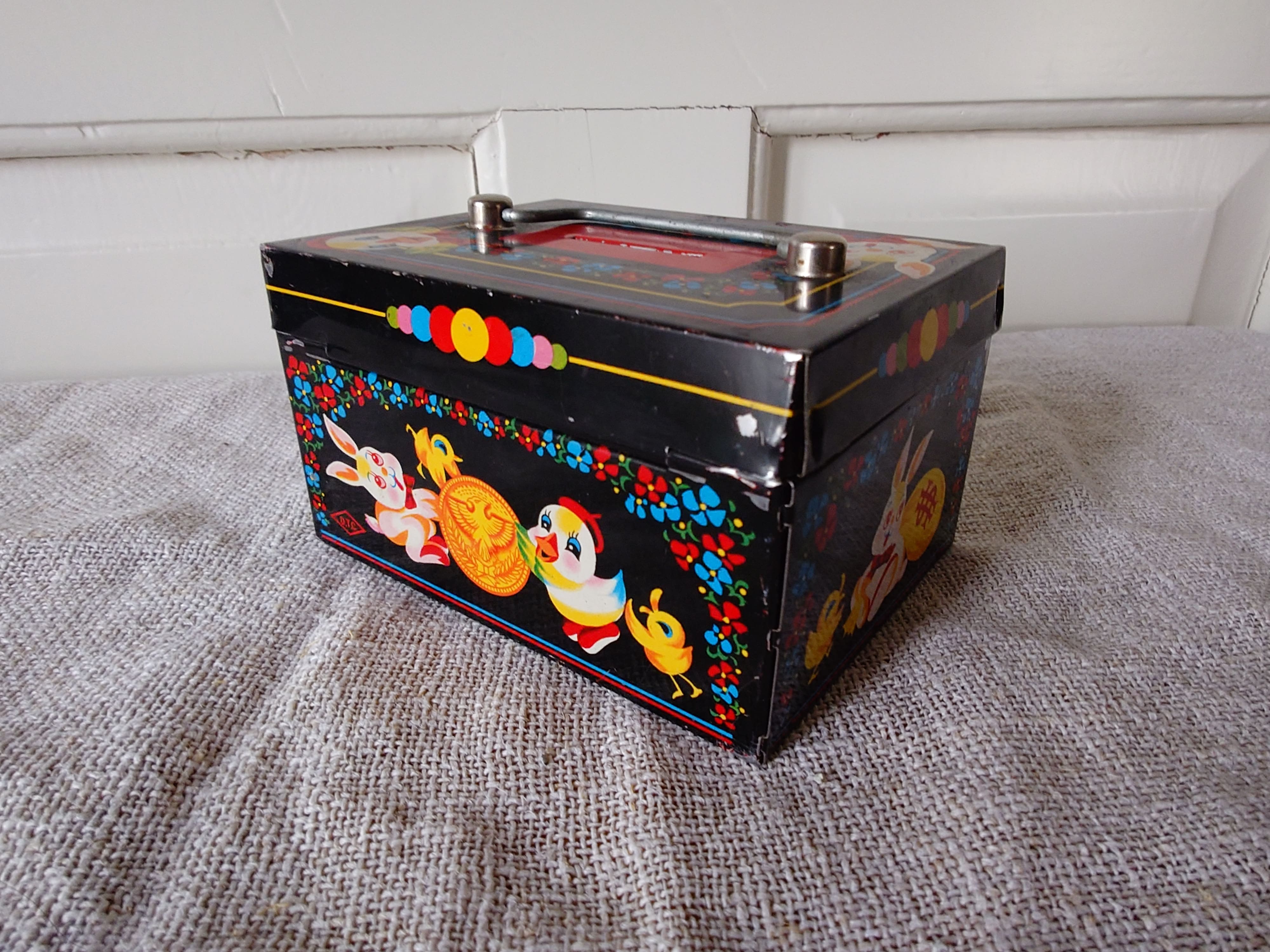 Lippaassa on värikkäitä jäniksen ja kanan kuvia mustalla pohjalla.