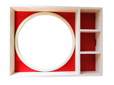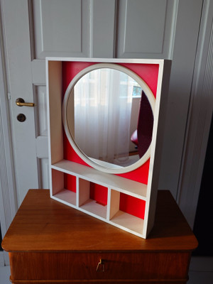 Uulalaa mikä retro puuhyllykkö. Punainen tausta, pyöreä peili ja hyllyjä.