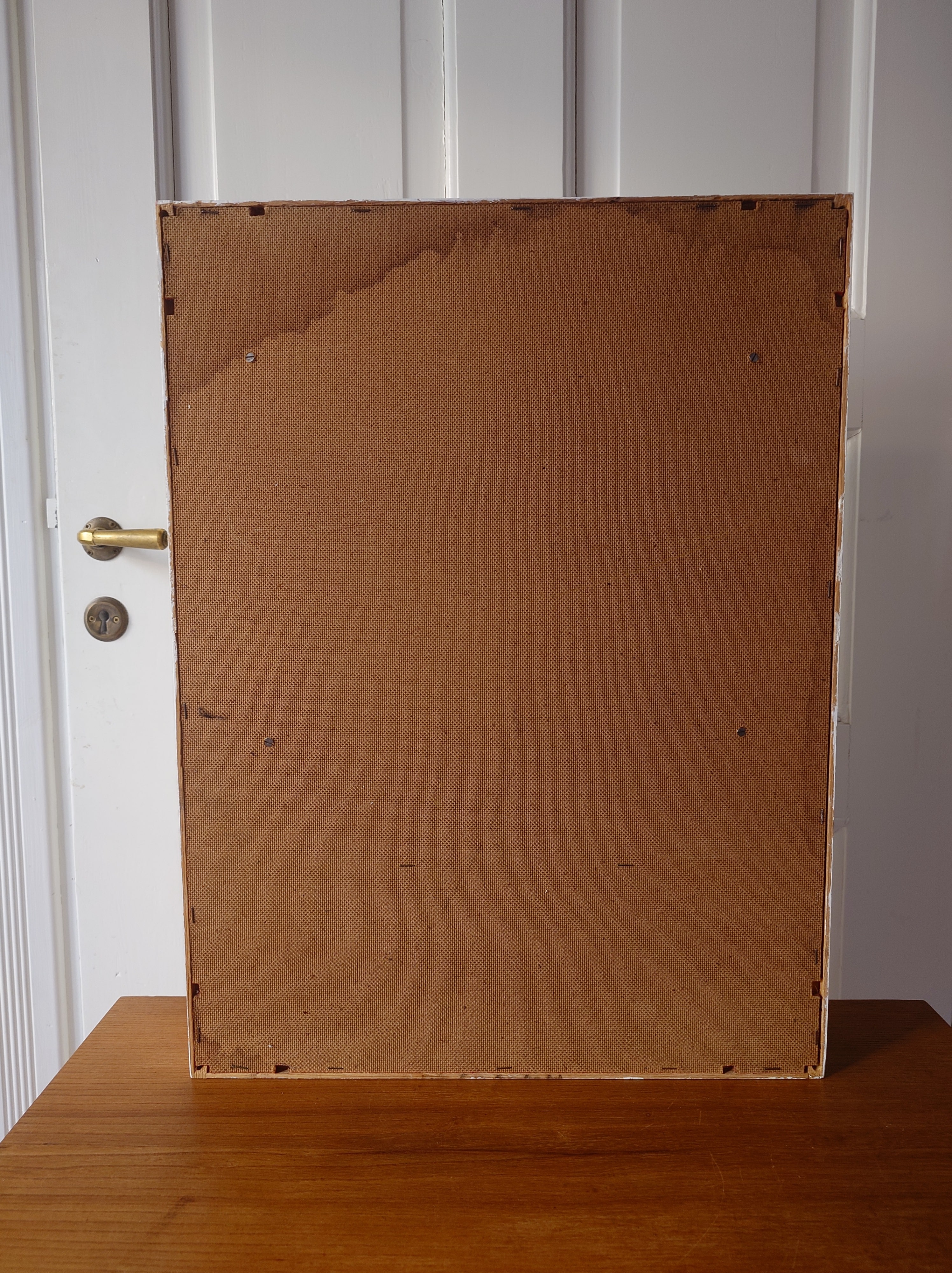 Hyväkuntoinen ja alkuperäisessä maalissa. Pientä käytön jälkeä ja epätasaisuutta puisissa hyllyissä. Takaosa kovalevyä. Ei ole ollut kiinnitettynä seinään.