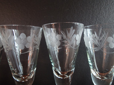 Kaunis sherrylasi tai jälkiruokaviinilasi kaiverrettua kristallia.