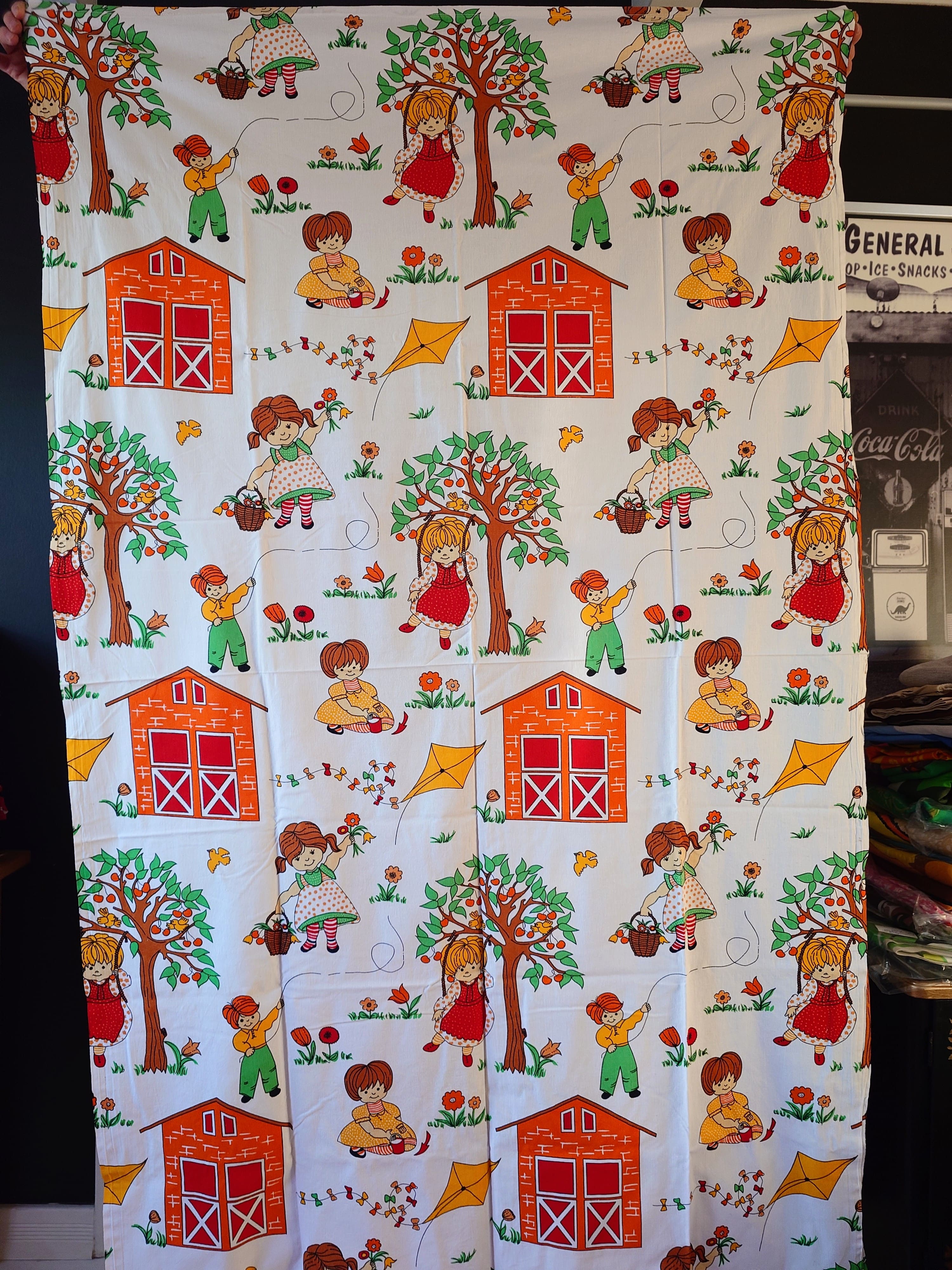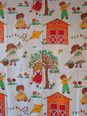 1970-luvun lasten ommeltu puuvillakangas.