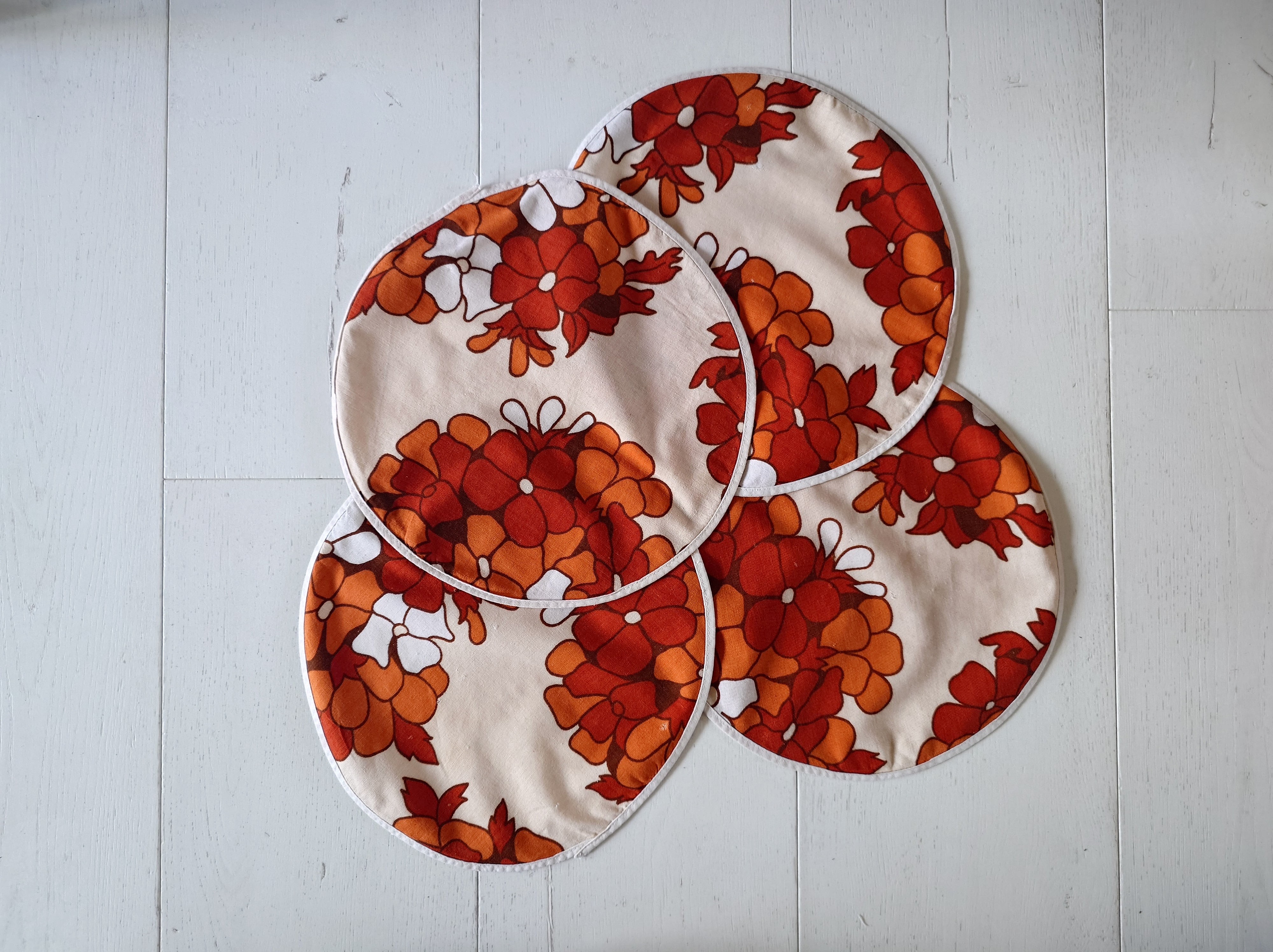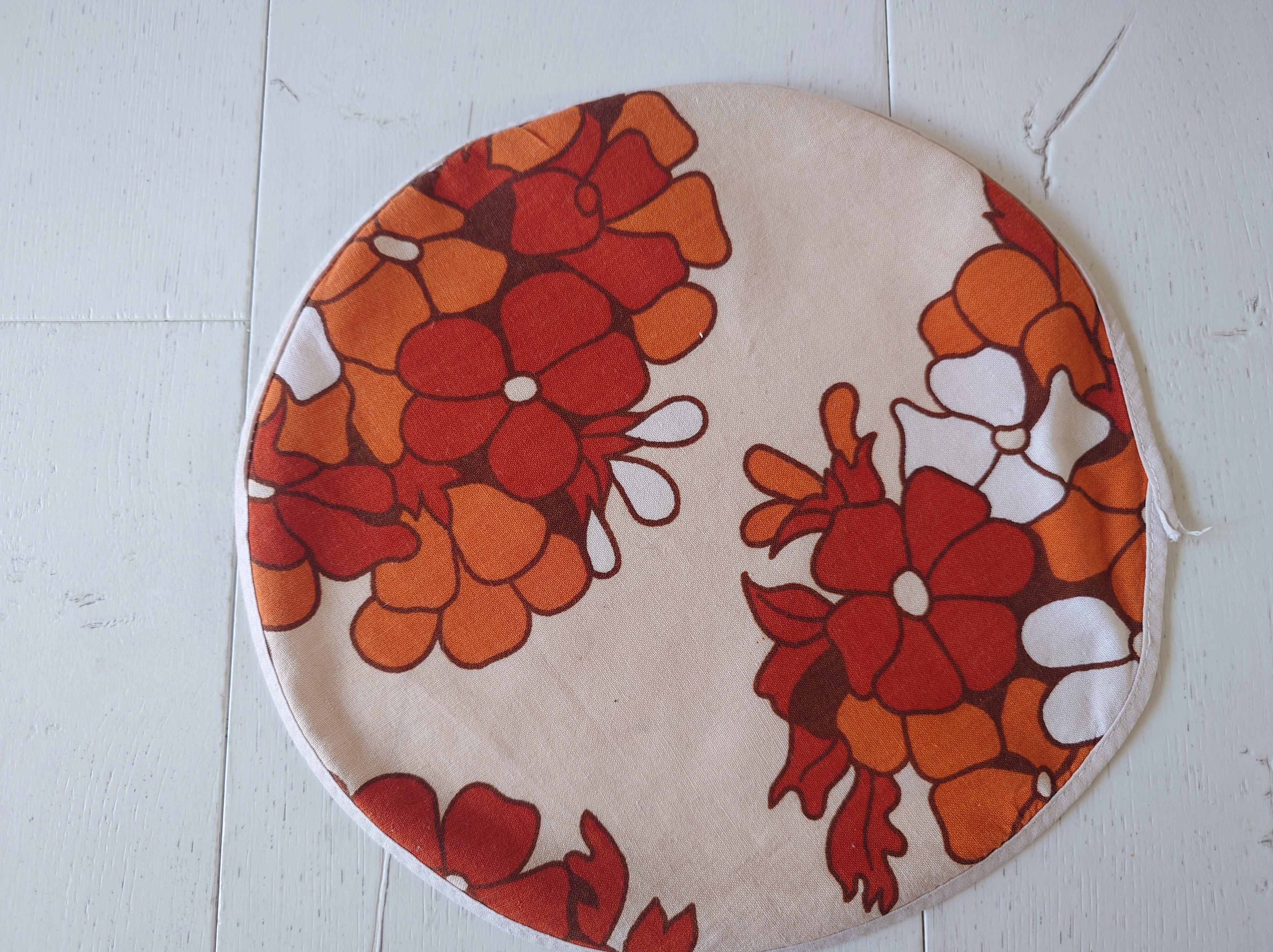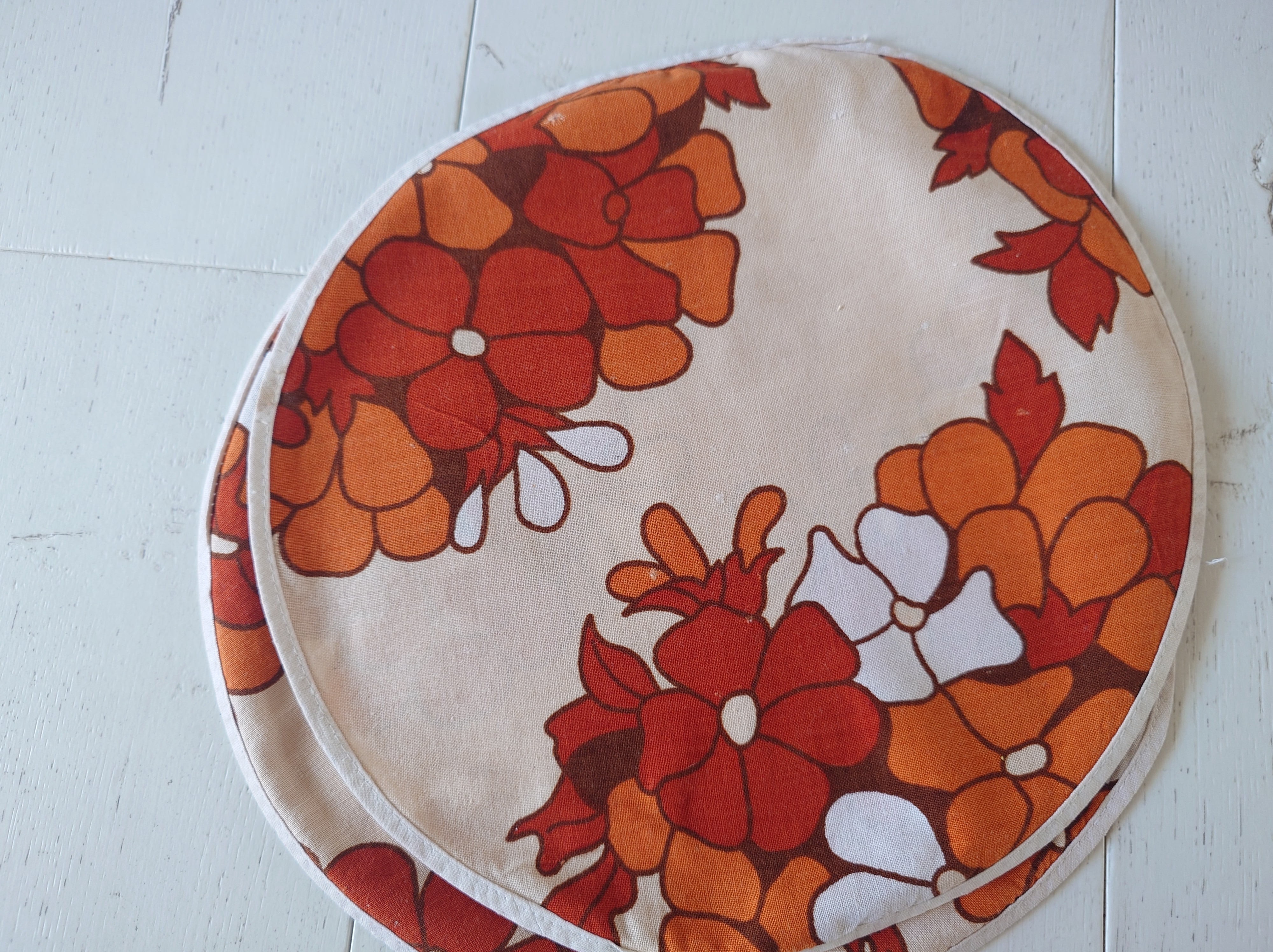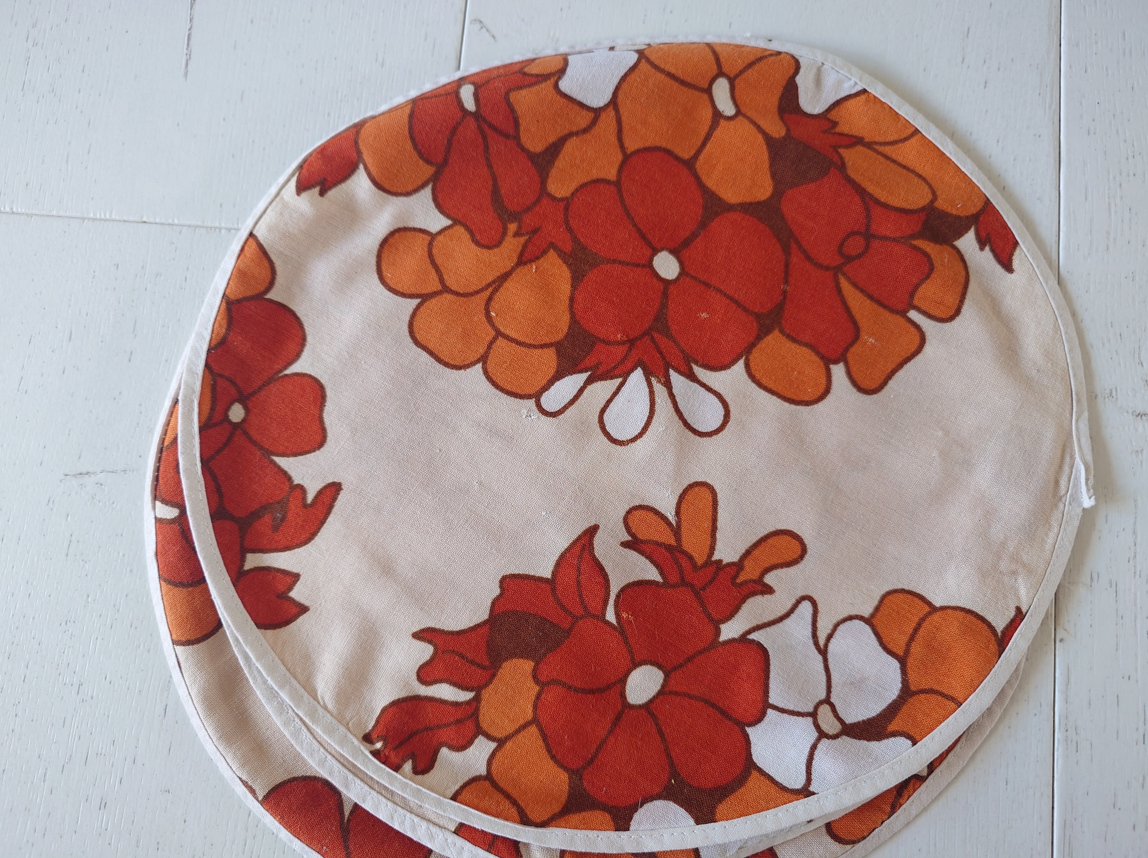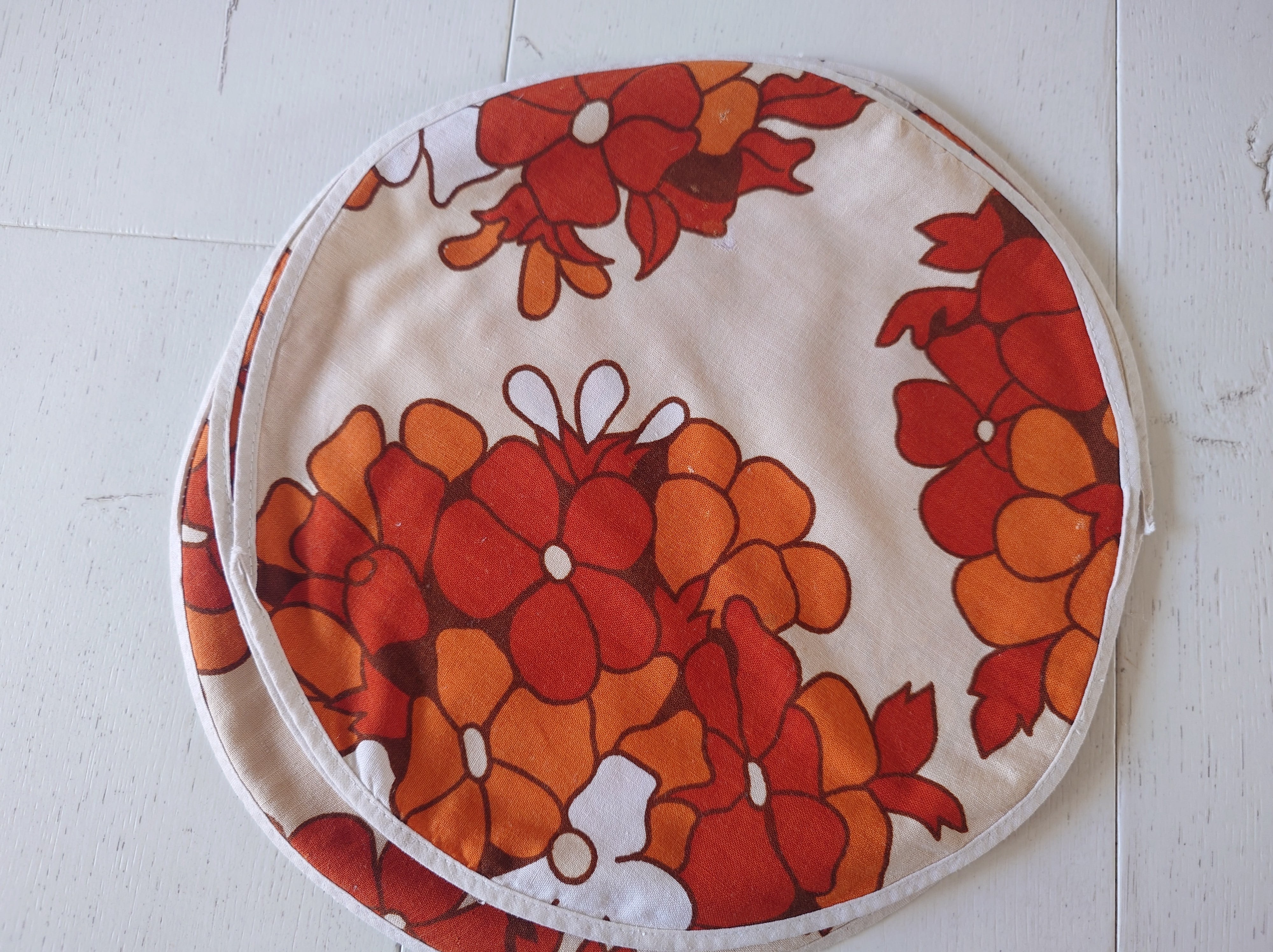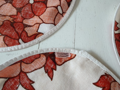 Liisa ja Matti Kodintekstiilit - valmistajan 1970-luvun ruokaliinat / tabletit puuvillaa.