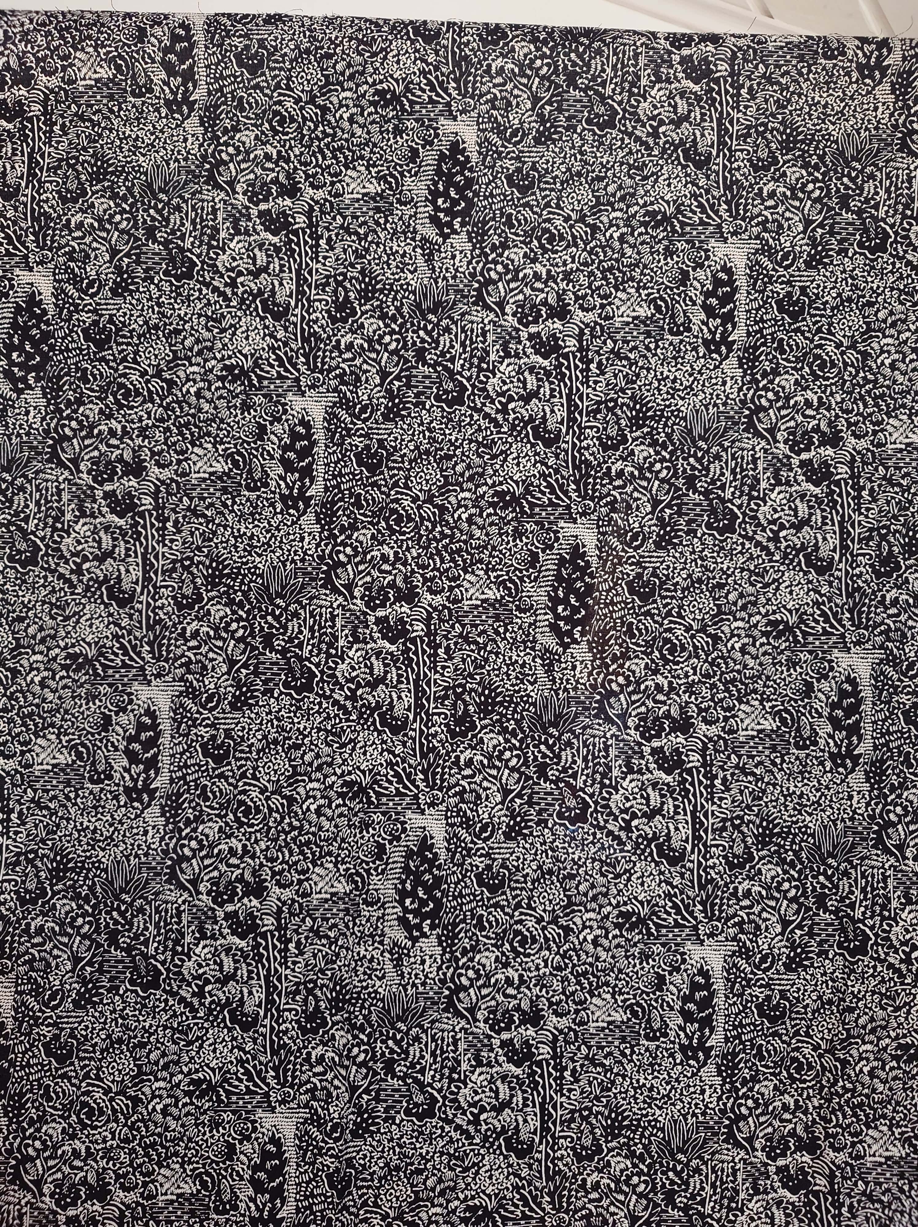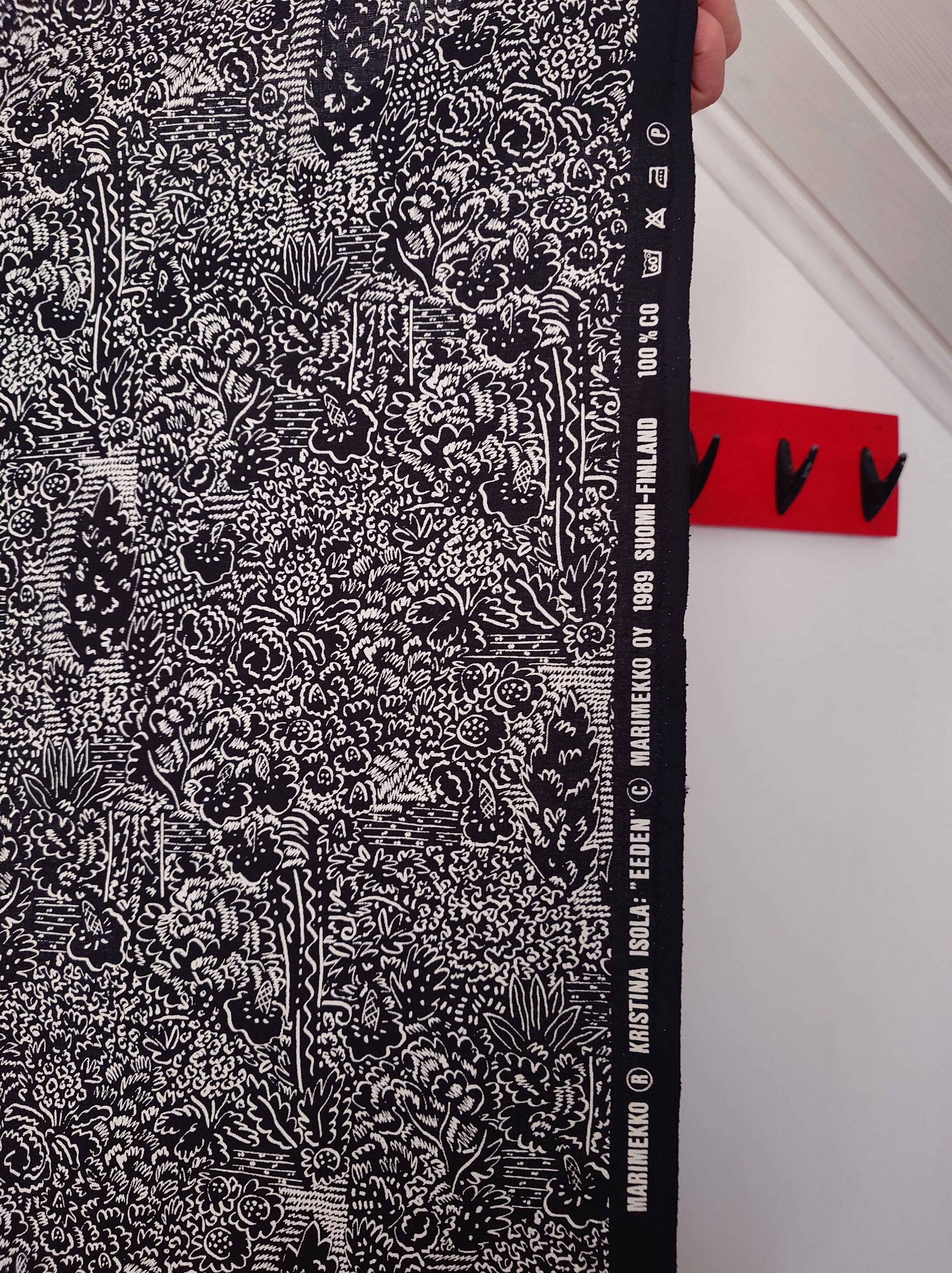 Vintage harvinainen Marimekko kangas. Mustalla pohjalla valkoiset kuviot.