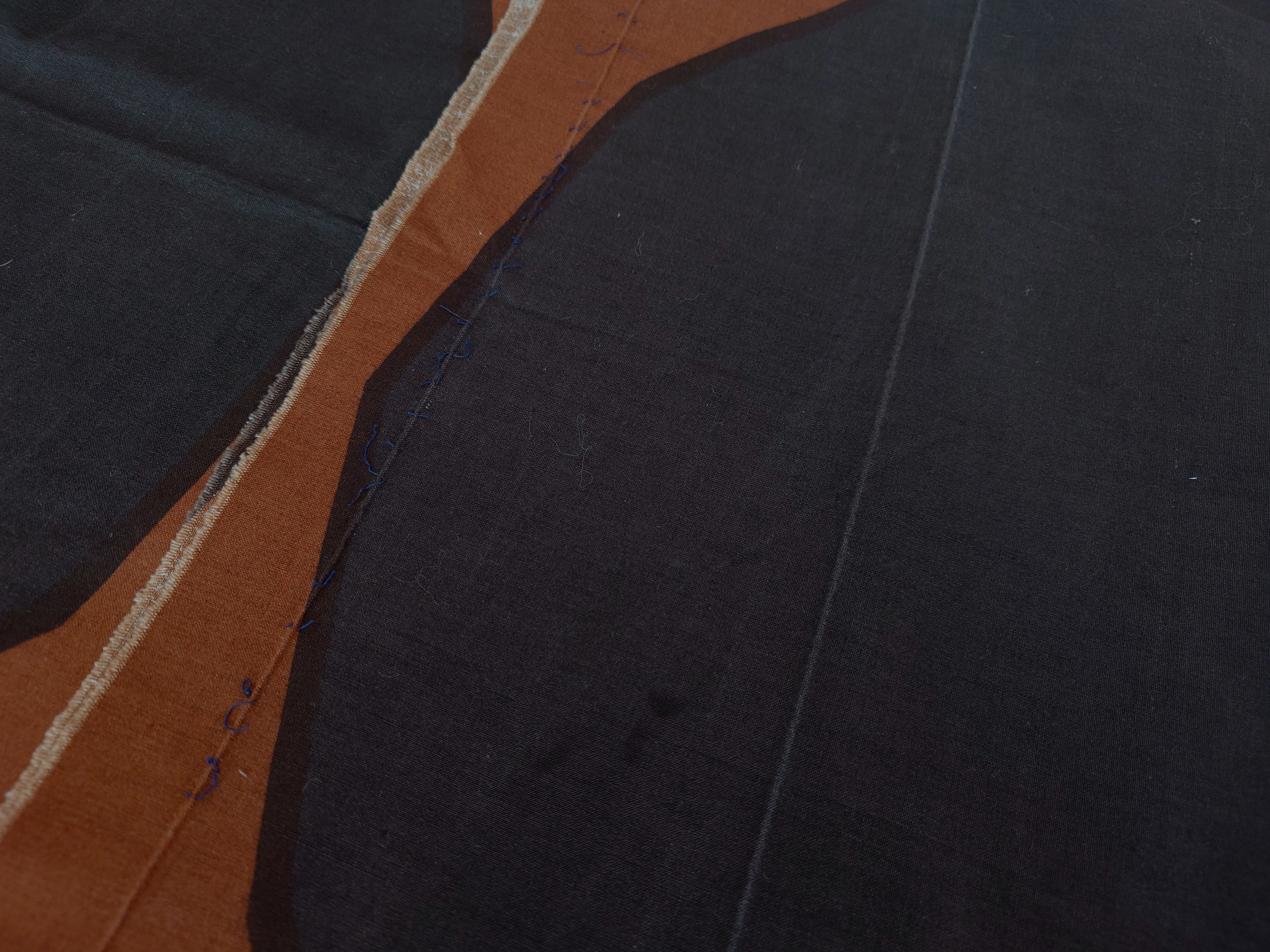Hyväkuntoinen ja ehjä. Verhon toisen leveän käänteen ommel on purettu.