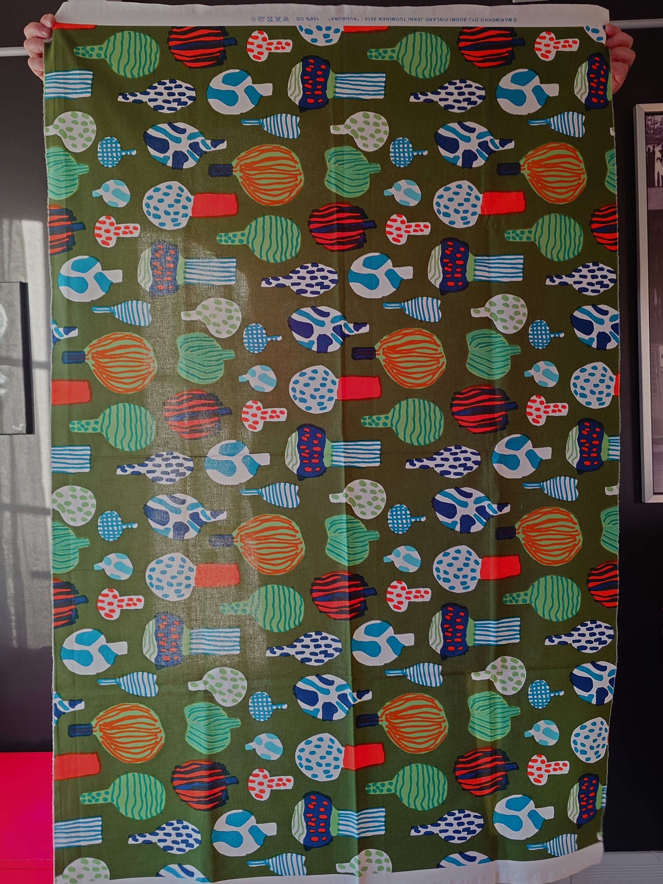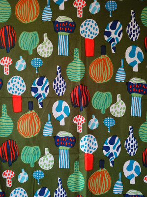 Vihreällä pohjalla värikkäitä kuvioita. Puuvillaa.