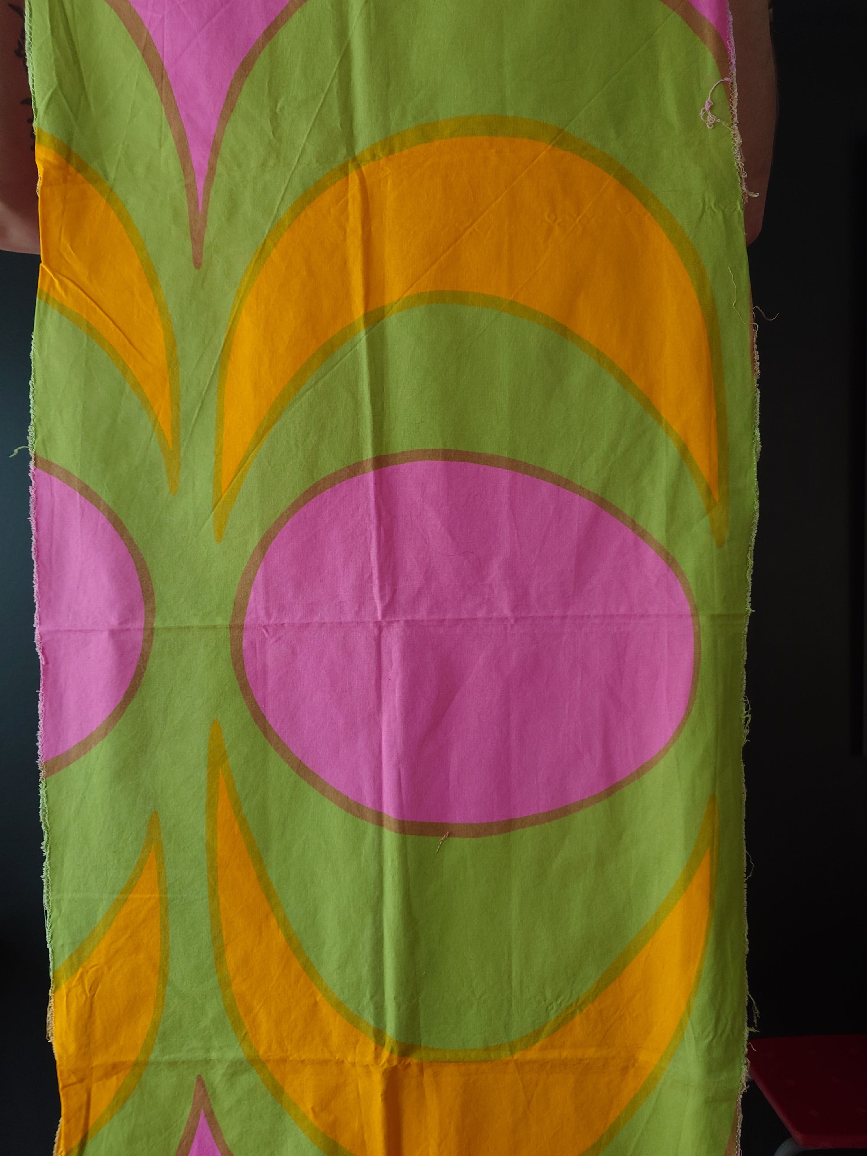 Vintage puuvillakangas, jossa on vihreää, pinkkiä ja oranssia.