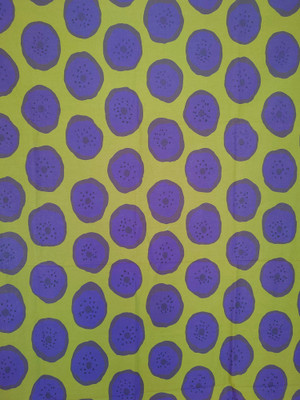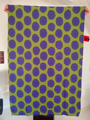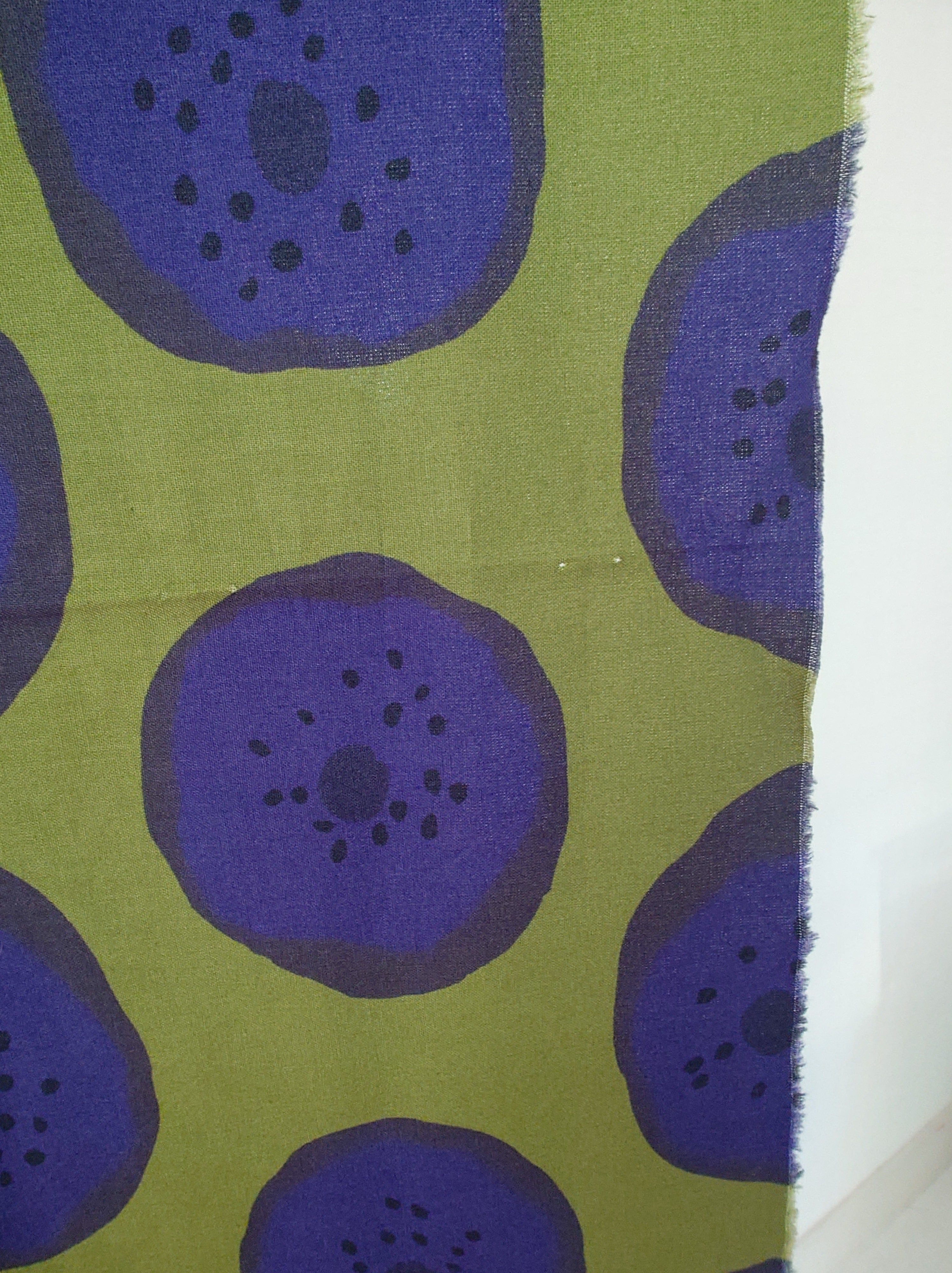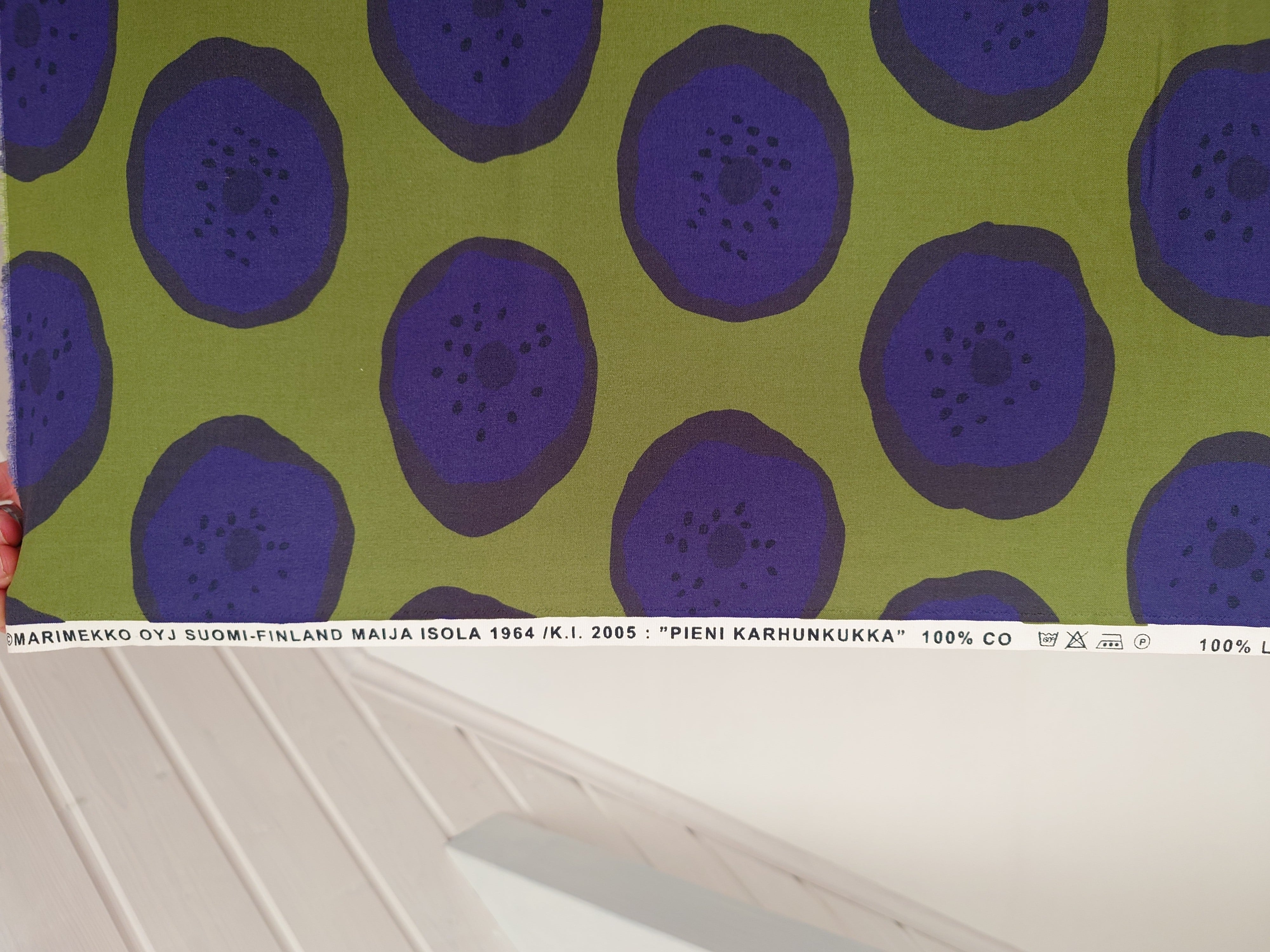 Maija Isolan suunnittelema 1964 vihreä lila "pieni karhunkukka" kuosi. Tämä kangas on painettu 2005.