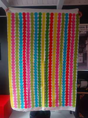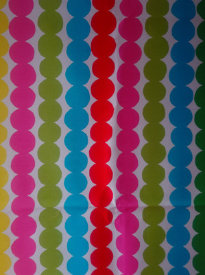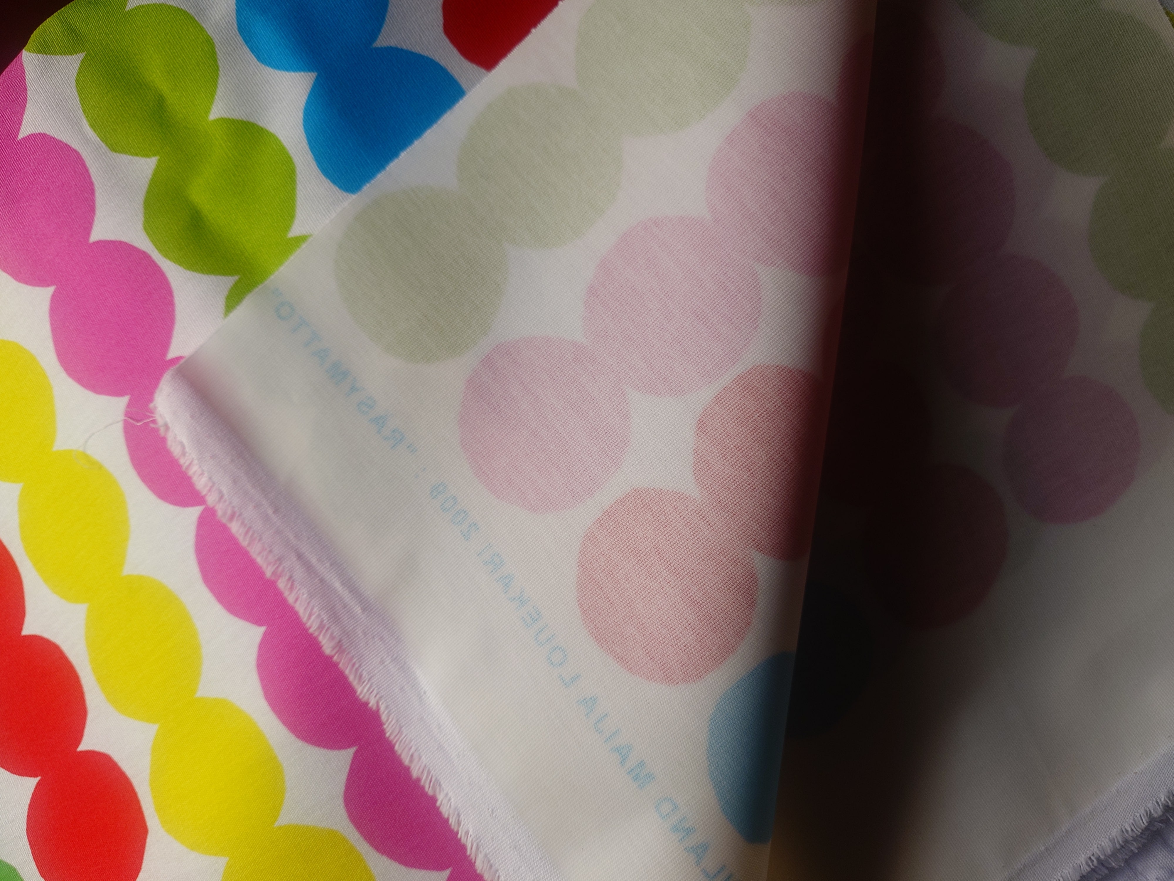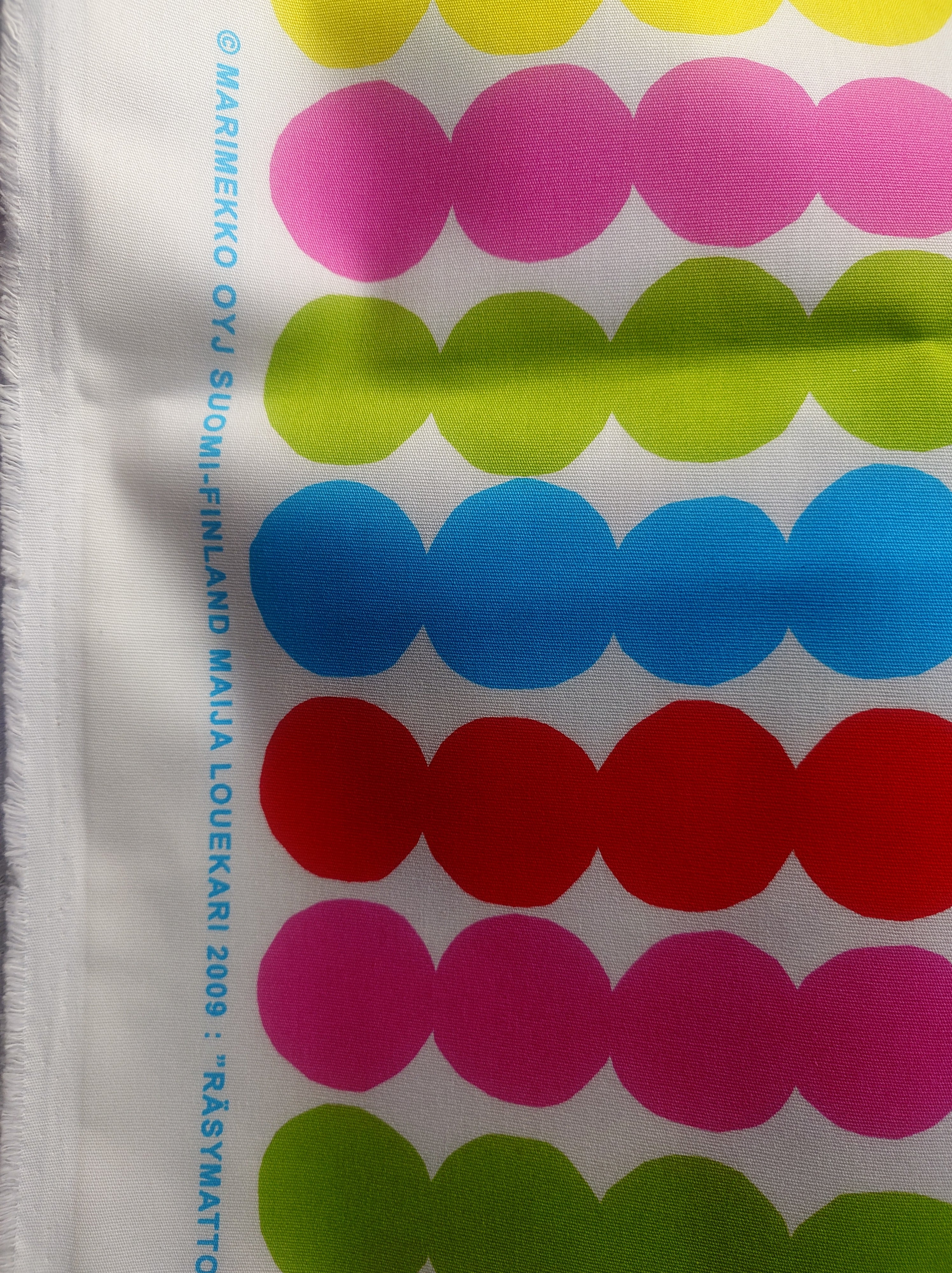 Marimekko Finland Maija Louekari 2009 "Räsymatto" painatus sivussa.
