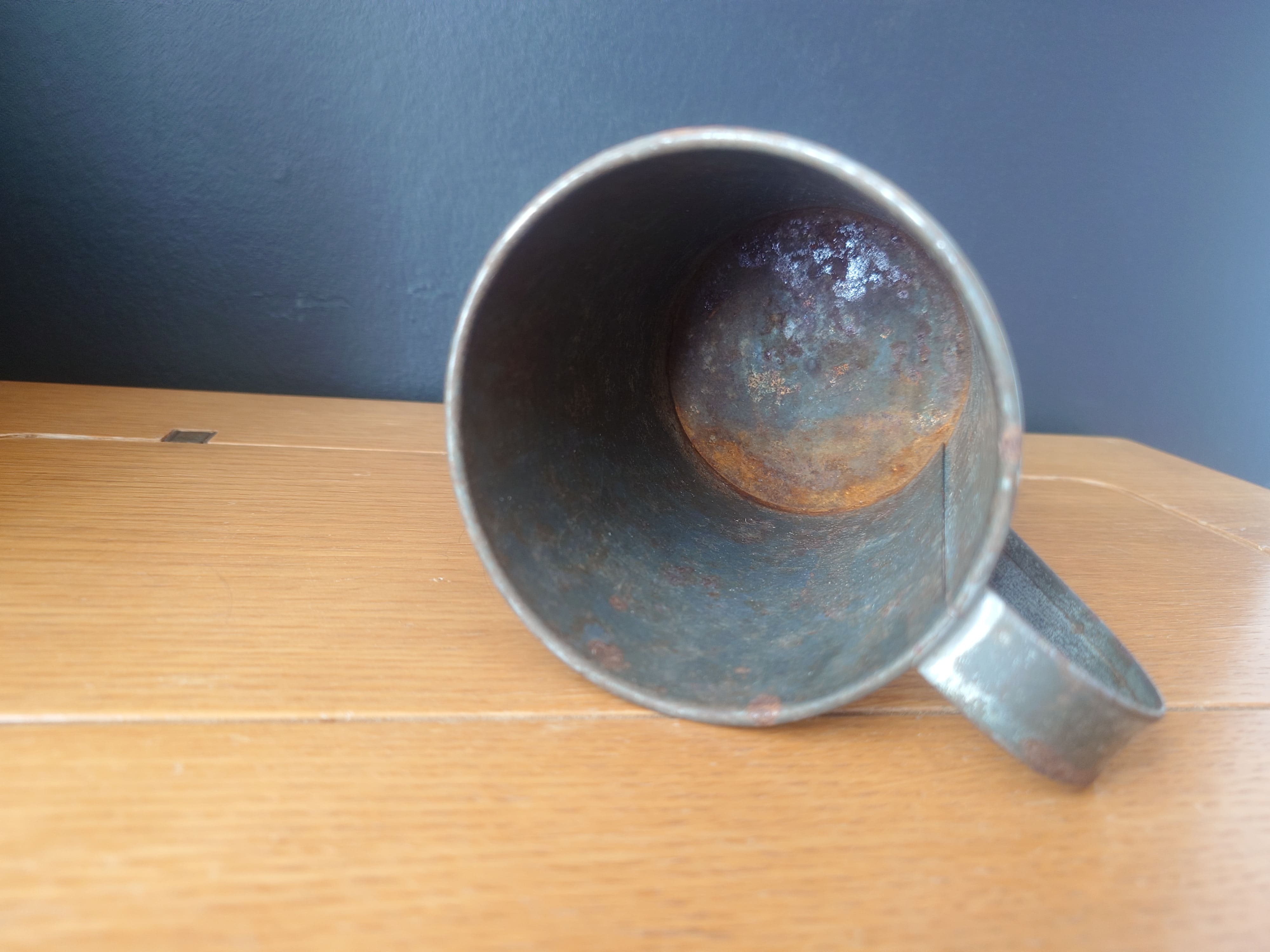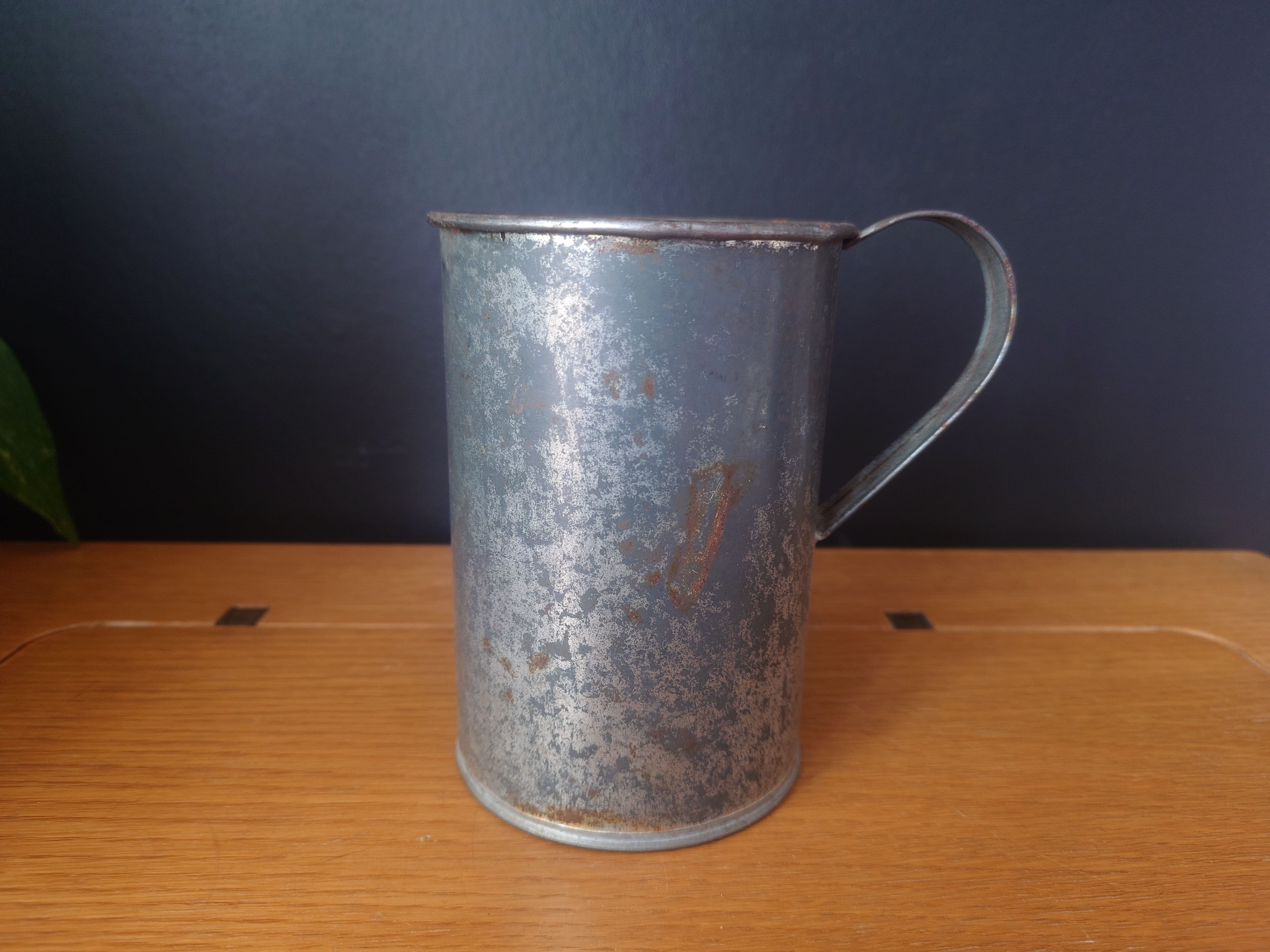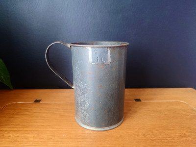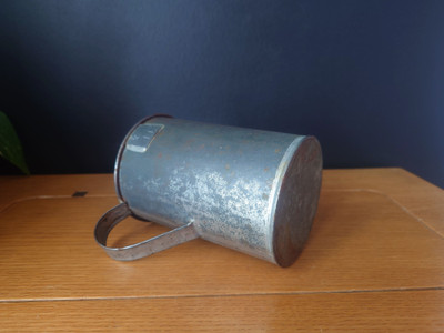 Vanha peltinen litran mitta, joka on voinut olla käytössä esim marjanmyyjän mittana torilla.