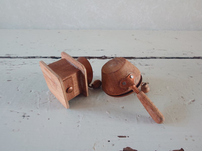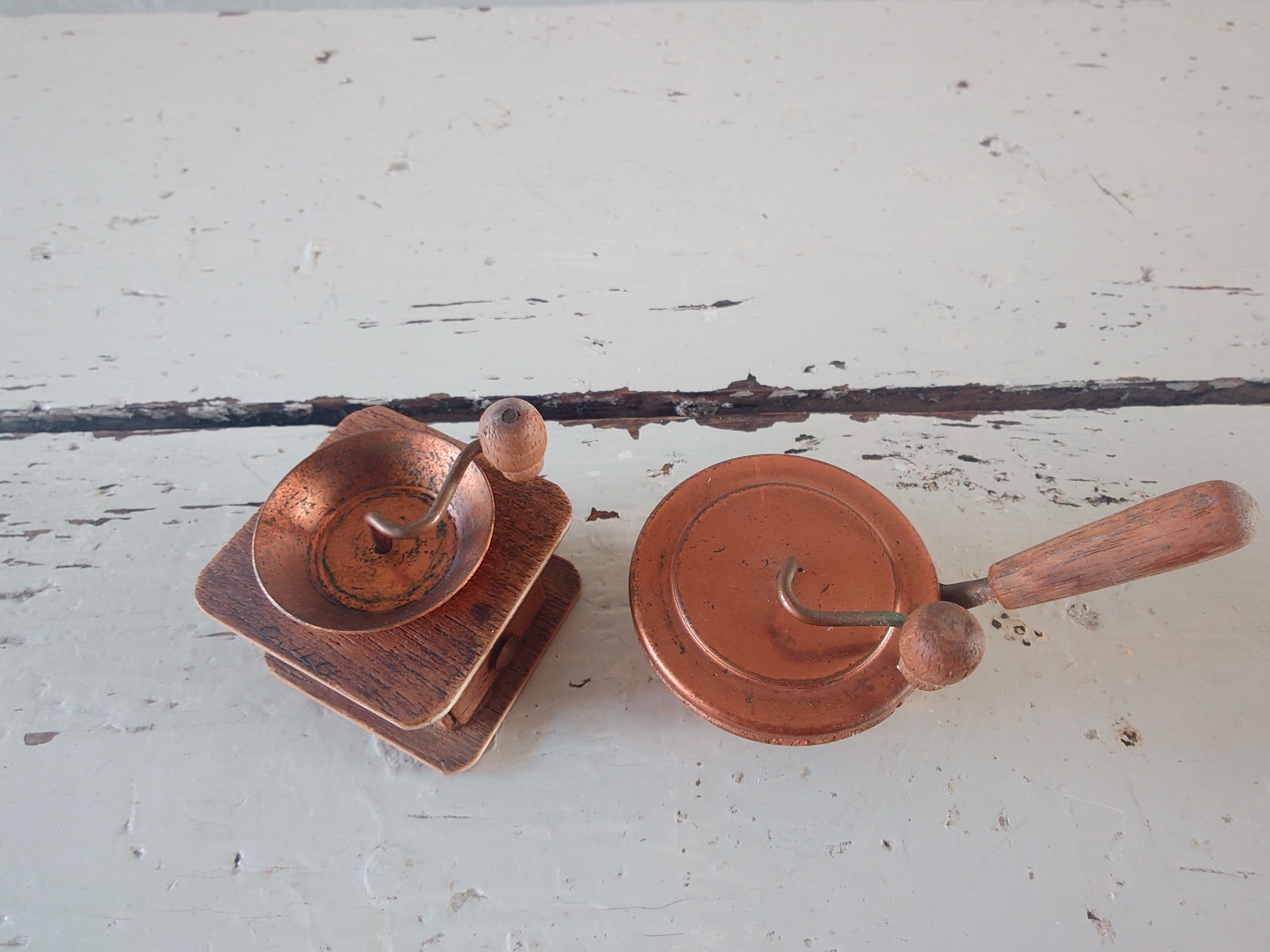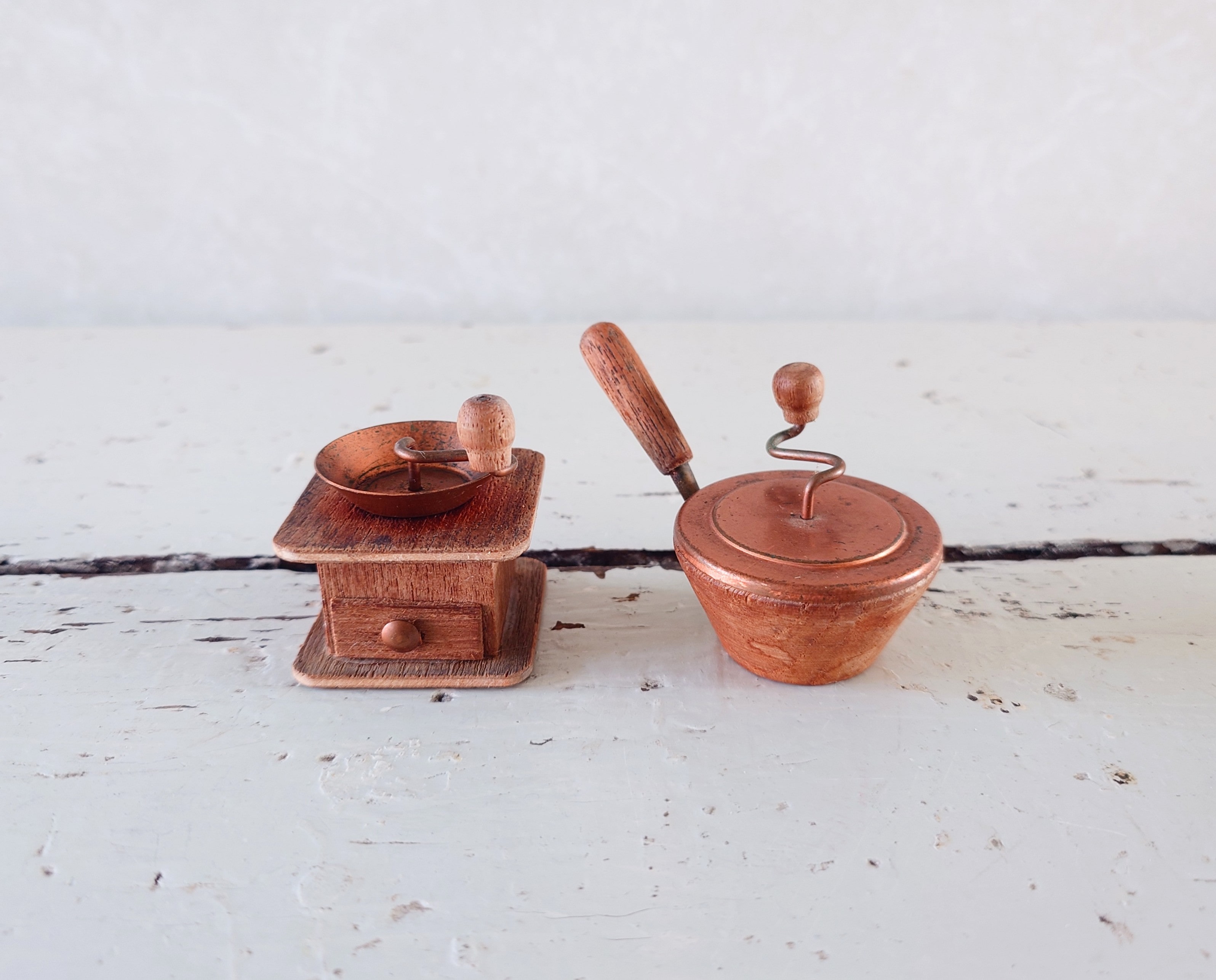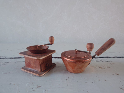 Vanhat pikkuruiset kahvin valmistusvälineet nukkekotiin tai koristeeksi. Kahvimylly ja kahvipapujen paahdin eli rännäri.