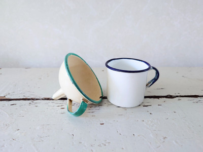 Pikkuinen emalisuppilo. Vaalea beessi, vihreät reunat. Kunto hyvä. Pienet kulumat reunassa ja putken päässä. Halkaisija 8,8 cm ja korkeus 7 cm.