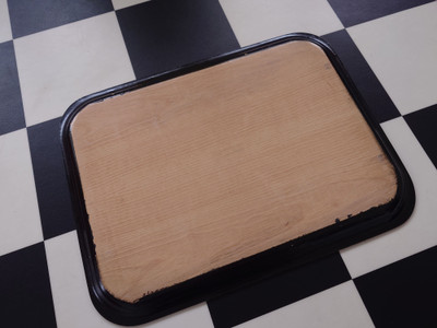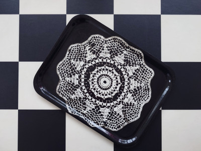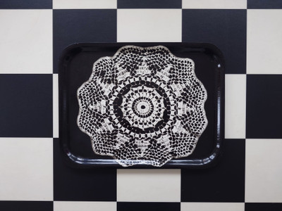 Vanerinen tarjotin. Mustaan pintaan on painettu valkoisen pitsiliinan kuva.