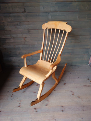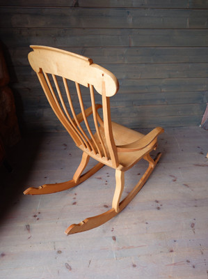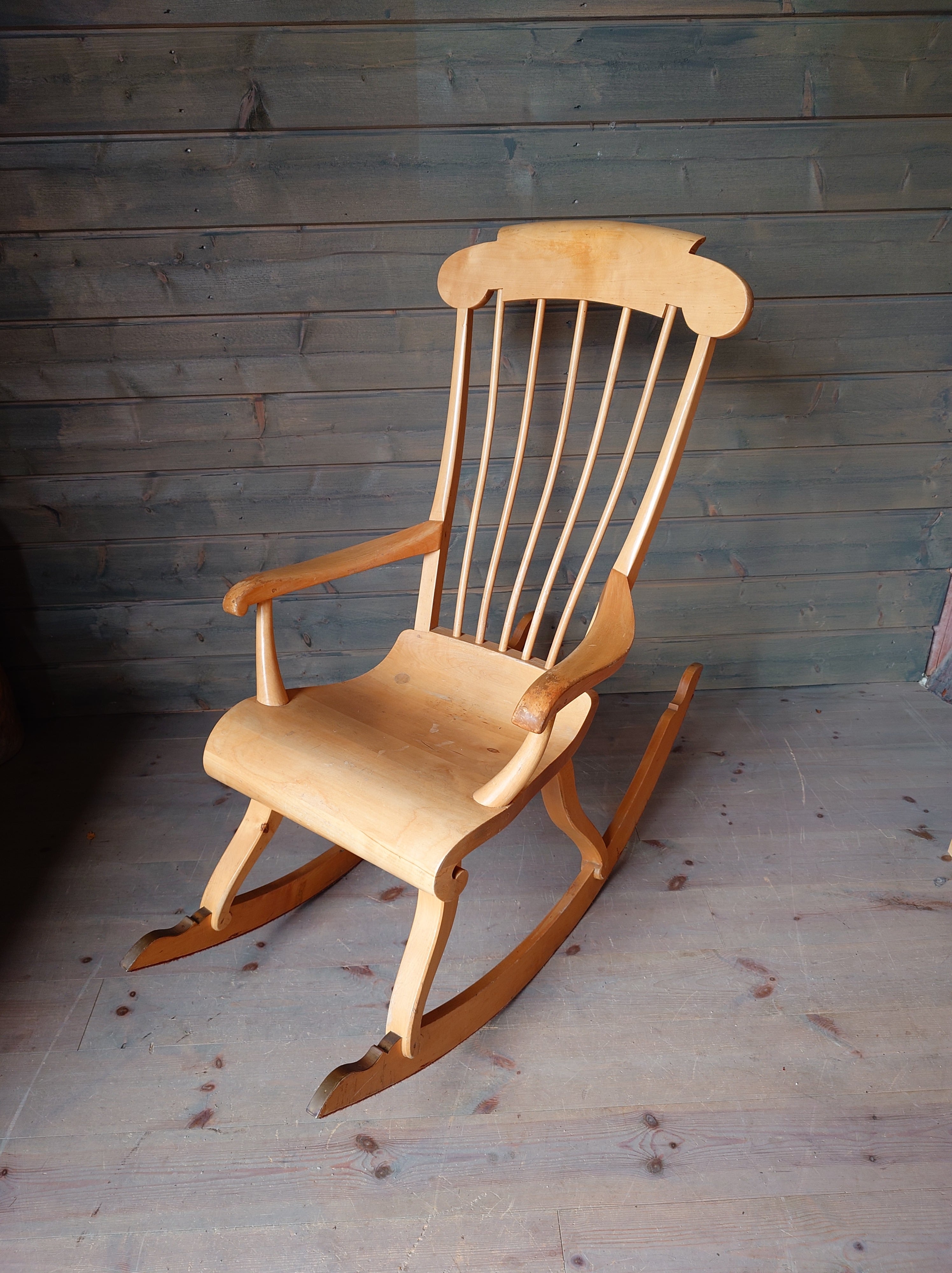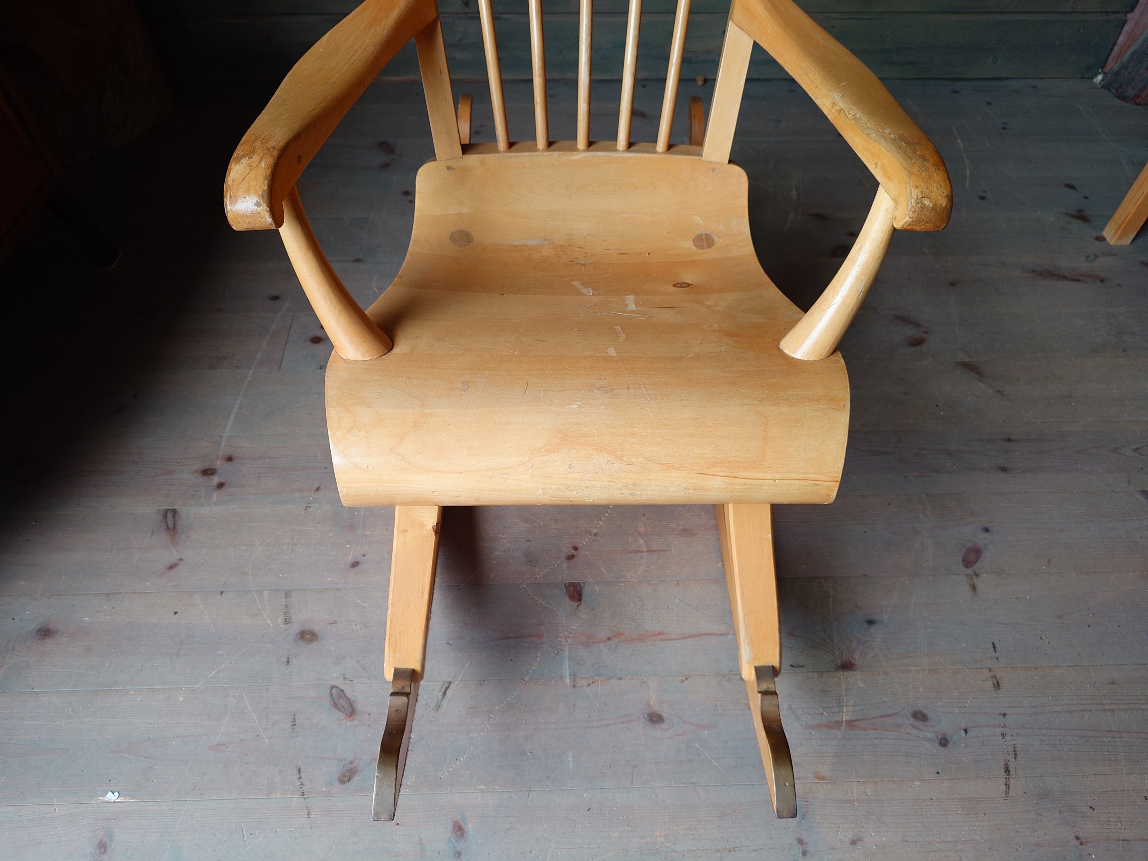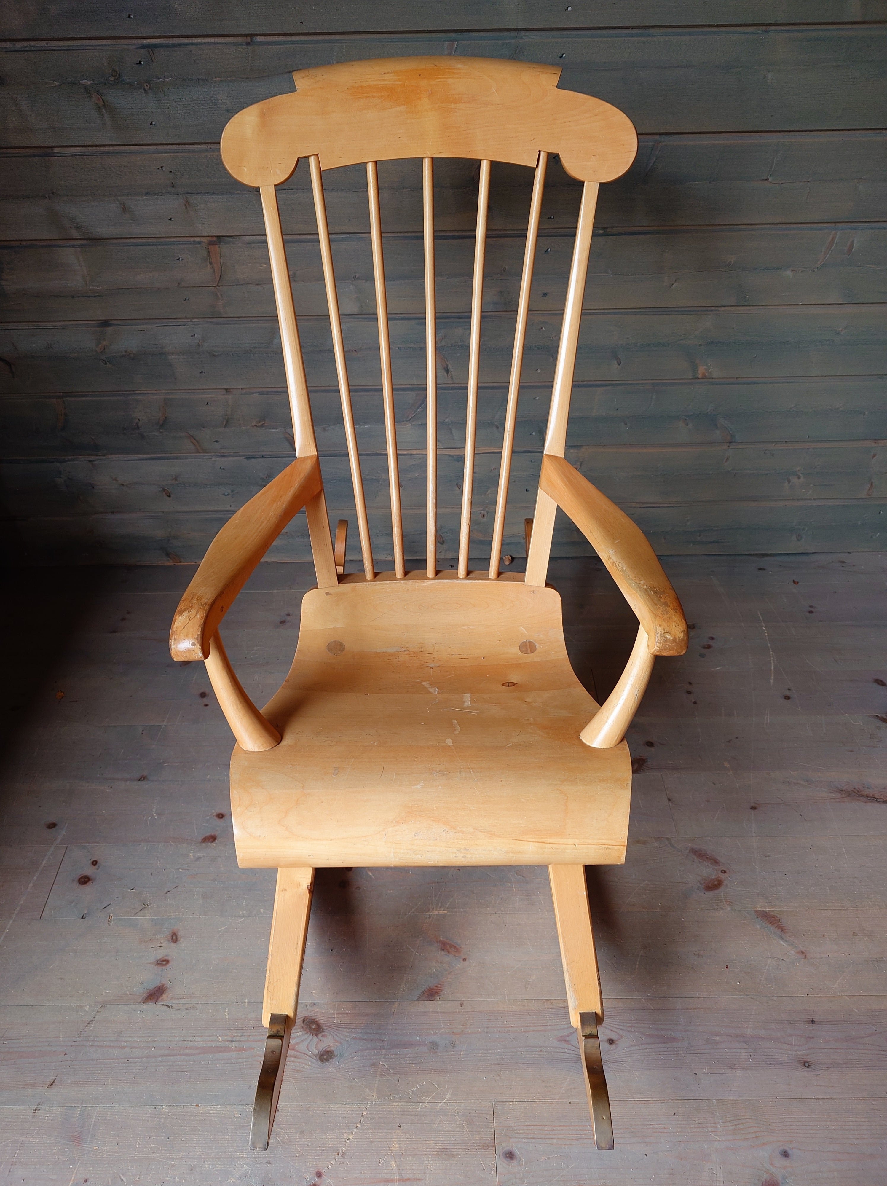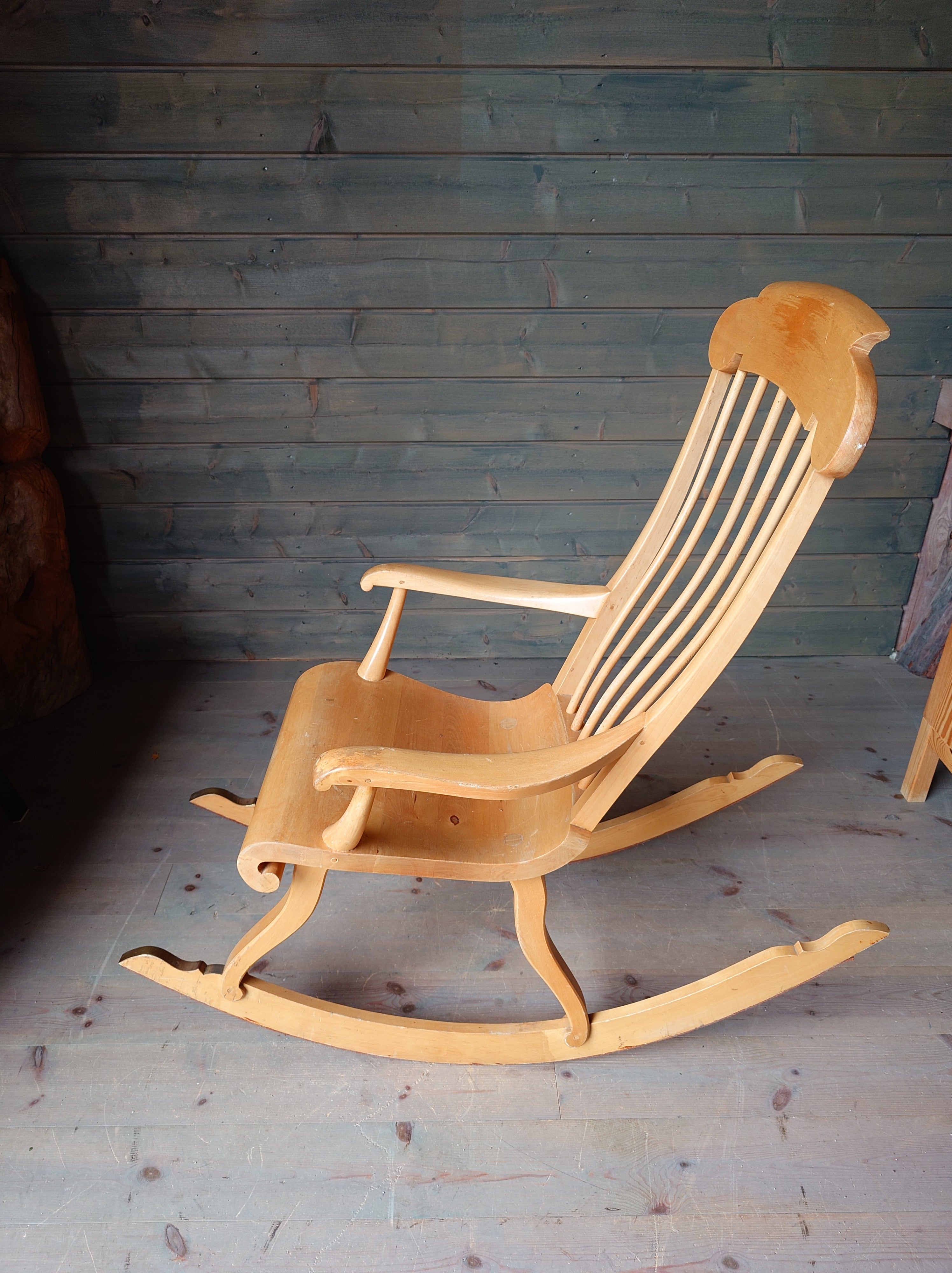 Keinutuoli on tukeva ja hyväkuntoinen. Istuimen päällä muutama raapu ja vähän kulumaa käsinojien päässä.