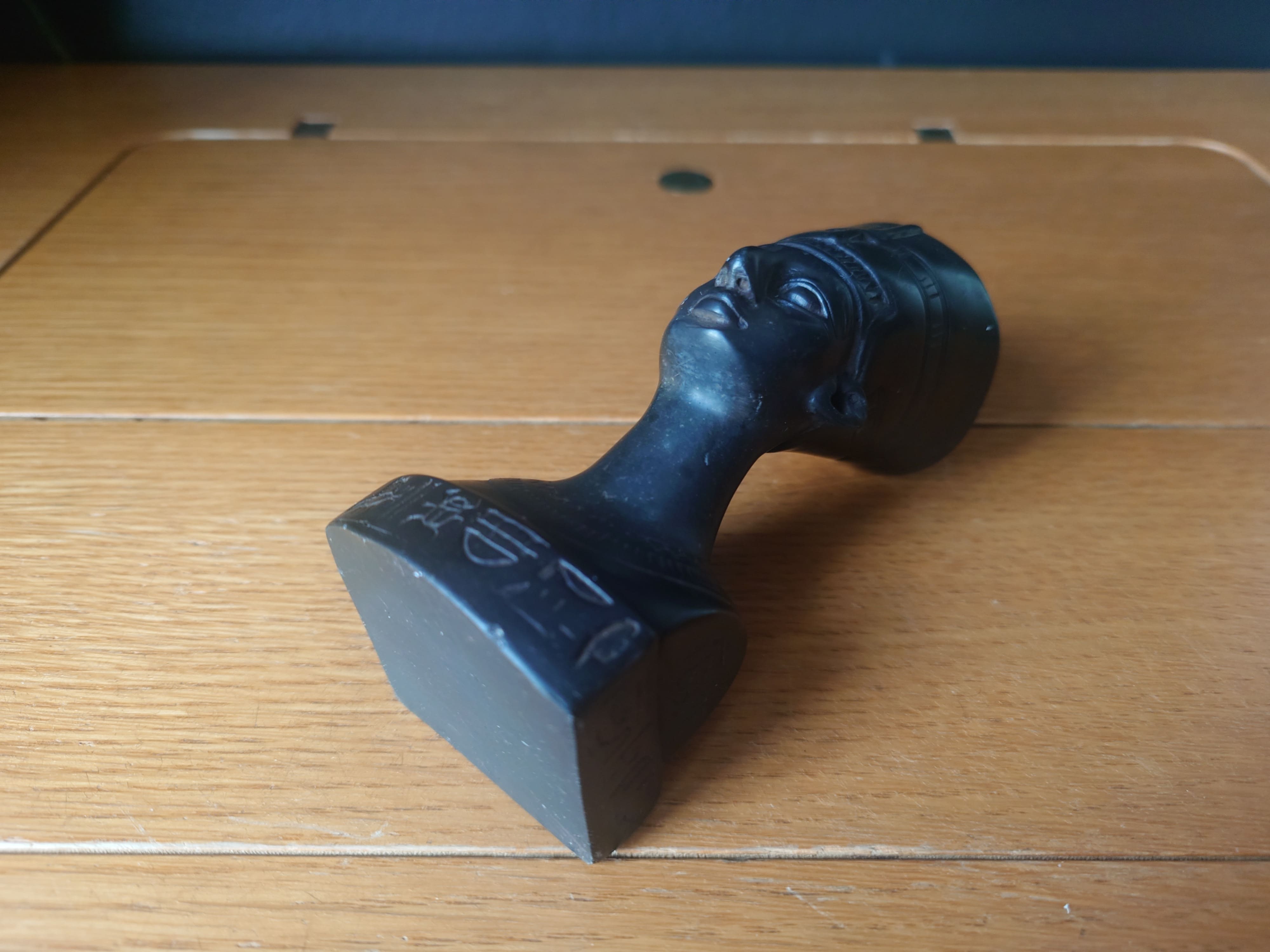 Tummasta kiviaineksesta tehty pieni vanha patsas. Egyptin kuningatar Nefertiti.