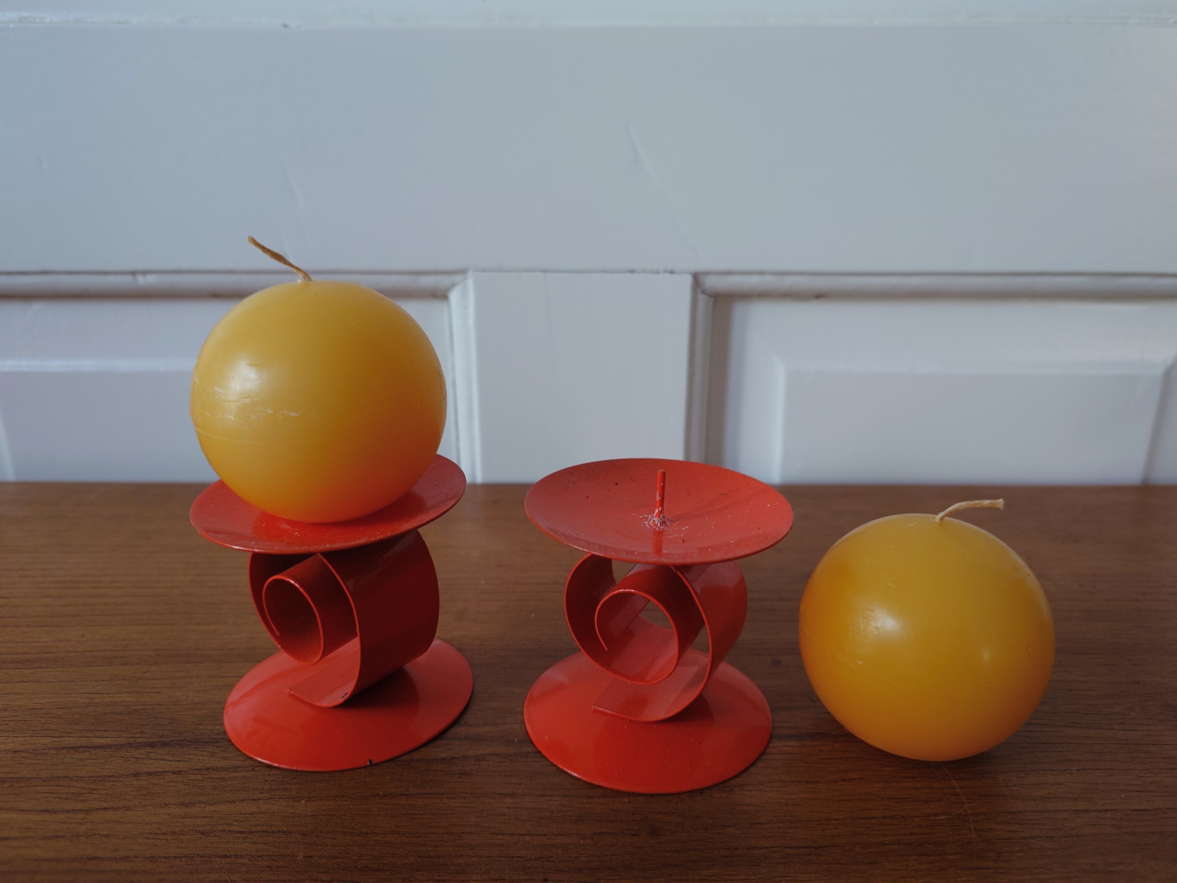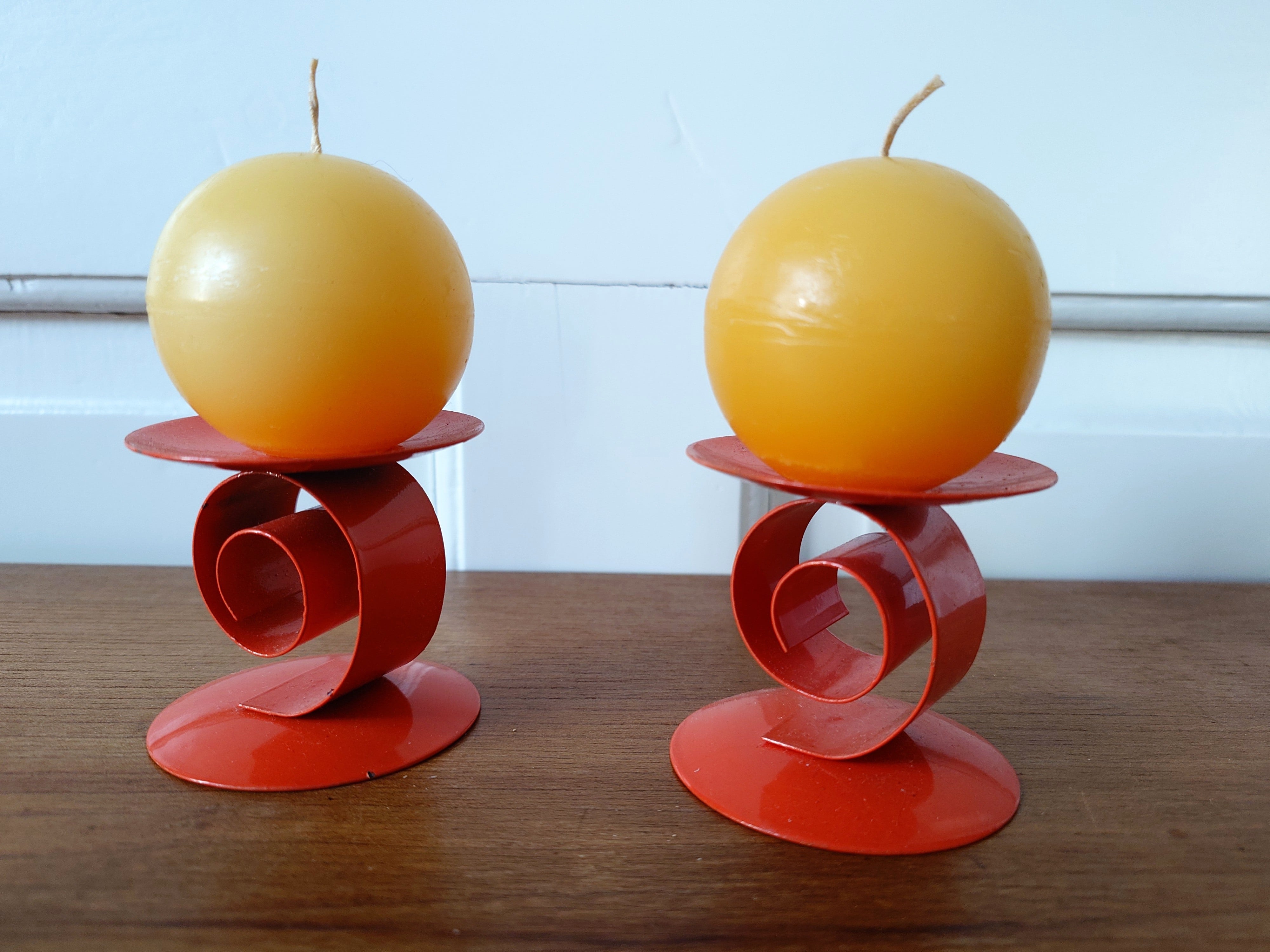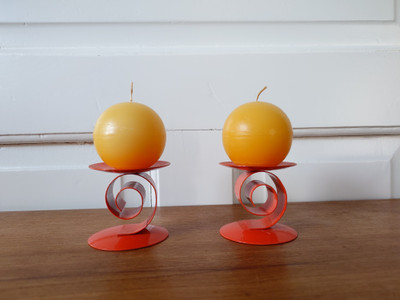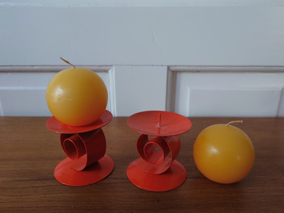 Metalliset oranssit kynttilänjalat ja keltaiset pallokynttilät. Kynttilä painetaan kiinni jalassa olevaan piikkiin.