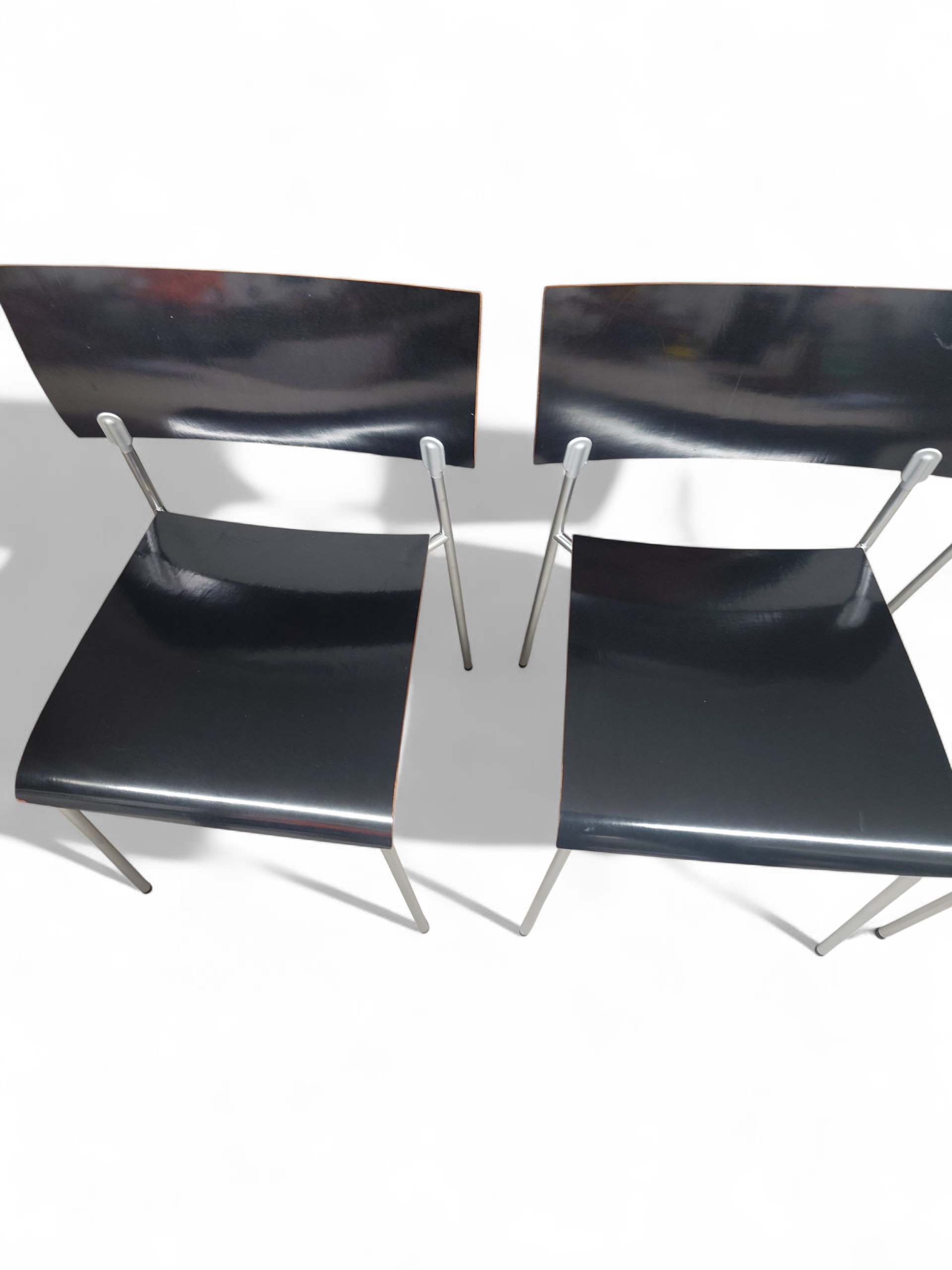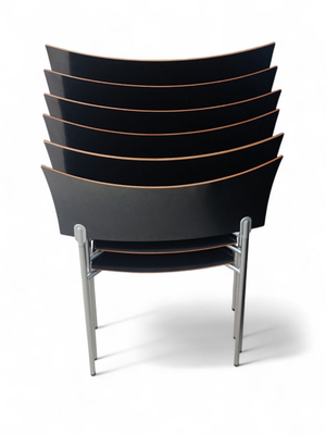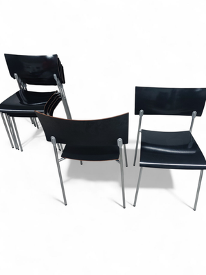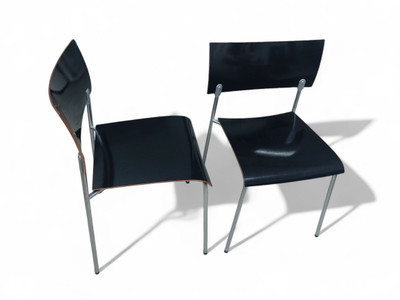 Sirot ja kevyet. Ohutta kaarevaa koivuvaneria ja kromattu metallirunko. Musta kiiltävä väri. Piiroinen painatus pohjassa.