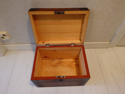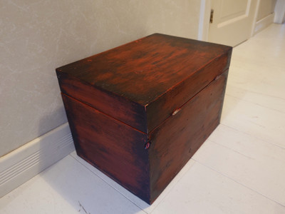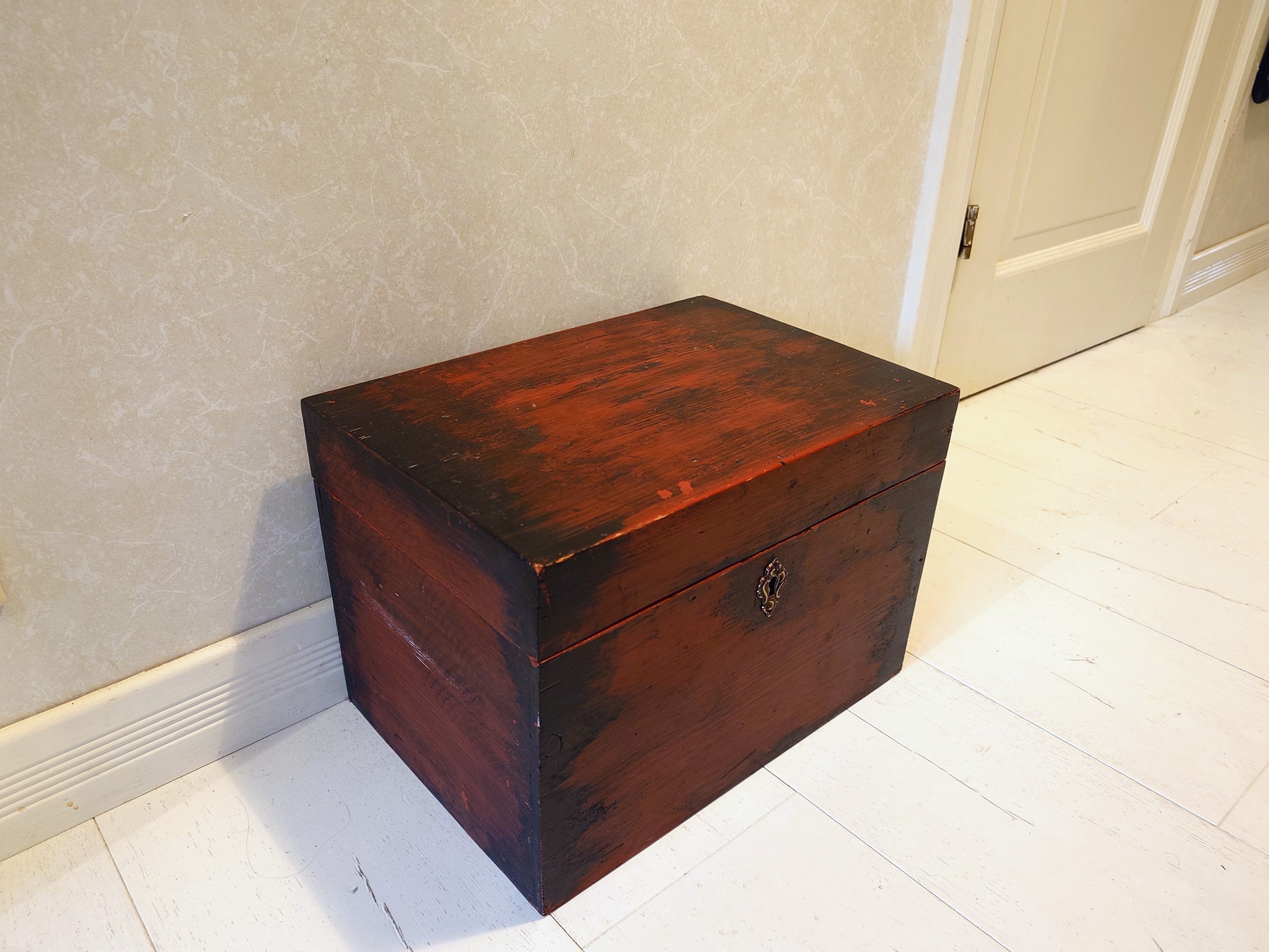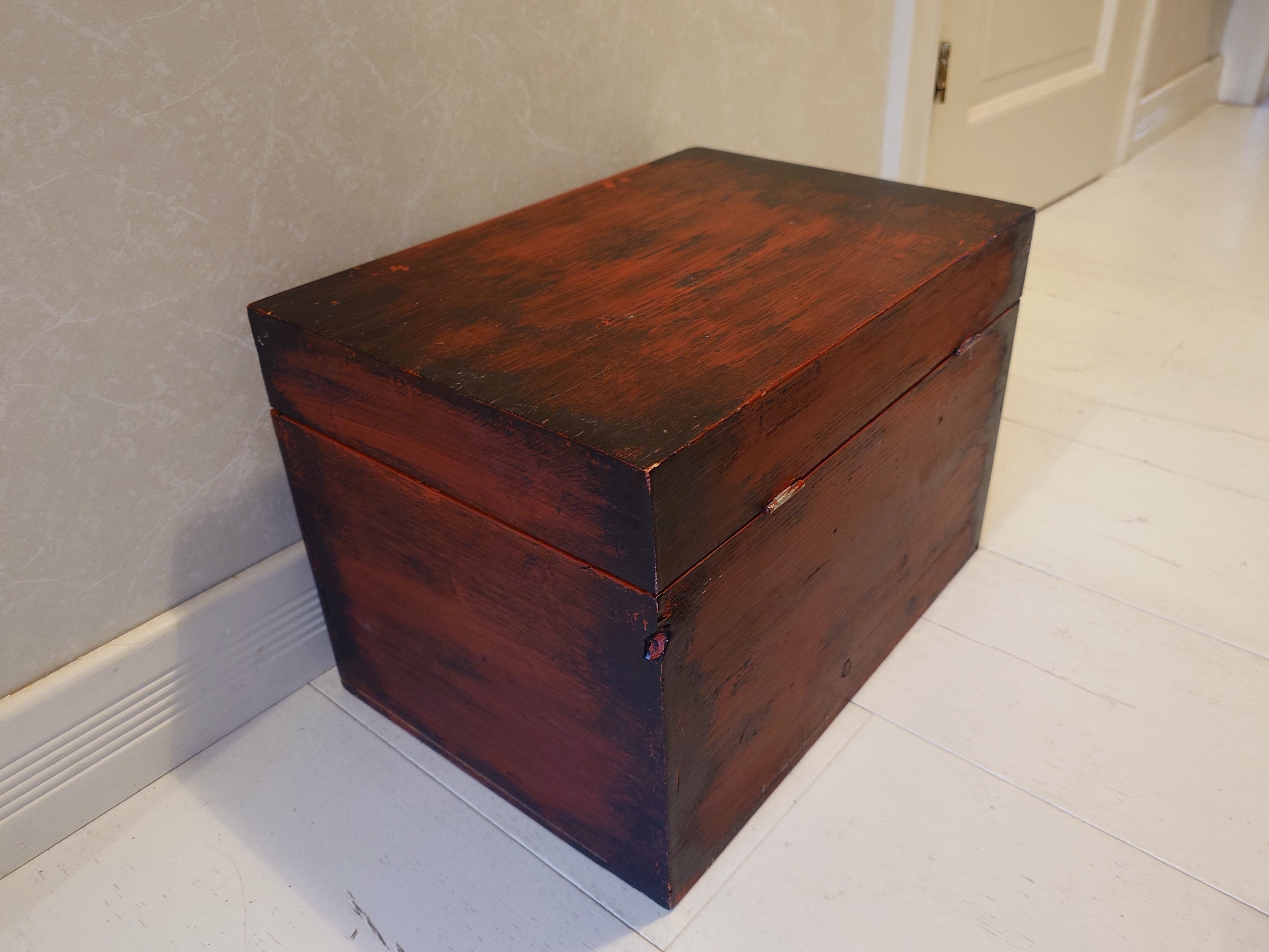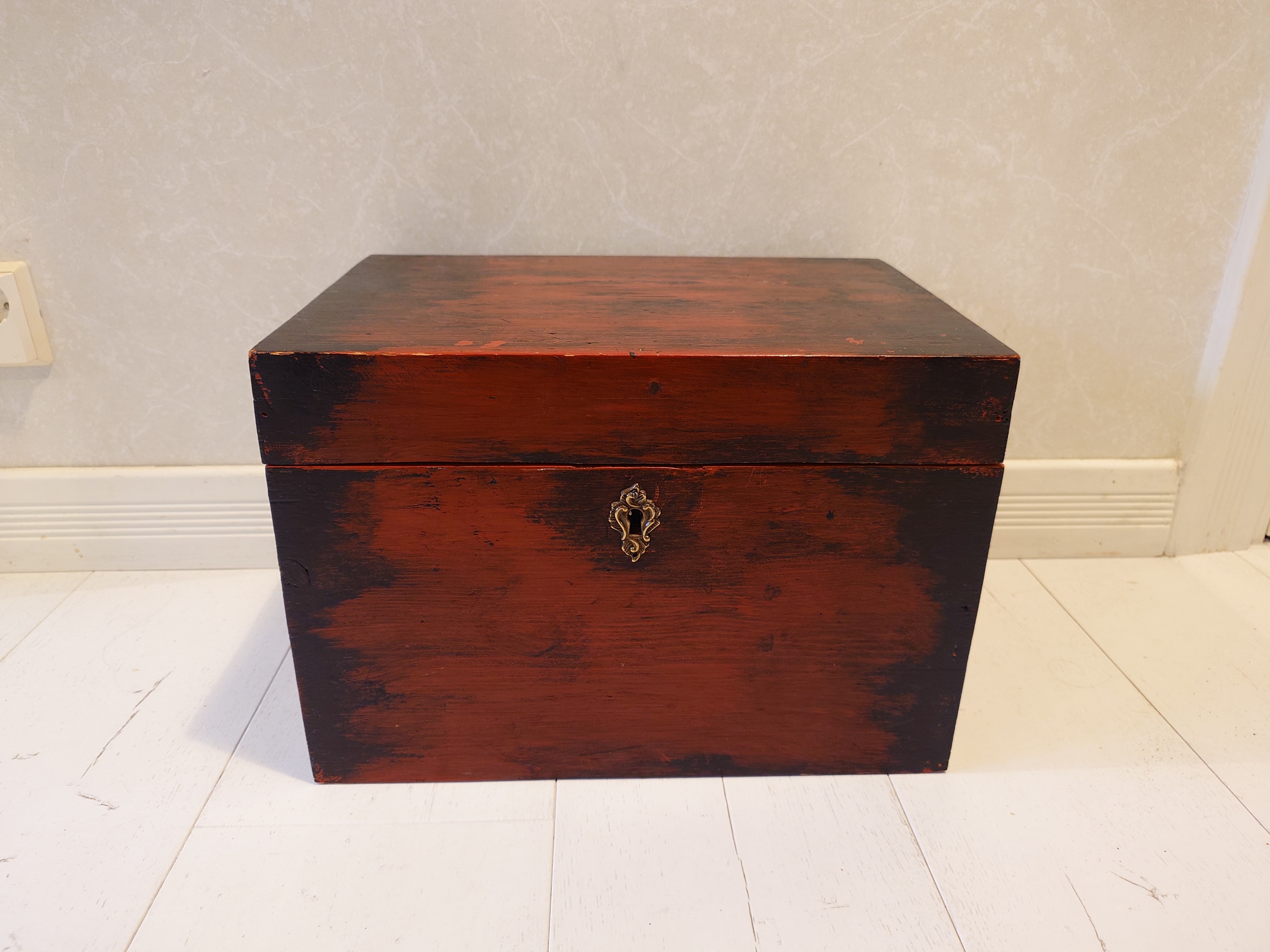 Vanhan näköiseksi petsaamalla käsitelty puinen arkku.