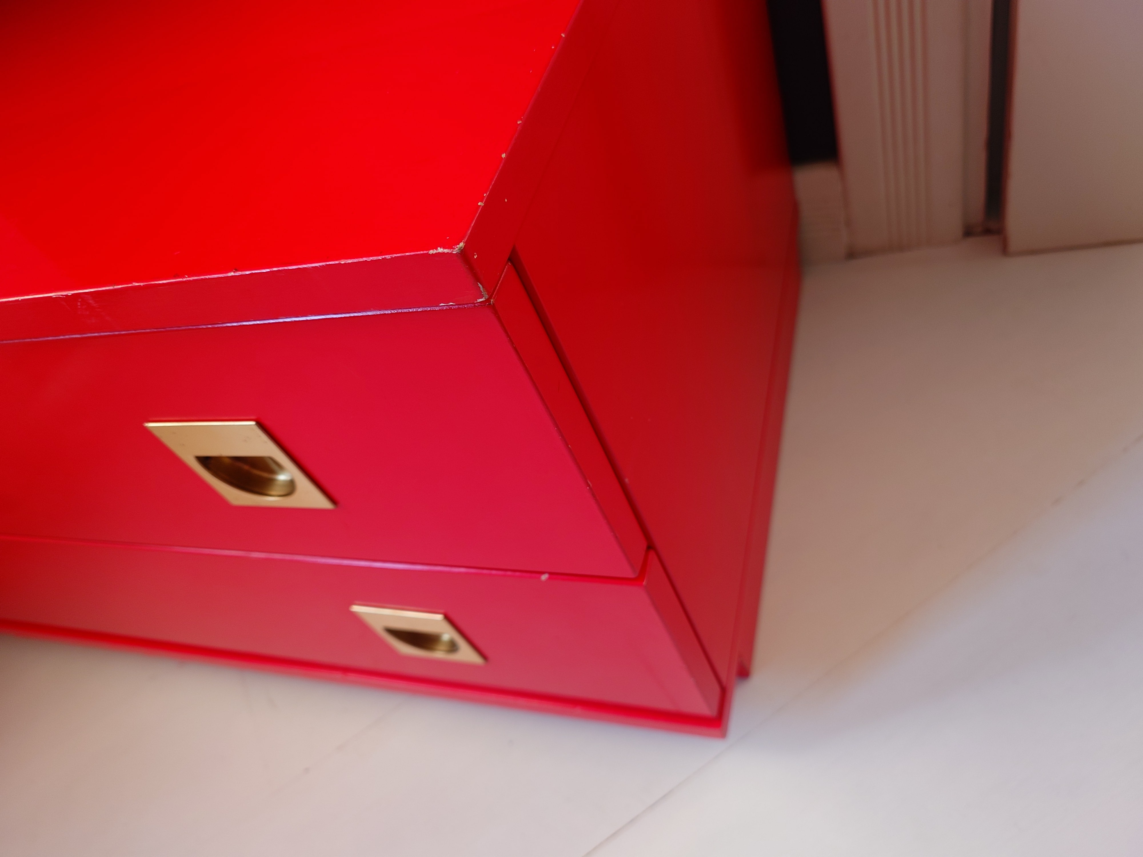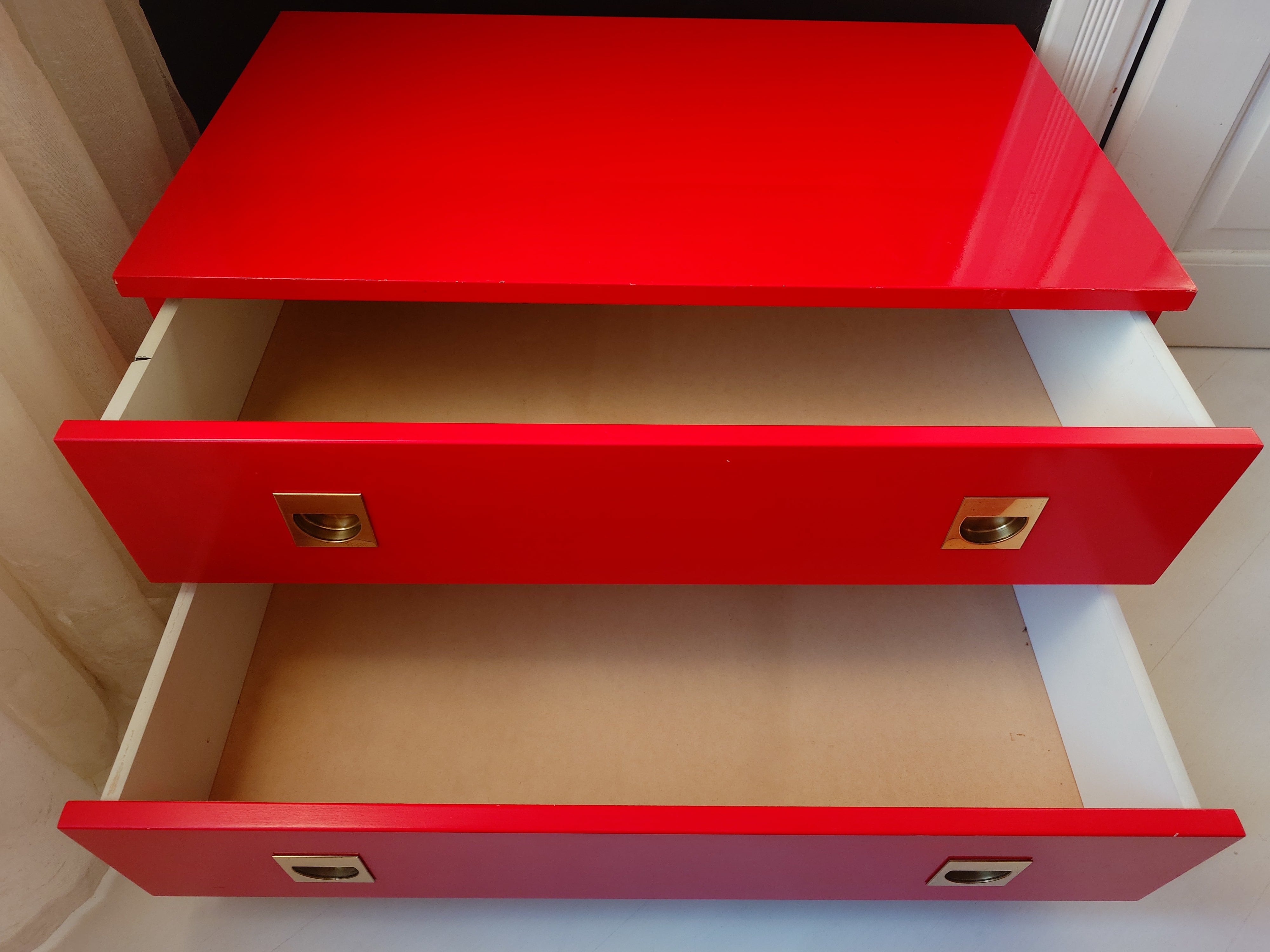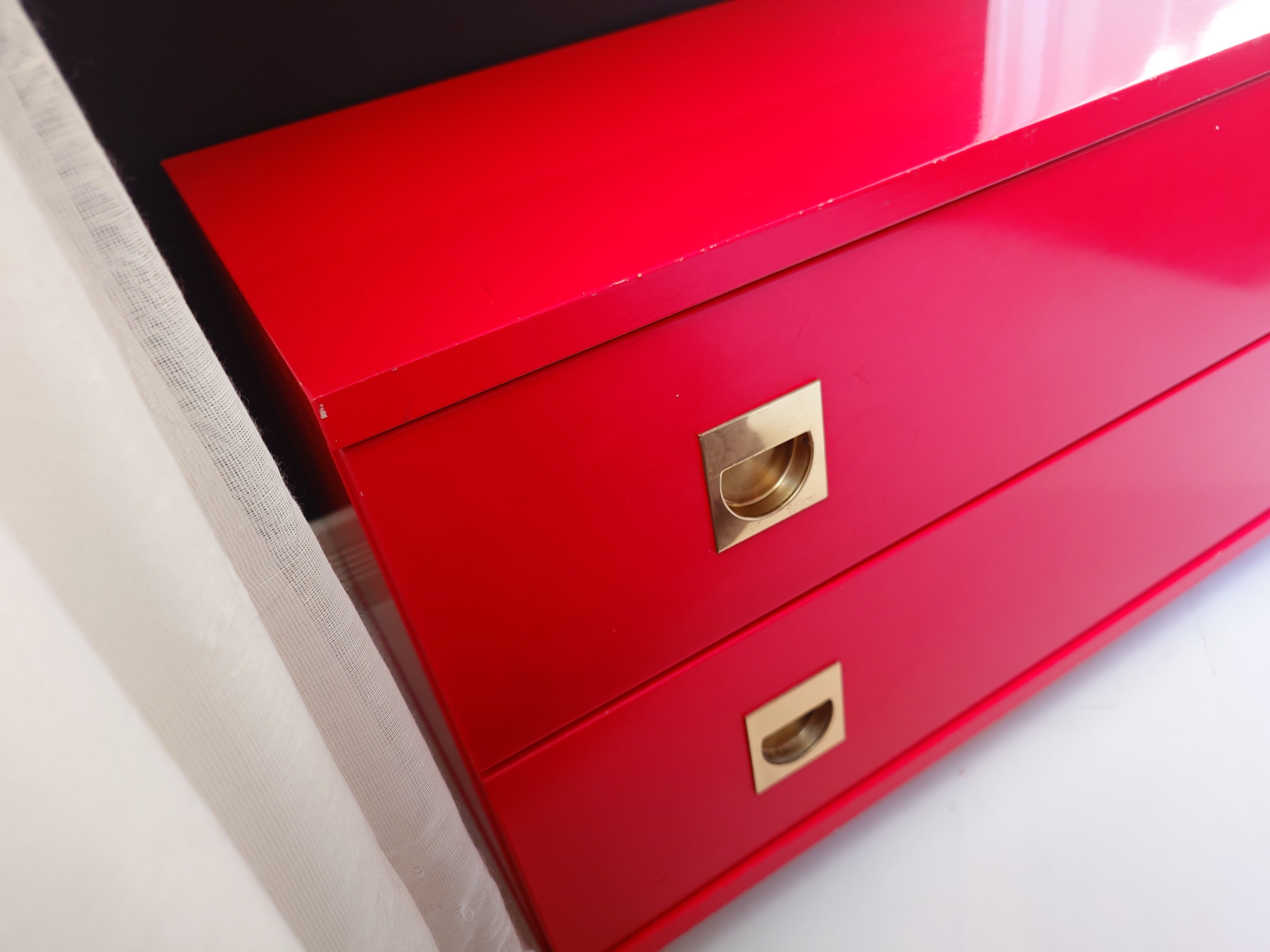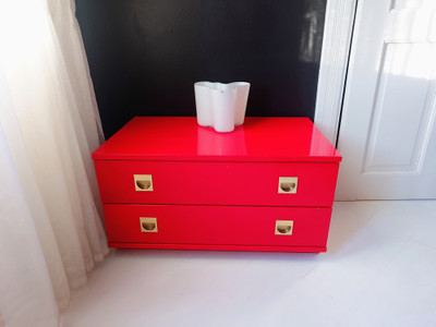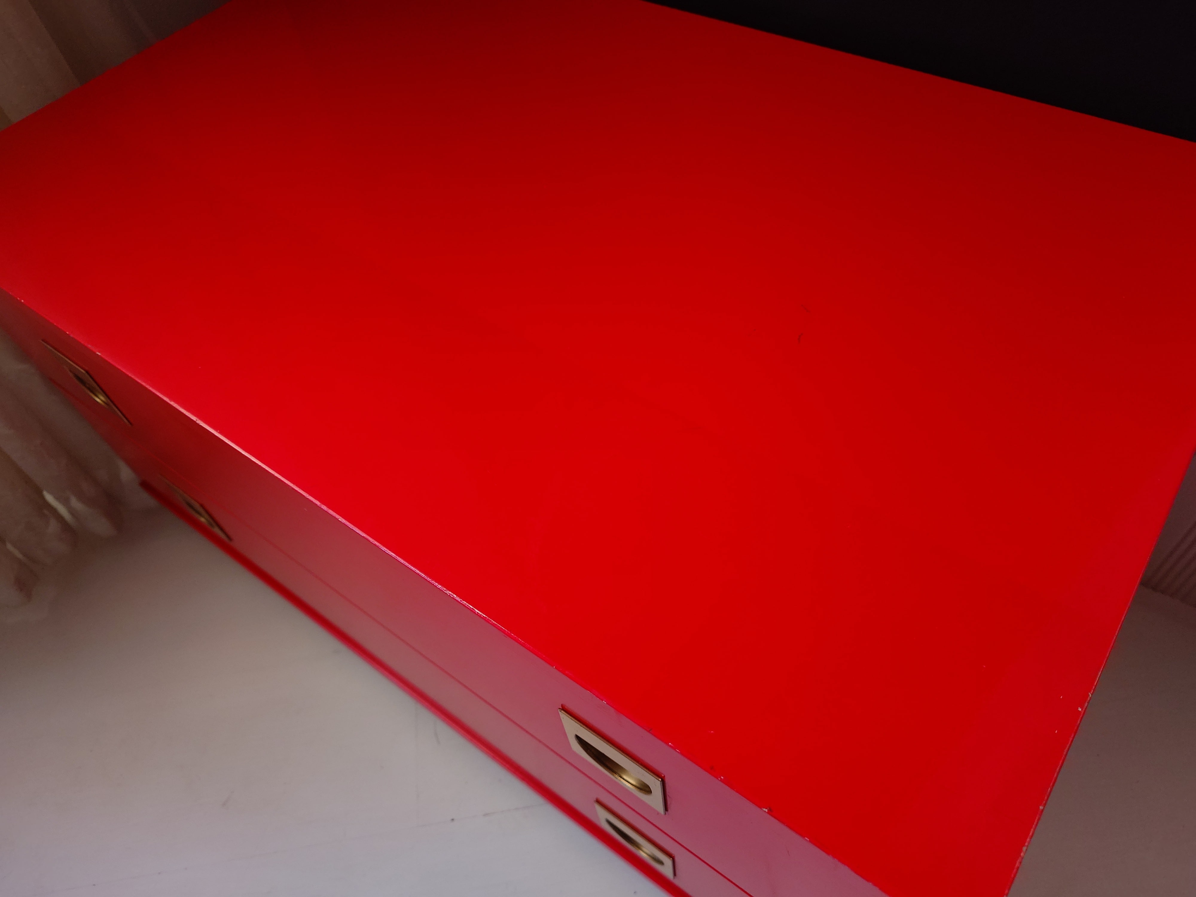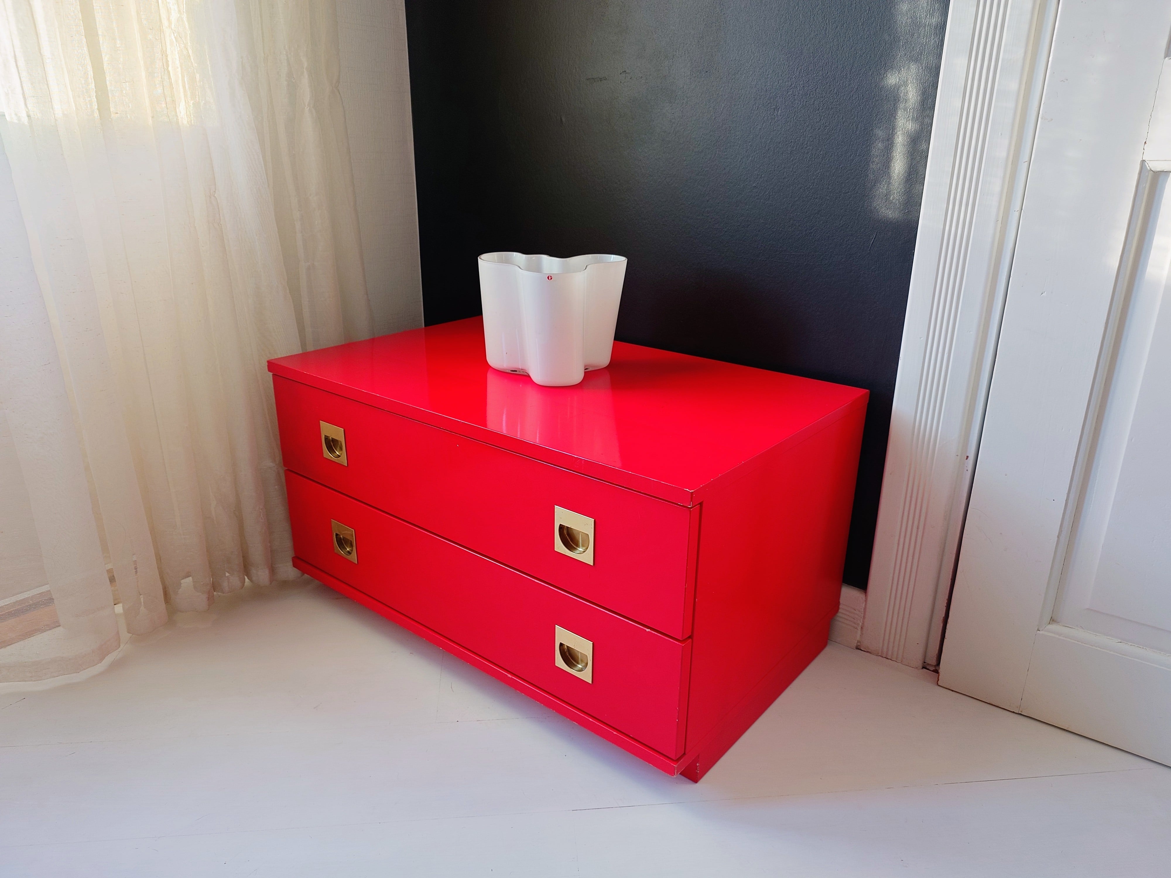 Retro kirkkaanpunainen lipasto, jossa on messingin väriset upotetut vetimet.