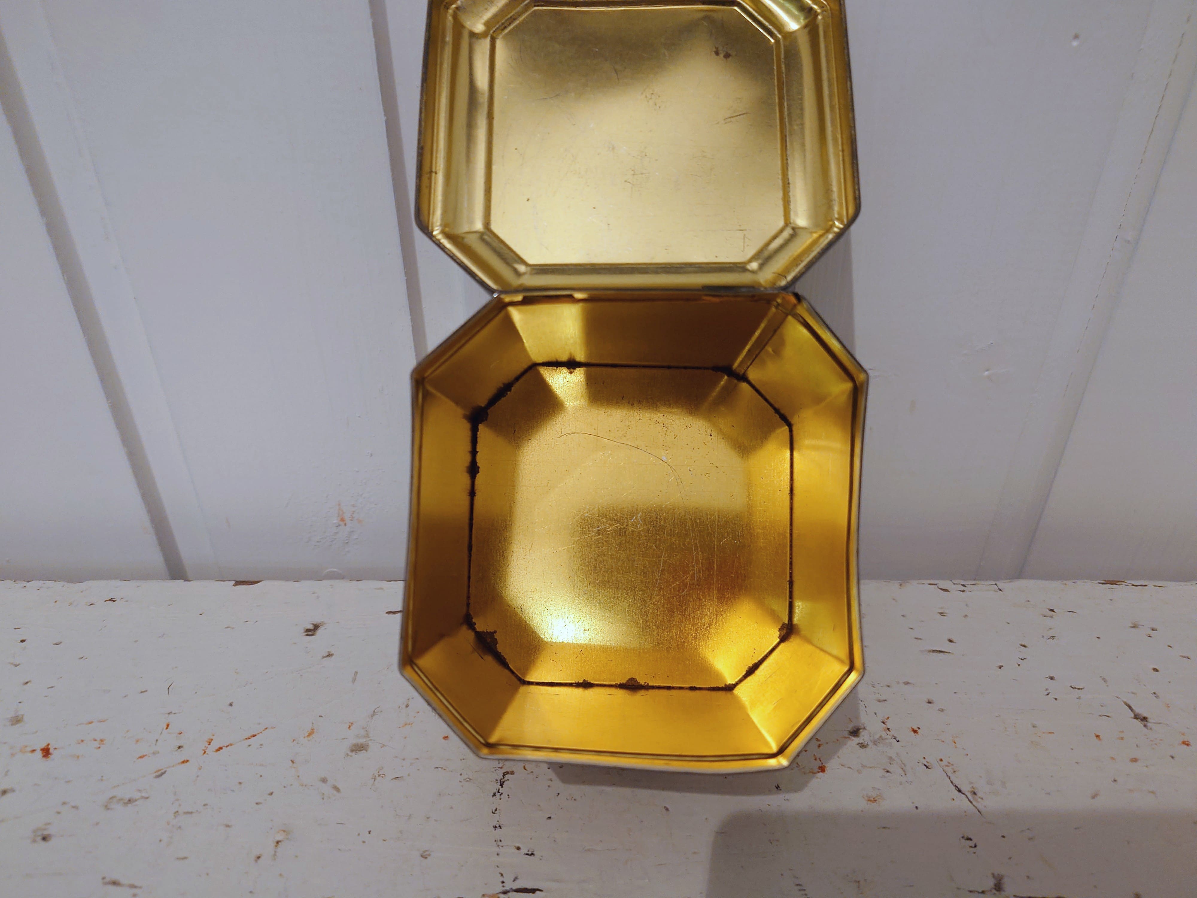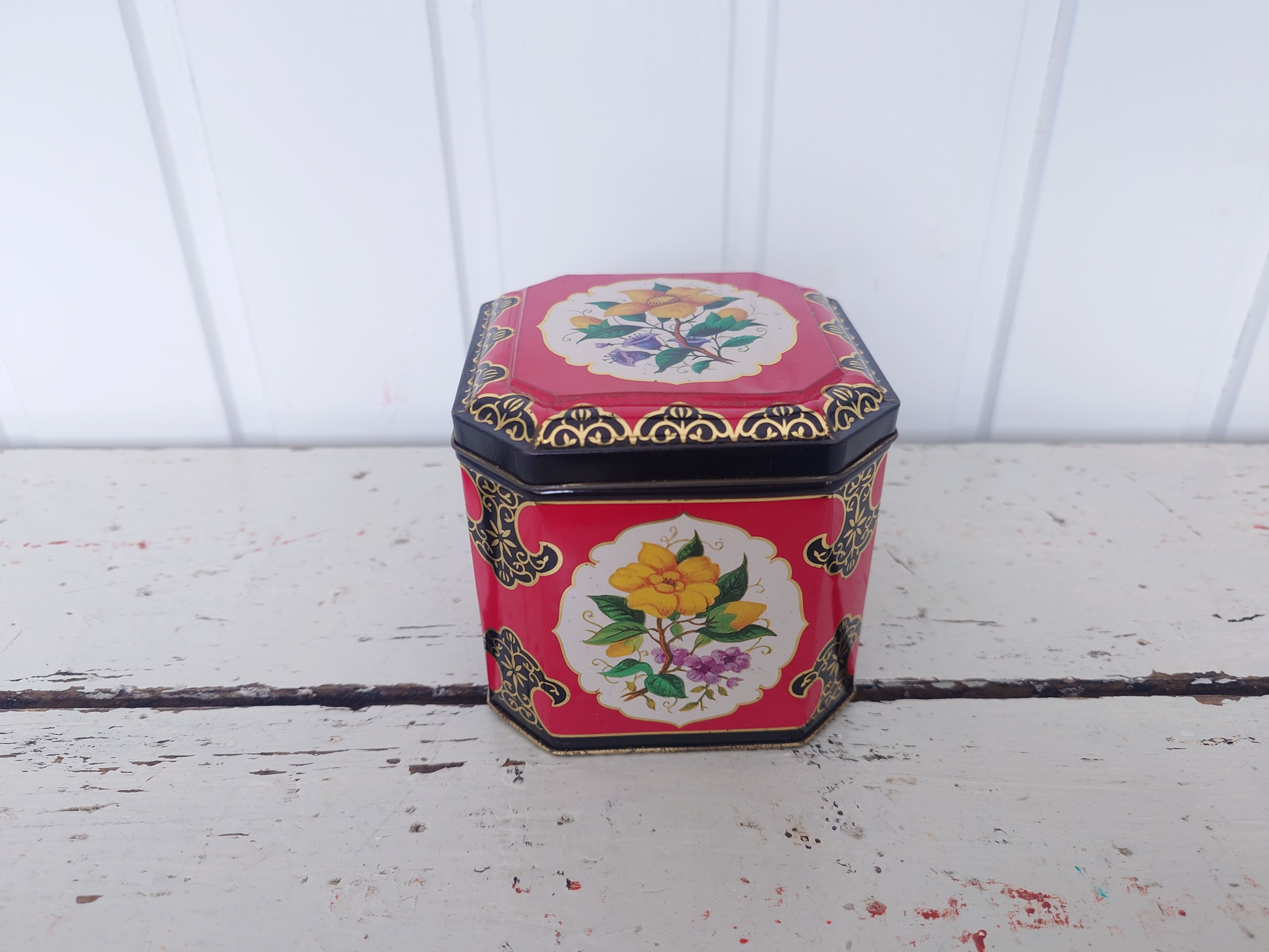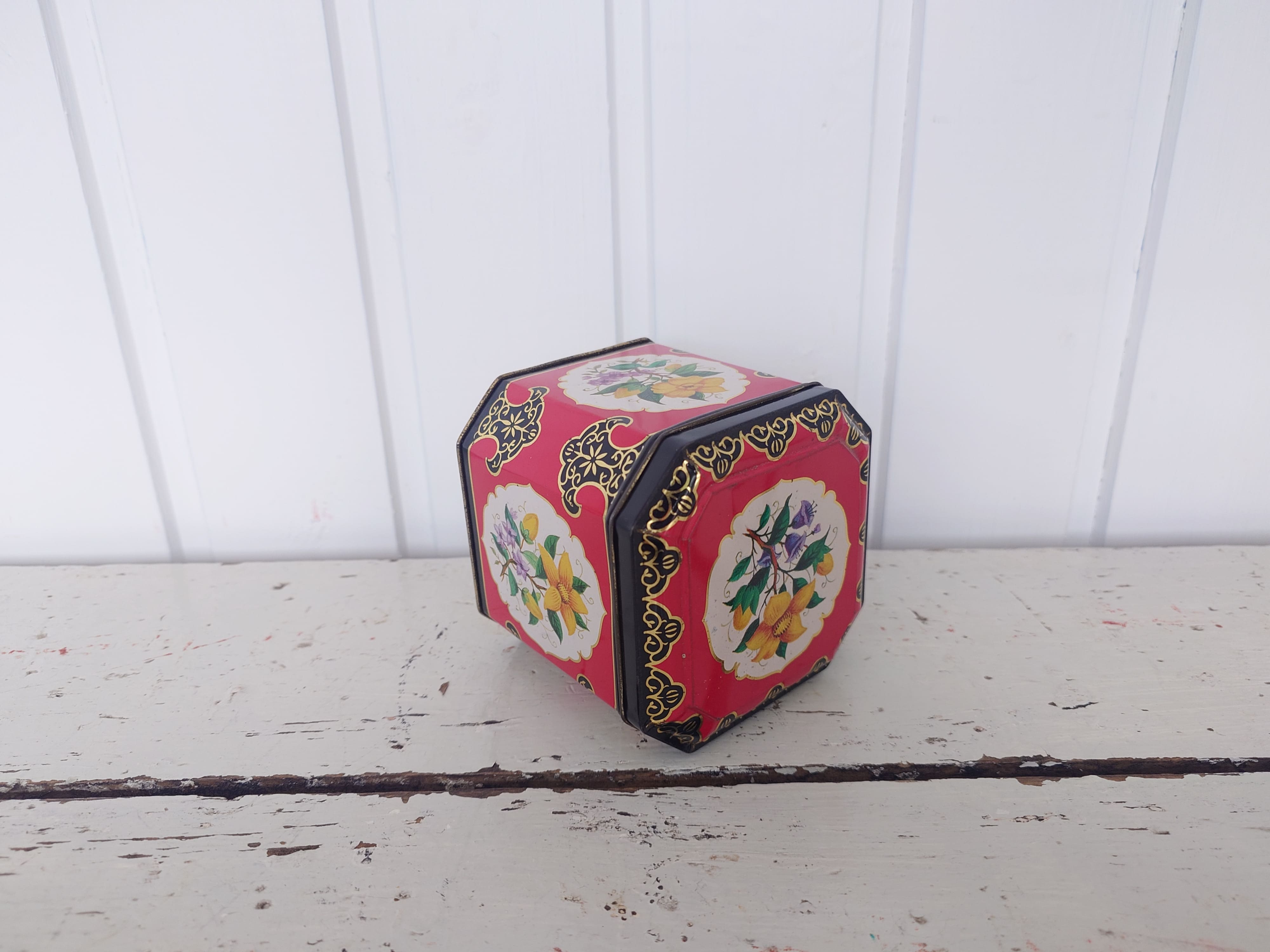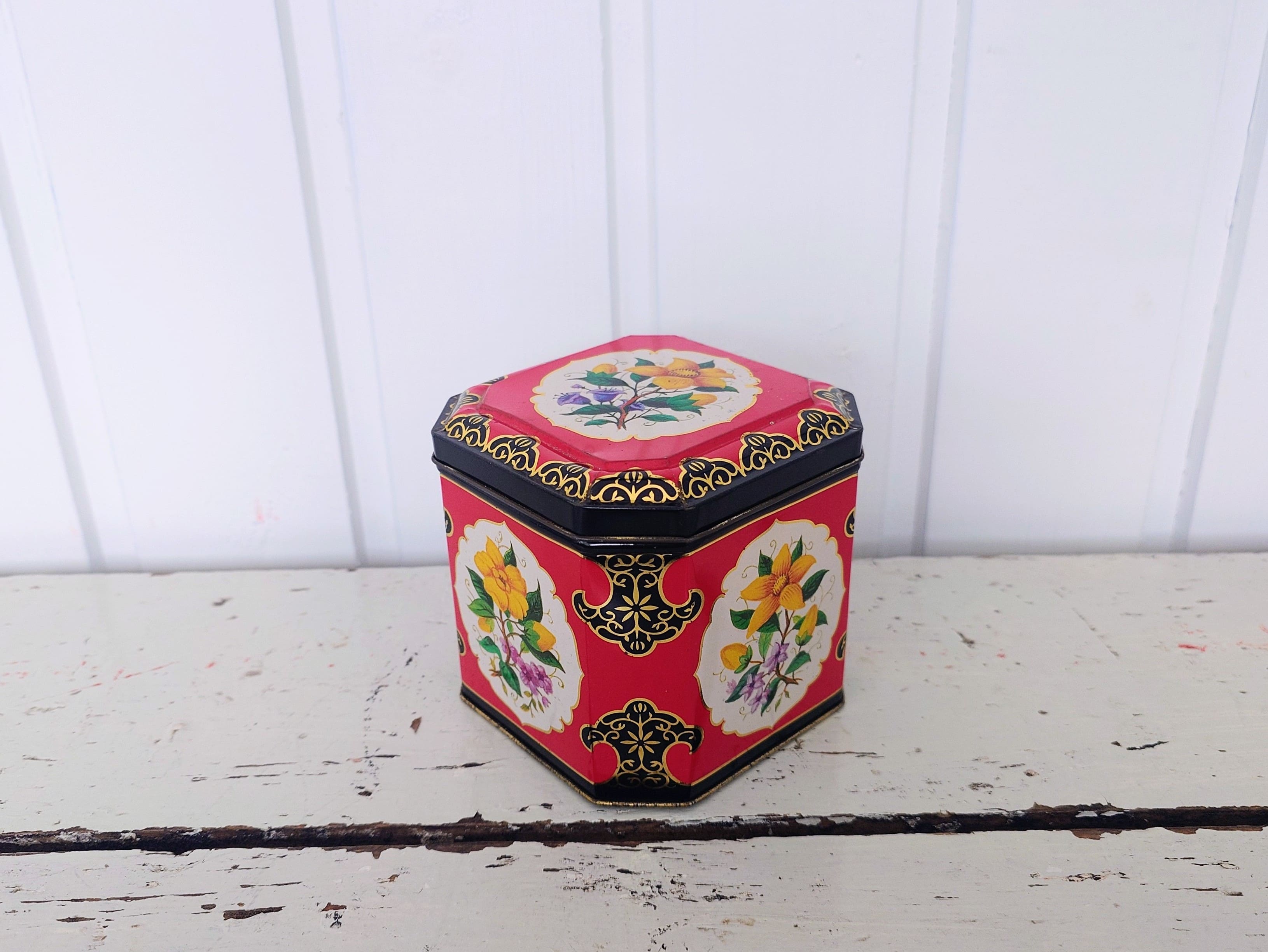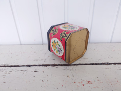 Punainen hyväkuntoinen englantilainen peltipurkki. Joidenkin tietojen mukaan olisi jopa 1950-1960 lukua.